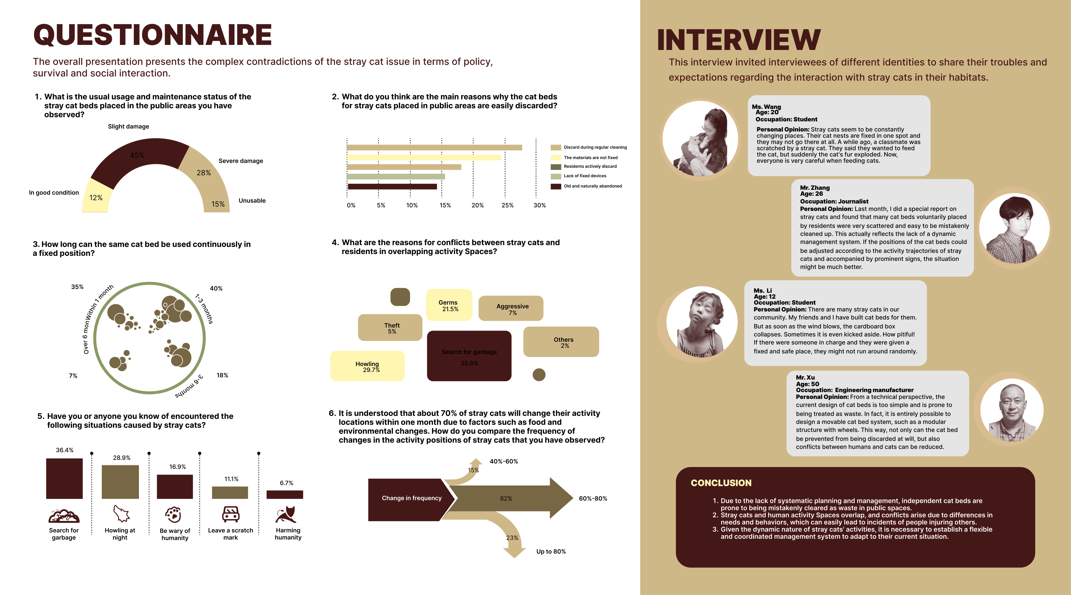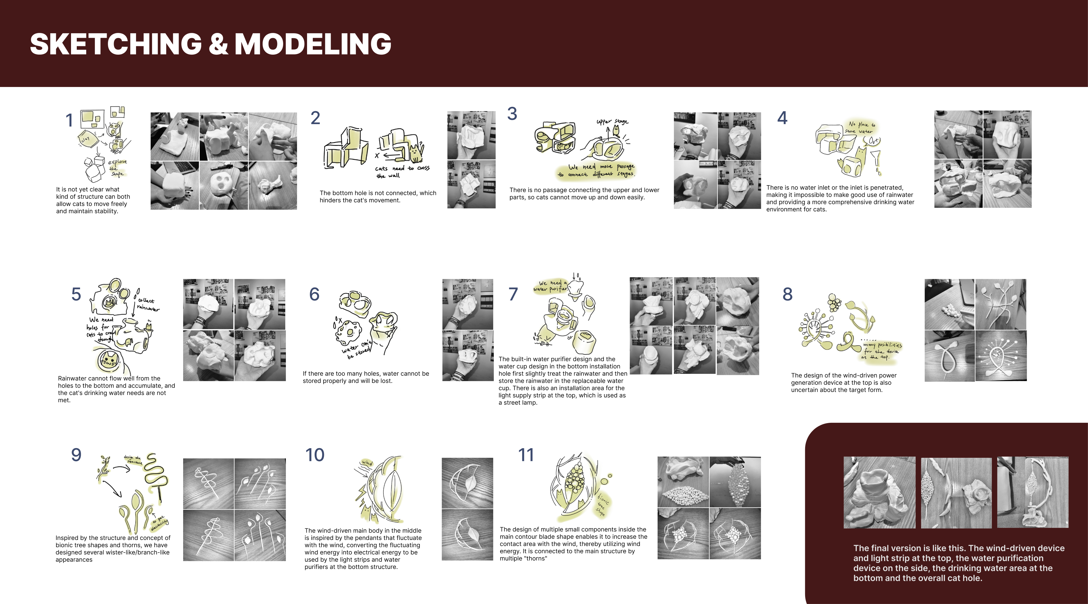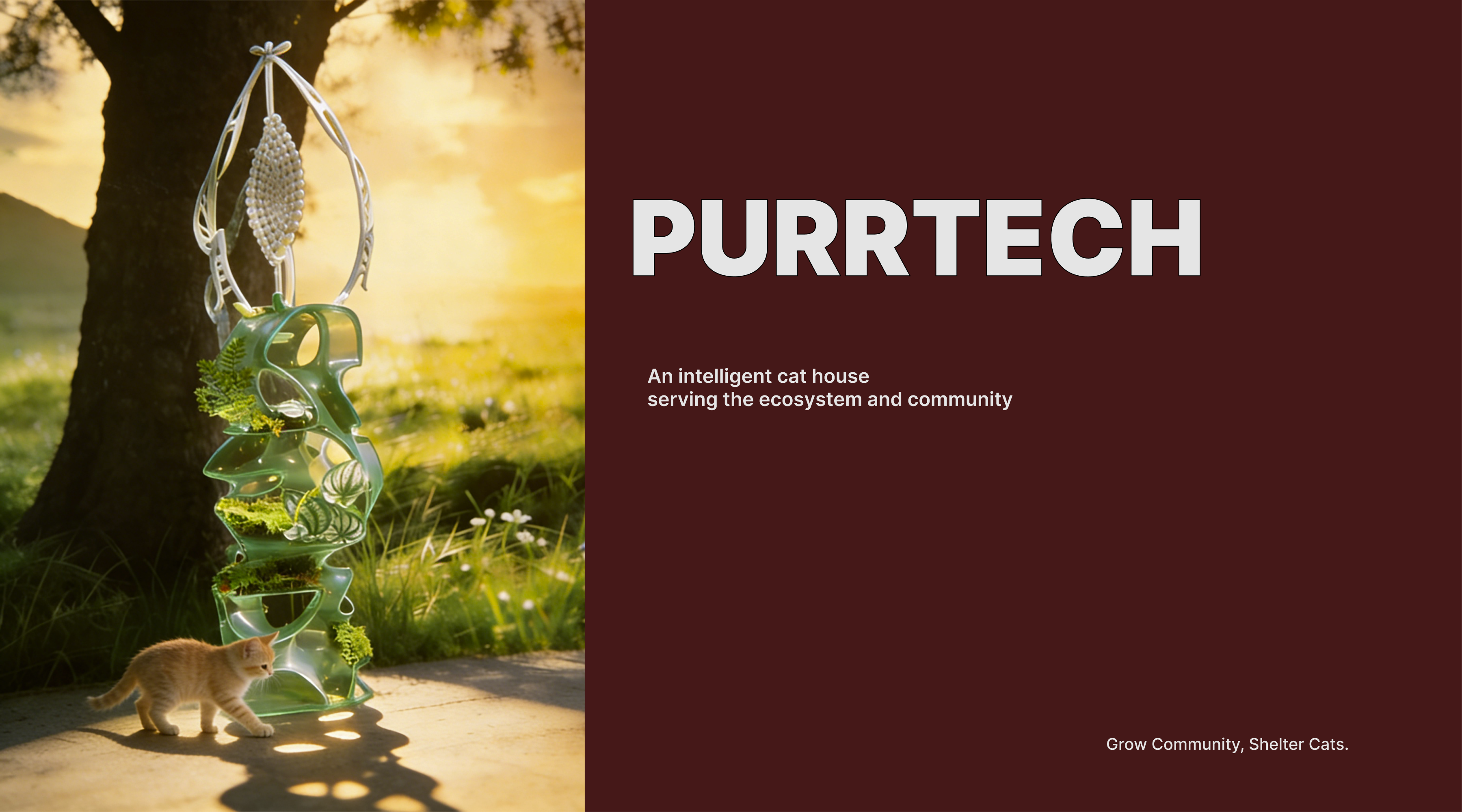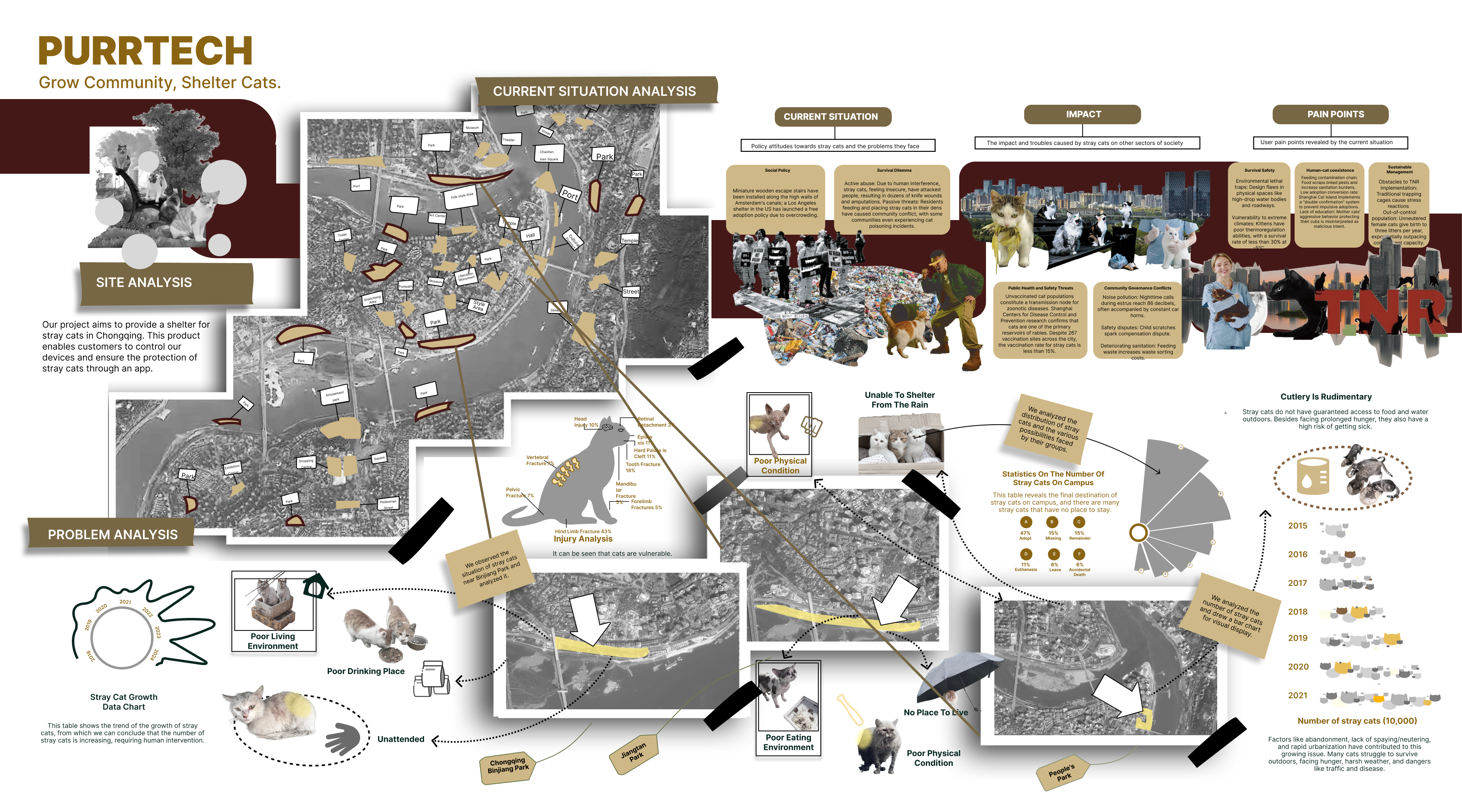 Straying cats in the city usually need to deal with problems of survival: from the absence of a secure habitat, to the lack of water and insufficient protection at nighttime. For the problem, a project of sustainable symbiosis is built and developed. It was born a green stray cat shelter, featuring a three-fold self-sufficientity in habitat, energy and ecological circle. It is furnished with a dedicated APP in order to create a caregiver system that supports the care of stray cats in various ways and reduces the threshold of urban pedestrians to engage in rescue activities. The main part of the shelter is made of environmental friendly composite construction materials. The modular structure with a variety of organic curves not only conforms to the behavior of stray cats in an environment where they love to crawl, curl up and lay down, but also gains good ventilation and shading through the hollowed out and curved design. The energy device is powered by the metal ring-shaped wind energy component above, using wind power as a source and providing electricity to the light strips that can use flexible placement on the inner side of the shelter. rainwater is pumped into the top of the water storage area. The rainwater is first filtered to clear the polluted water and then flows down the roof of the shelter through the low-level outlet where stray cats go to take a drink, realizing the recycling of rainwater resources. The device is high above with local green flowers such as moss and ferns, which not only enhances the microclimate, but also filters impurities. The dedicated APP can link people and machine interaction and care: people can use the APP to seek out nearby shelters and remotely turn the status of the device on and off. At the same time, the APP is also equipped with an internal science popularization section for feeding and caring for stray cat health. It minimizes interactive errors. An adoption information board has been set up to make the shelter go from a barebones survival to a comprehensive care vehicle with a combination of rescue, science/popularization and adoption. This project is not least an ecological embodiment of the threefold self-sufficiency of hardware and the digital linkage of software, which are not only used to create a sturdy environment for stray cats but also to open the door to the activity of urban pedestrians in care activities with low thresholds, realizing the soft coexistence of humans, animals and the urban environment.