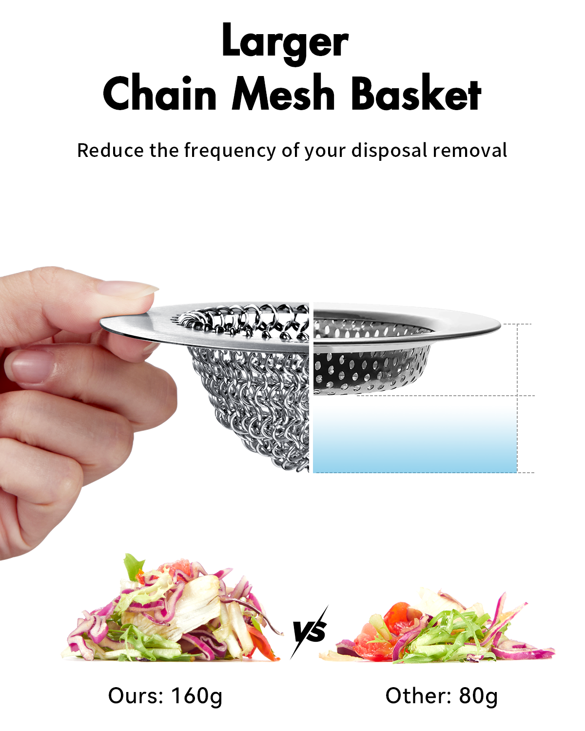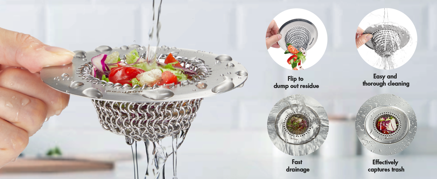 More than just a kitchen accessory, this stainless steel sink strainer is a smart solution for cleaner, more efficient daily routines. Inspired by medieval chainmail, its flexible, interlinked mesh pocket flips effortlessly inside-out—just invert and tap to release food scraps, coffee grounds, tea leaves, or vegetable peels without ever touching the mess. Made from premium 304 food-grade stainless steel, it resists rust, withstands high temperatures, and won’t warp over time. Even better, it’s fully dishwasher-safe, eliminating the need for tedious hand scrubbing and saving you valuable time. Thanks to its intelligently engineered open-weave structure, water flows freely even when the strainer is full, preventing slow drainage, standing dirty water, or unpleasant odors during dishwashing or food prep. Designed to fit standard sink drains in both kitchens and bathrooms, it works quietly but effectively to protect your plumbing from clogs and costly repairs. With its sleek, minimalist finish and thoughtful functionality, this strainer blends seamlessly into any modern home—offering hygiene, convenience, and peace of mind in one compact, essential tool.