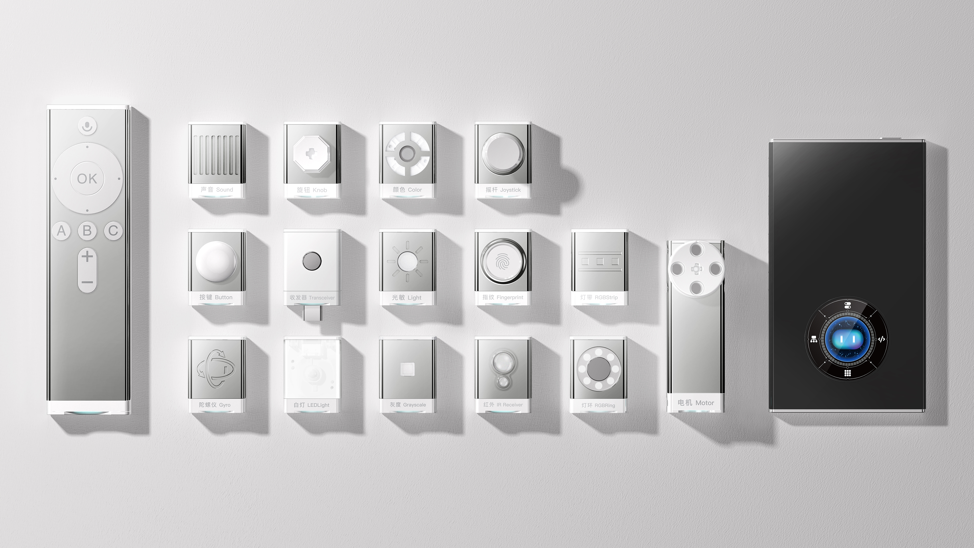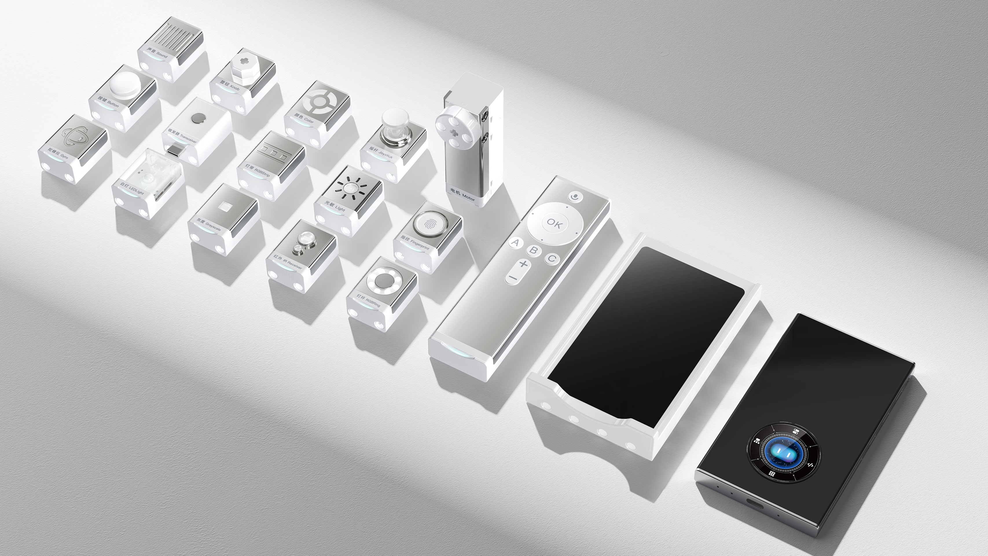 The Xinghan Intelligent Suite adopts a modern industrial aesthetic language, featuring a primary color scheme of black, white, and gray. Its clear and rational modular layout aligns with the aesthetic preferences and cognitive development needs of adolescents. The ultra-thin 10mm host supports magnetic docking and brick-style expandable design, enabling flexible assembly and stable connections. The suite allows parallel connections of up to 8 modules without distinguishing between interface types. Its Bluetooth wireless expansion enhances system flexibility and openness.