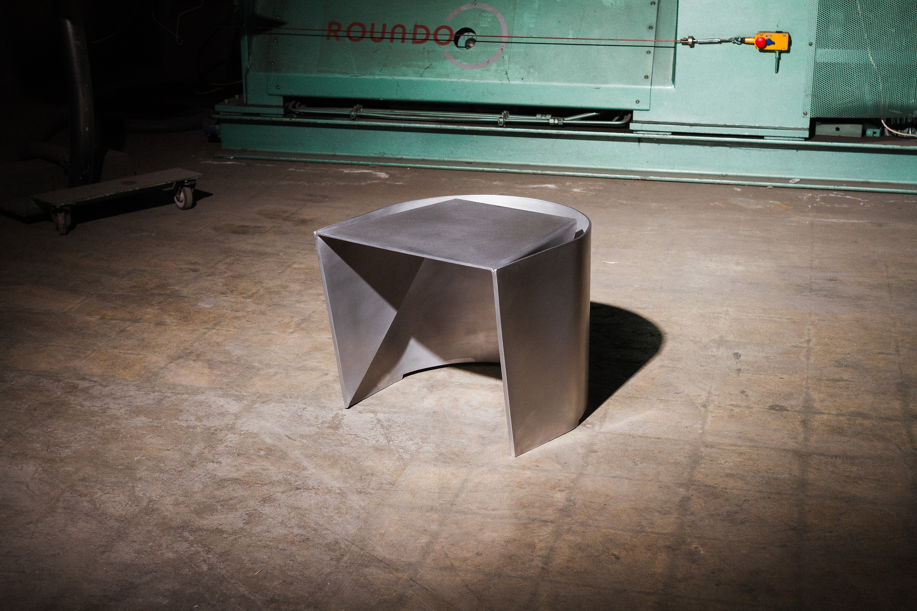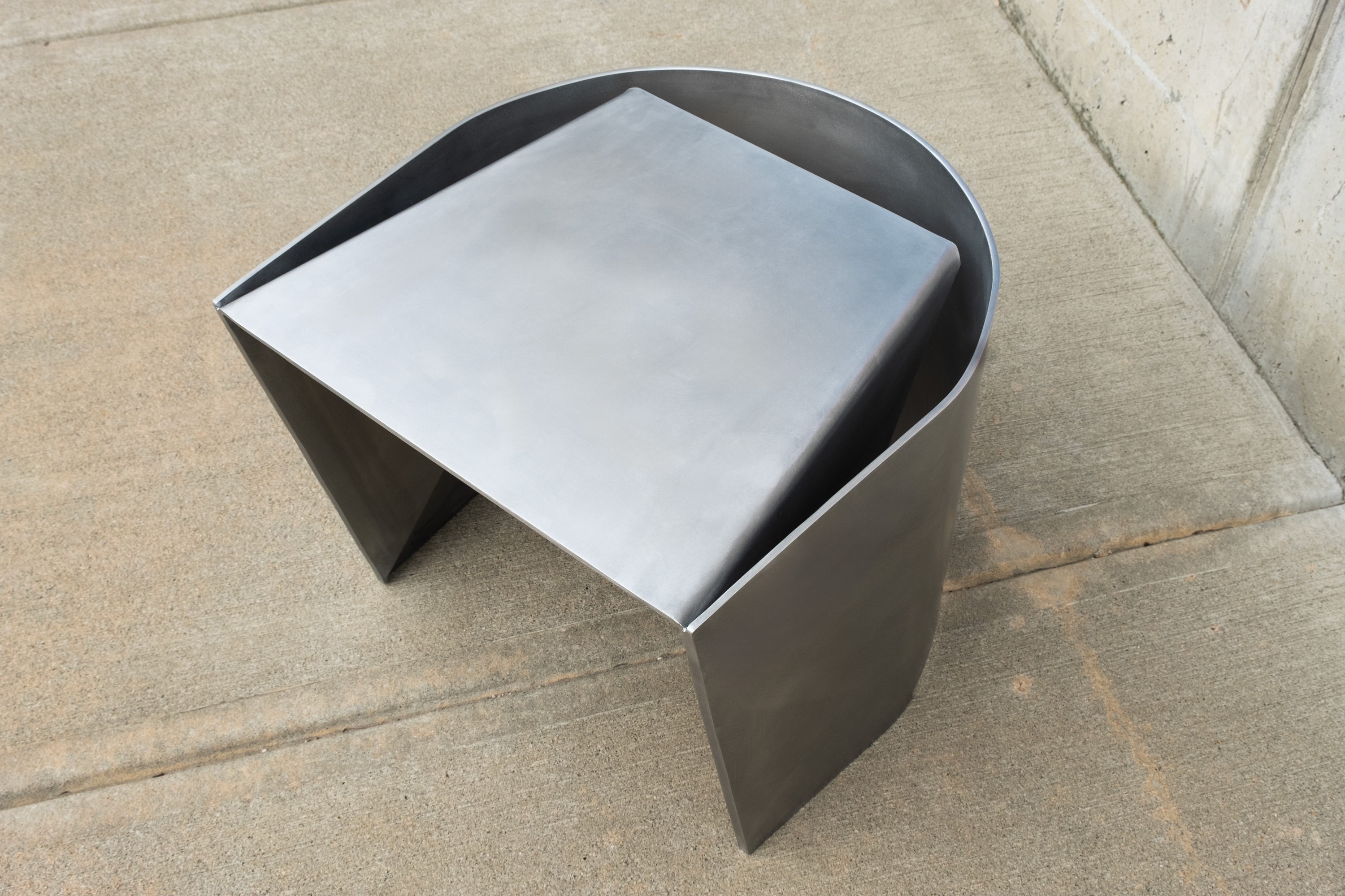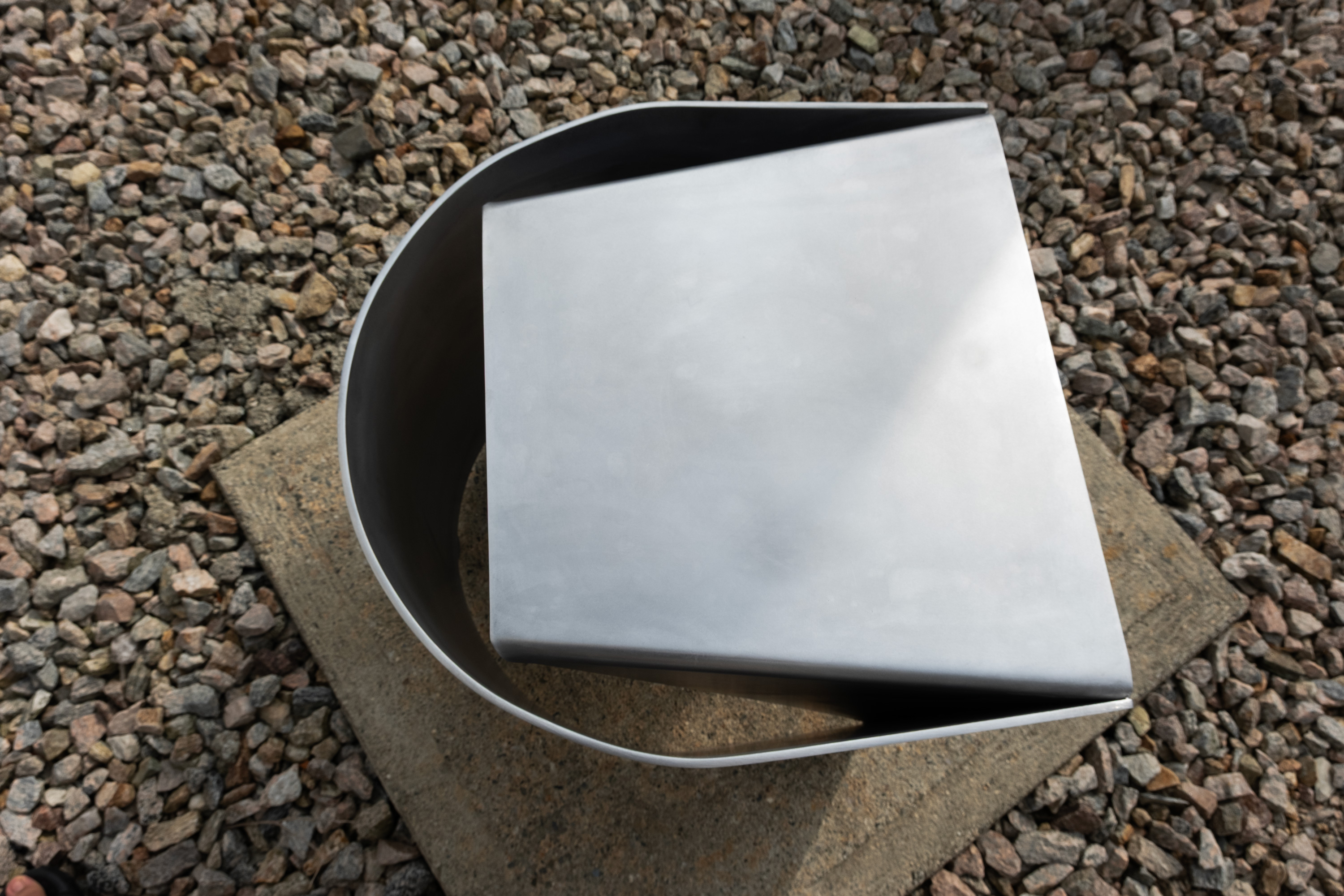 Uni was inspired by origami, which often uses folds to create multi-dimensional planes from only one flat surface. Its singular, continuous form creates an illusion of folding a single aluminum sheet into a dimensional, freestanding object. Uni merges conceptual duality—the exterior and the interior. It elegantly unites a functional tabletop and a supporting bottom.