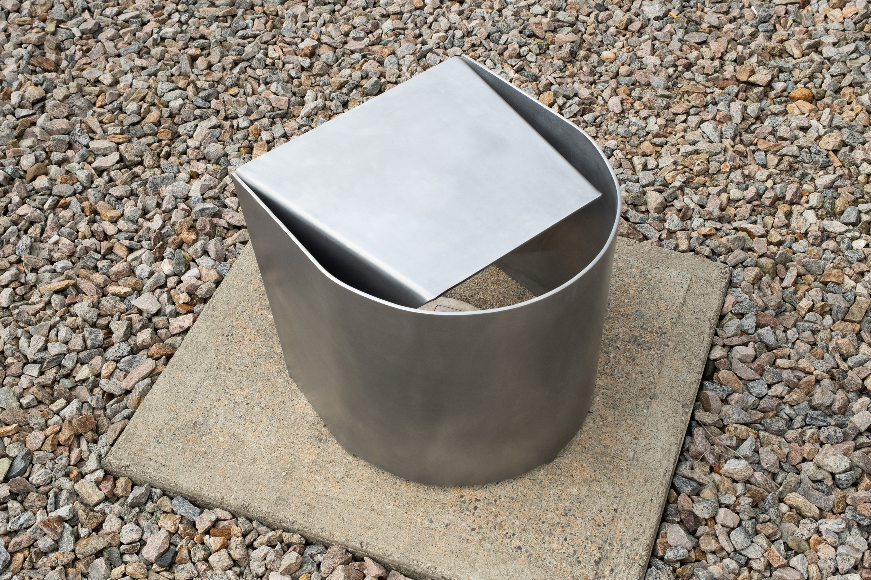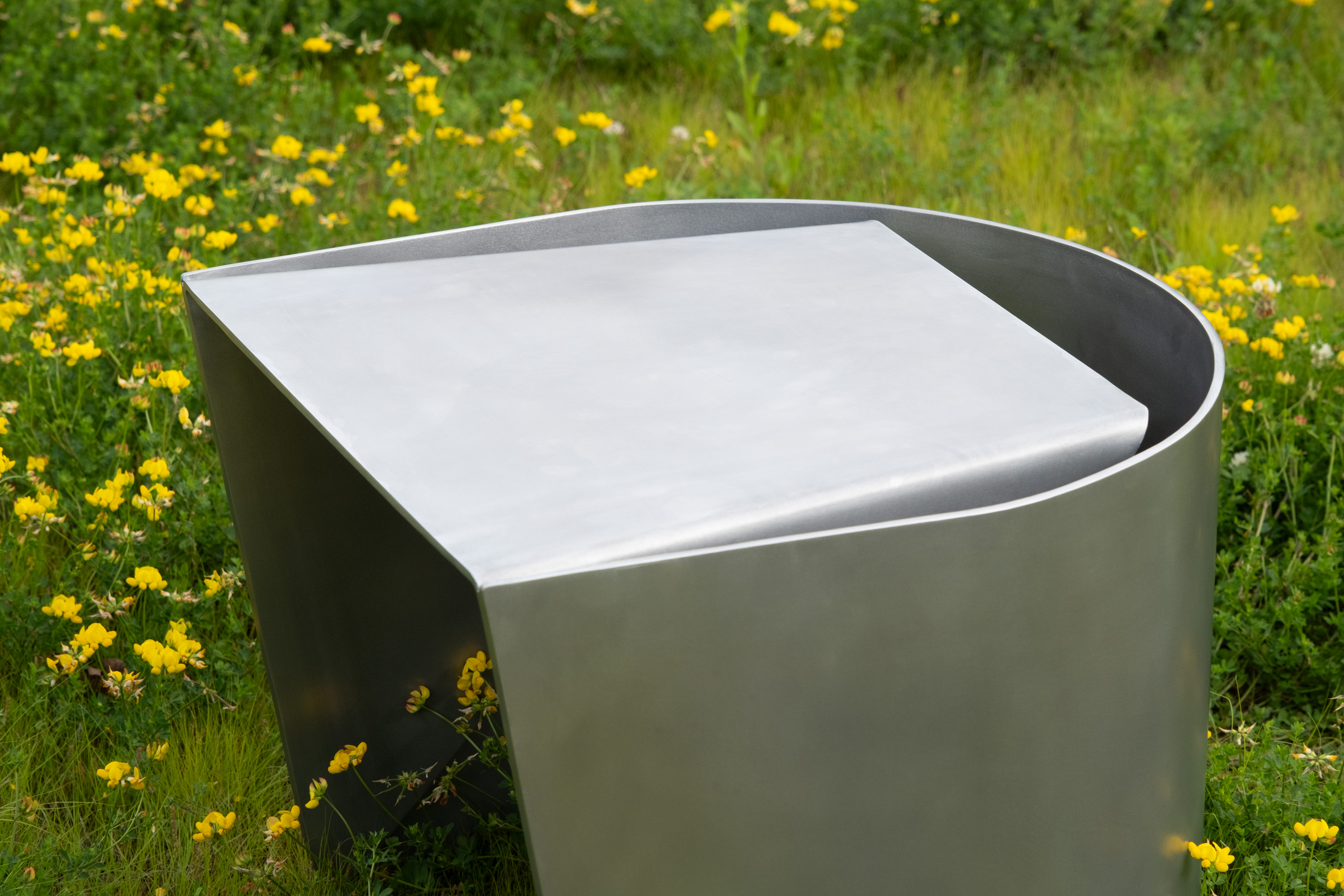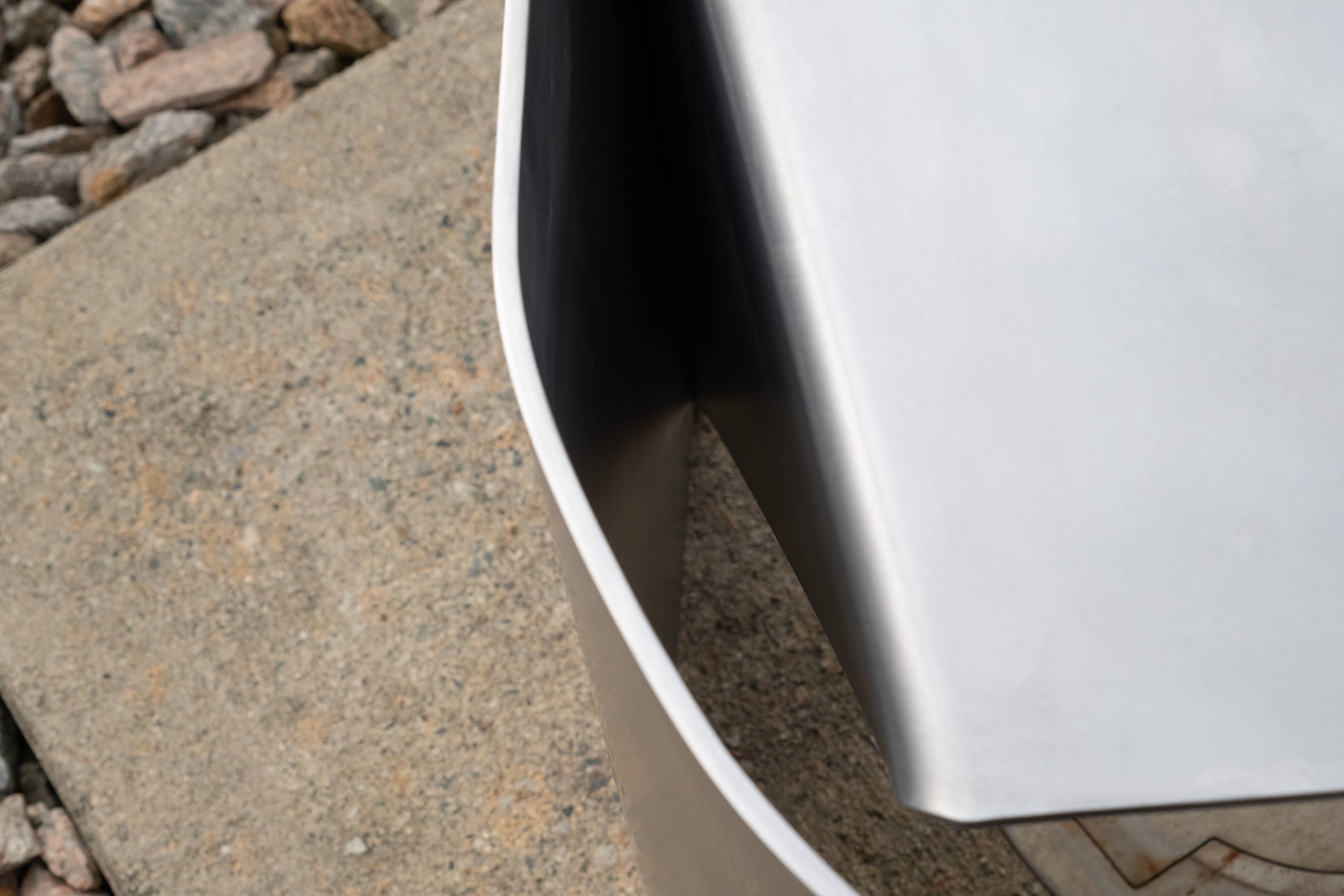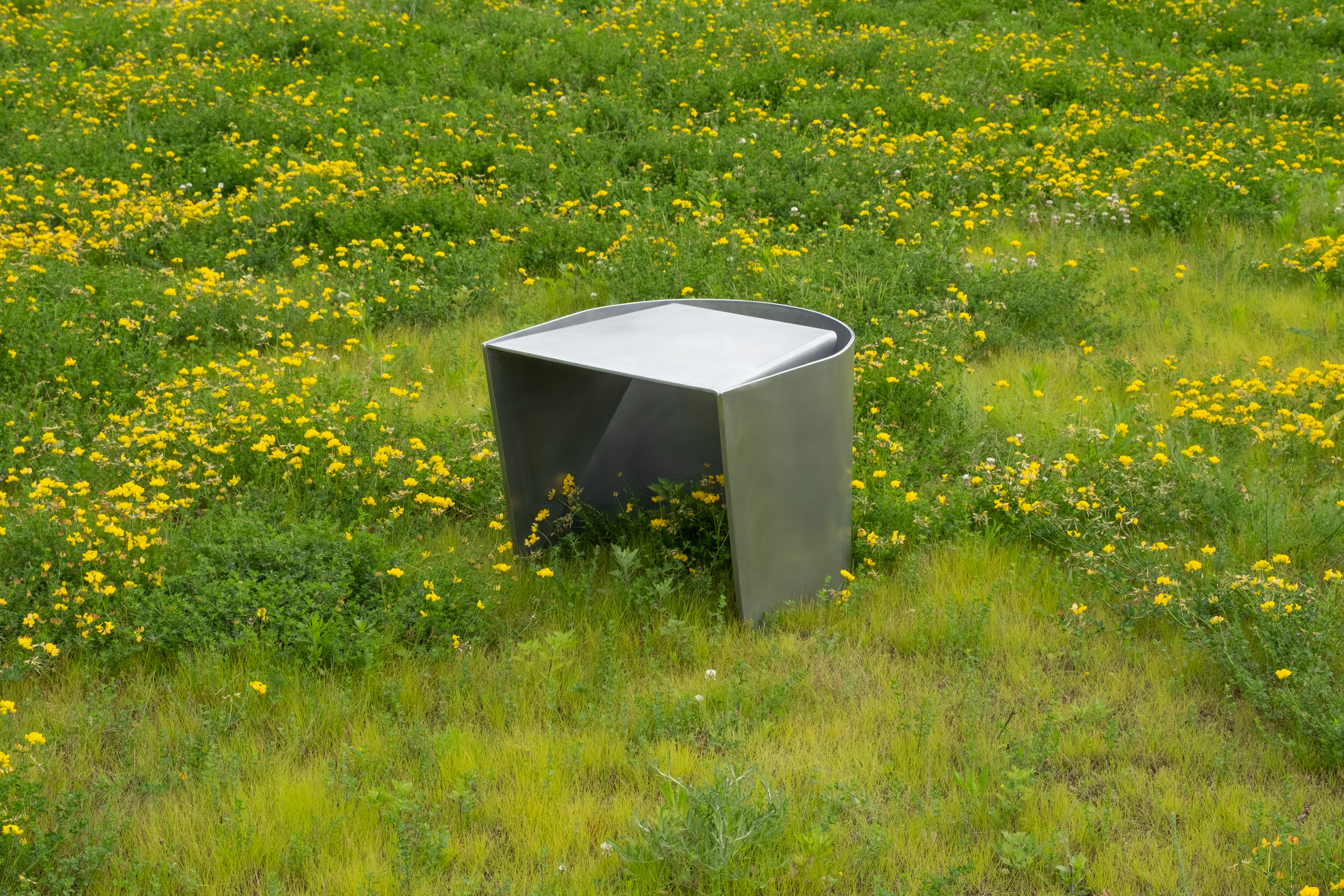 Uni was inspired by origami, which often uses folds to create multi-dimensional planes from only one flat surface. Its singular, continuous form creates an illusion of folding a single aluminum sheet into a dimensional, freestanding object. Uni merges conceptual duality—the exterior and the interior. It elegantly unites a functional tabletop and a supporting bottom.
