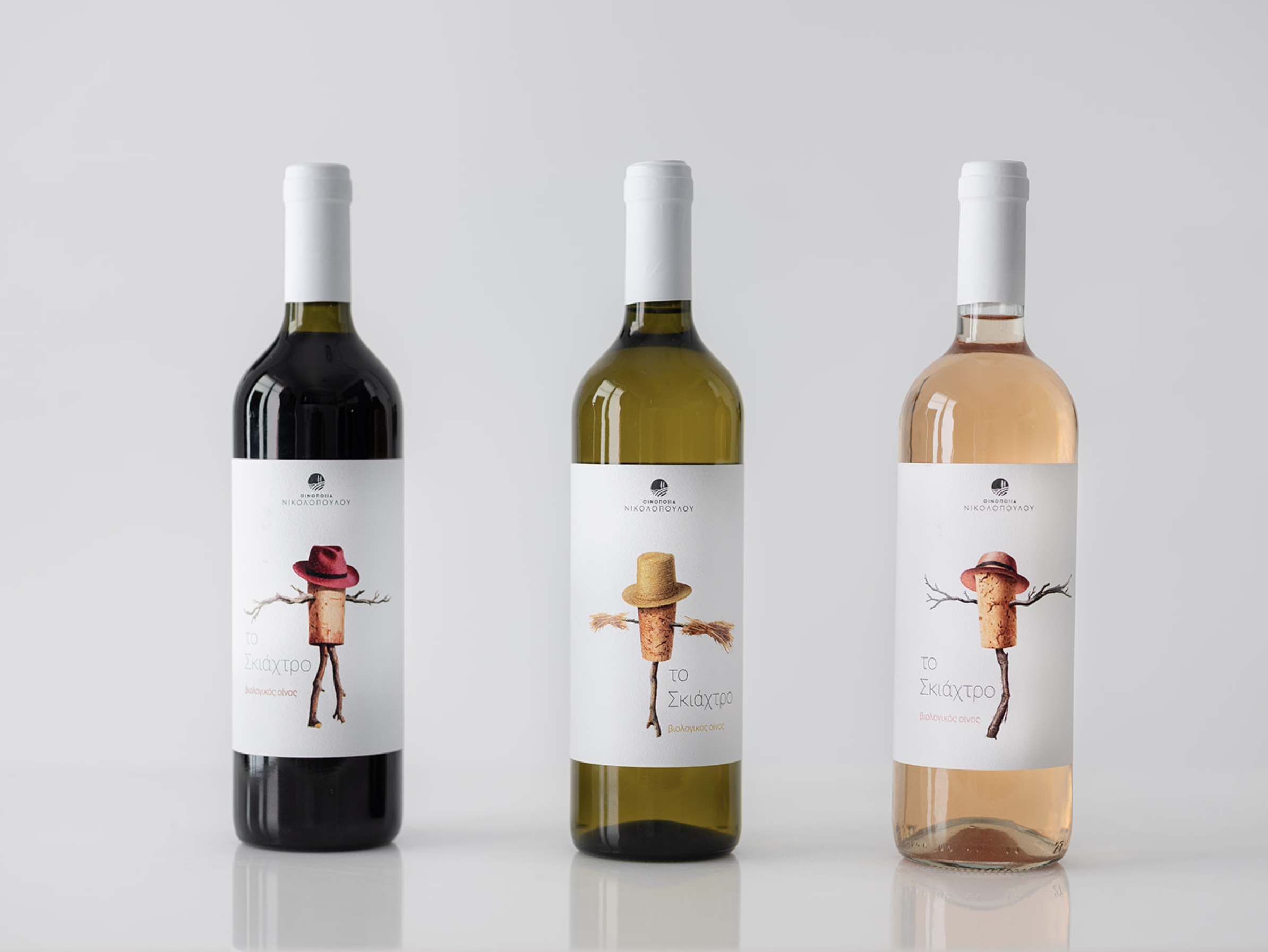 This project presents a cohesive wine label series for three wine expressions—red, white, and rosé—under the shared name “Το Σκιάχτρο” (The Scarecrow). The concept is built around storytelling, character, and subtle humor, transforming a familiar rural symbol into a distinctive brand icon.