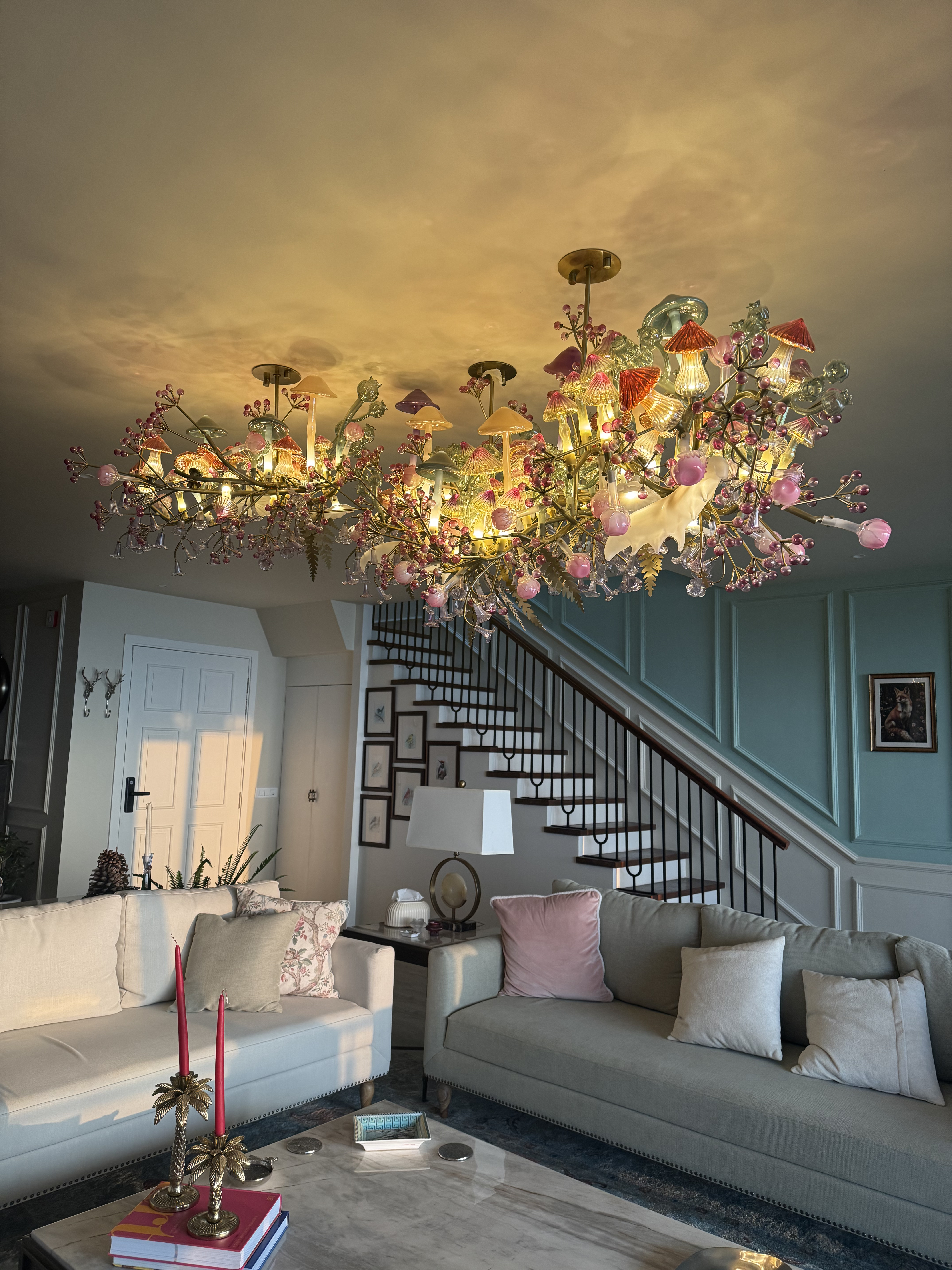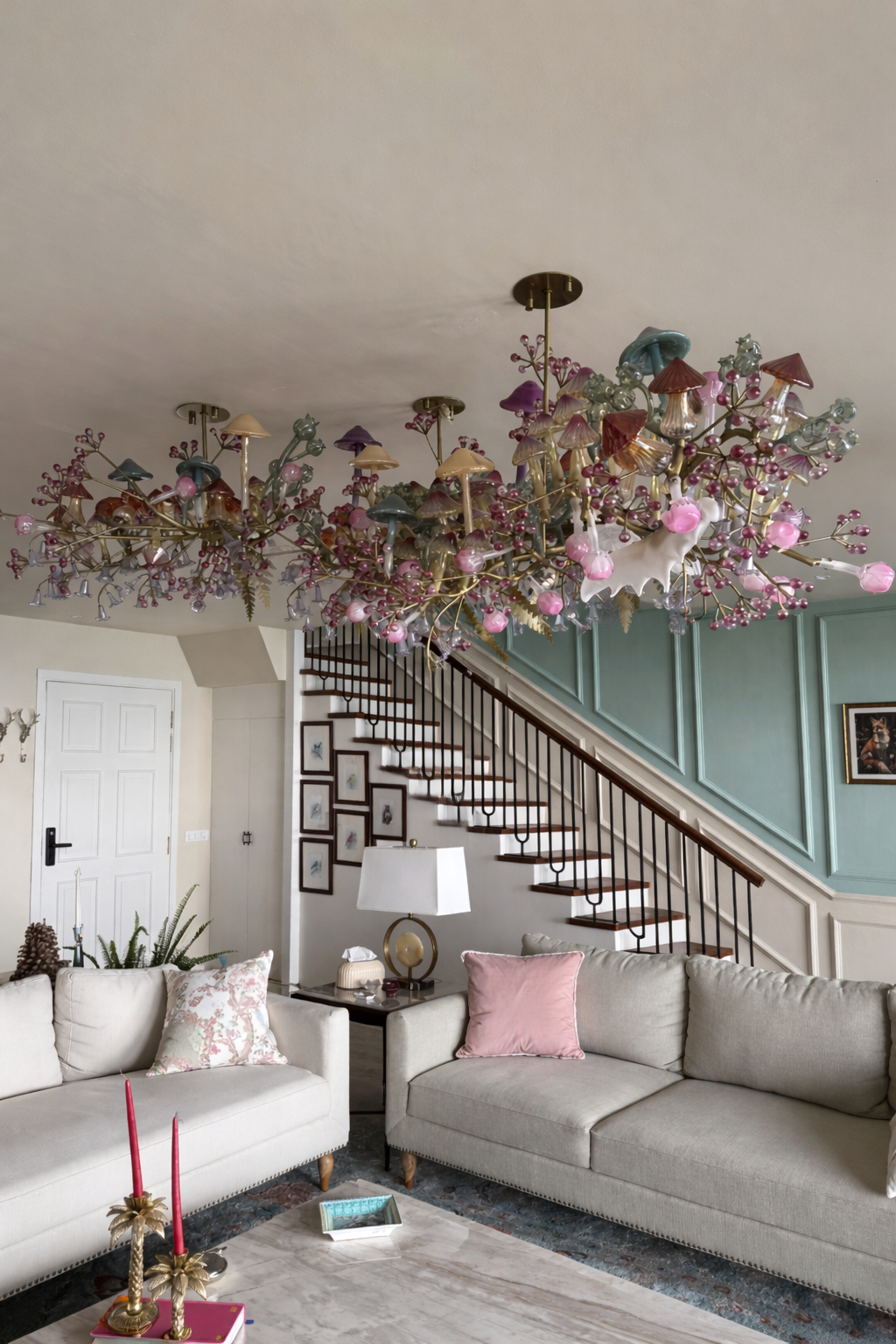 The chandelier weaves together delicate glass blooms, soft mushroom-like forms, branching metal elements and flowers, echoing nature in a refined, contemporary way. It's linear composition allows it to stretch across the room gracefully, complimenting the proportions of the seating area and aligning with the architectural lines of the staircase and panelled walls.