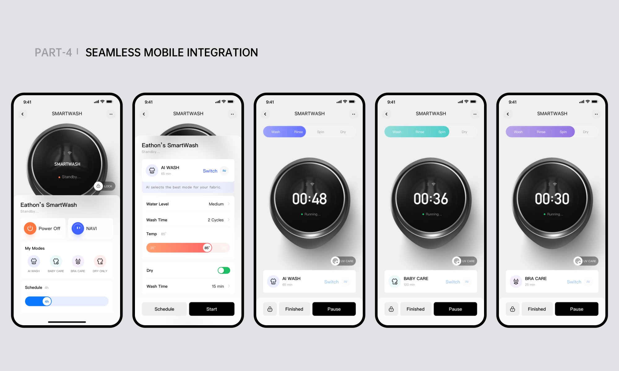 SmartWash AI is designed to address these issues through a more intuitive, user-centered interaction system. Core functions—including Standard Wash, Quick Wash, Drying, Baby Care, Bra Care, and AI Wash—are reorganized into a clear and streamlined interface, allowing users to quickly understand available options and the current washing status. Key information during the washing process is visually highlighted, effectively reducing cognitive load and improving overall usability.
