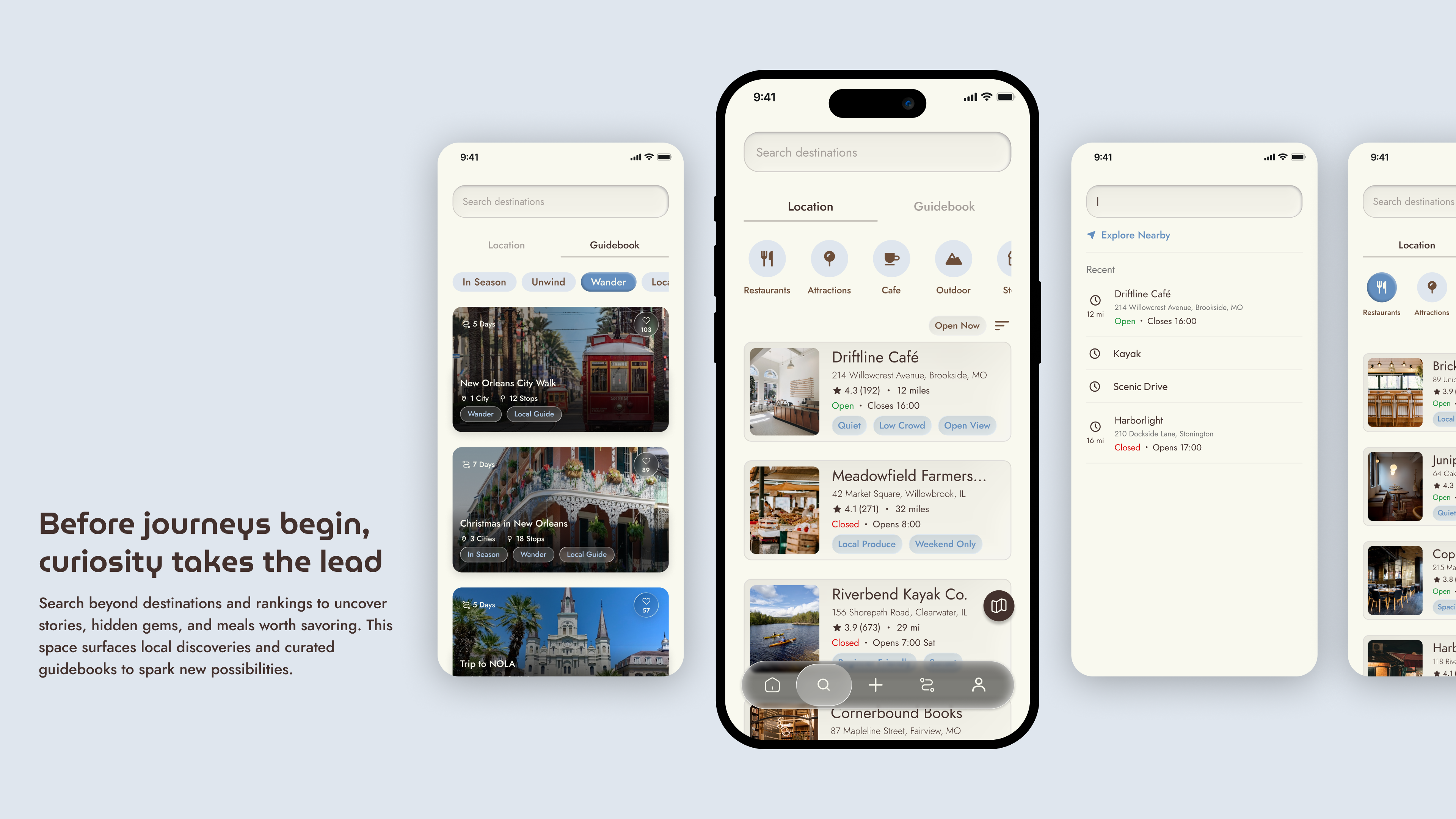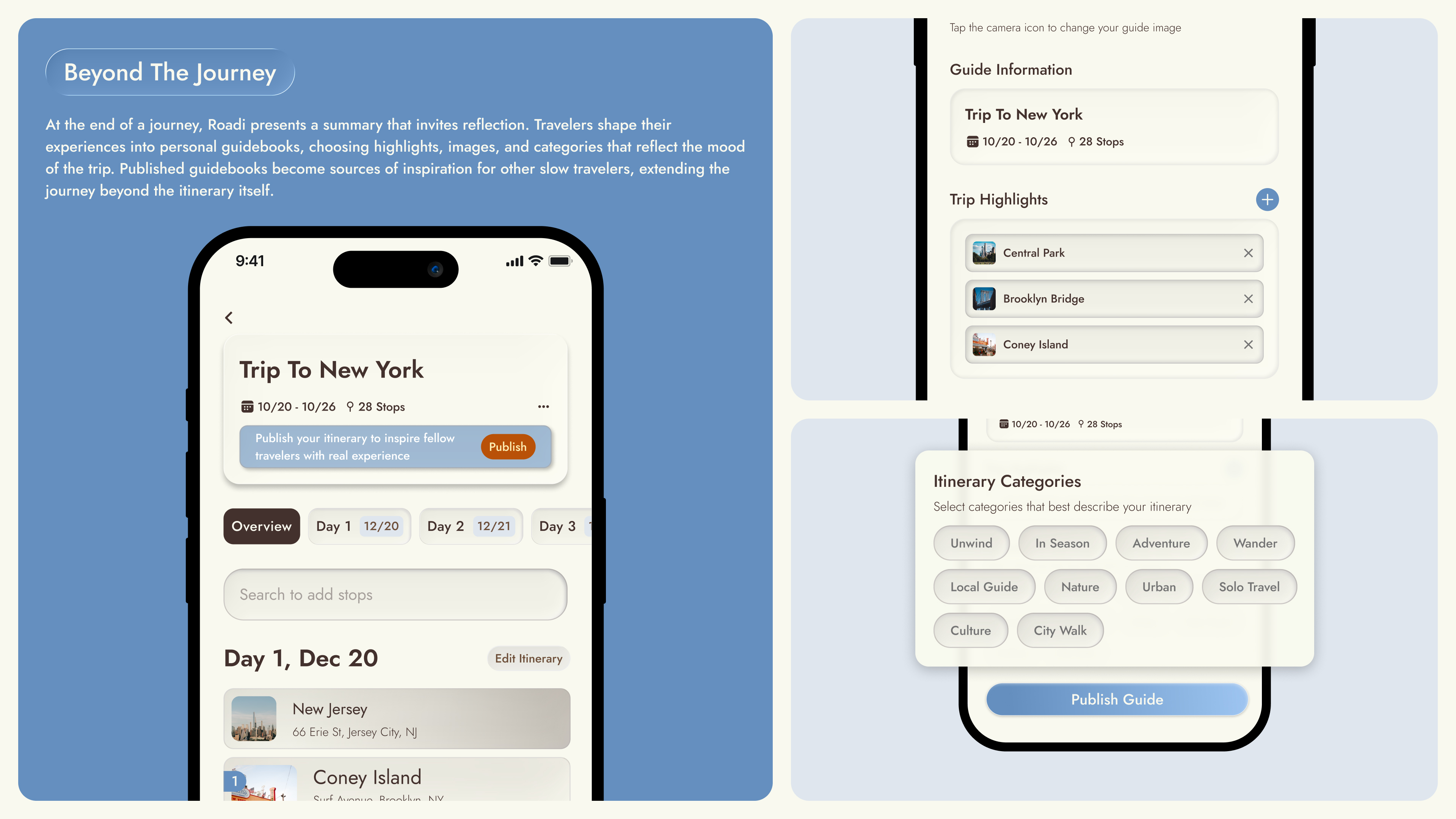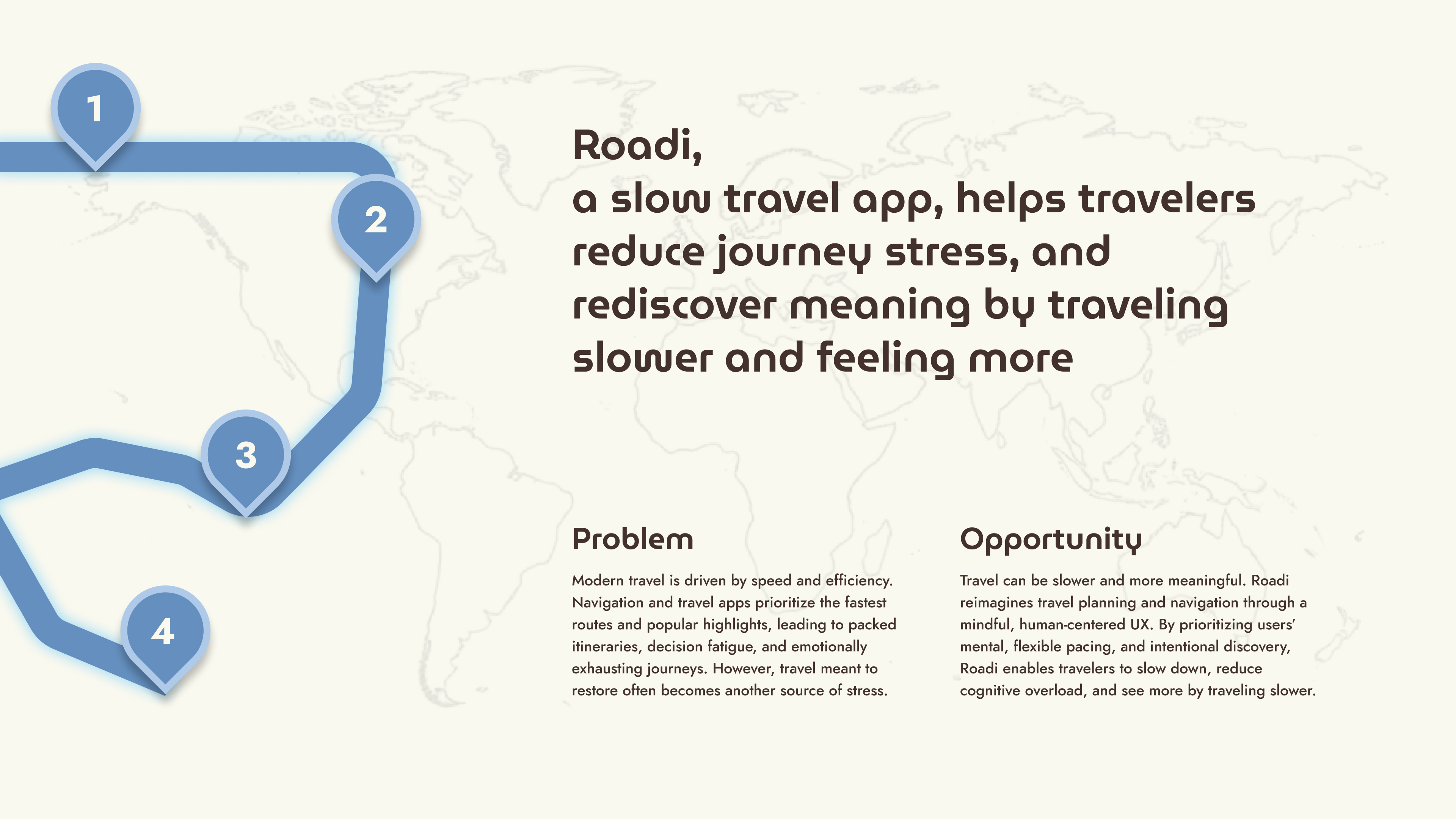 Roadi is a mobile app designed for people who seek slow travel, travel that prioritizes emotional well-being, presence, and genuine connection over speed and quantity. Instead of encouraging users to go farther, faster, or to more places, Roadi invites travelers to slow down, stay present, and experience more through fewer, more meaningful moments. Roadi rethinks travel navigation through a psychological and experiential lens, asking a different question: How can a journey feel calmer, more intentional, and more restorative?