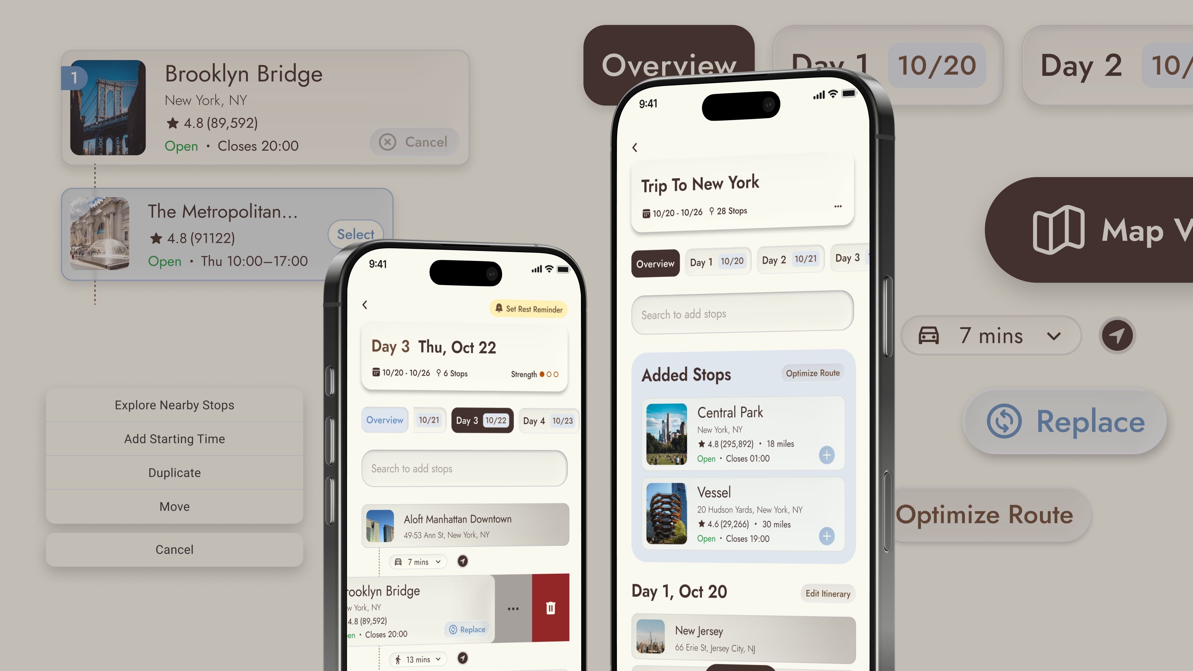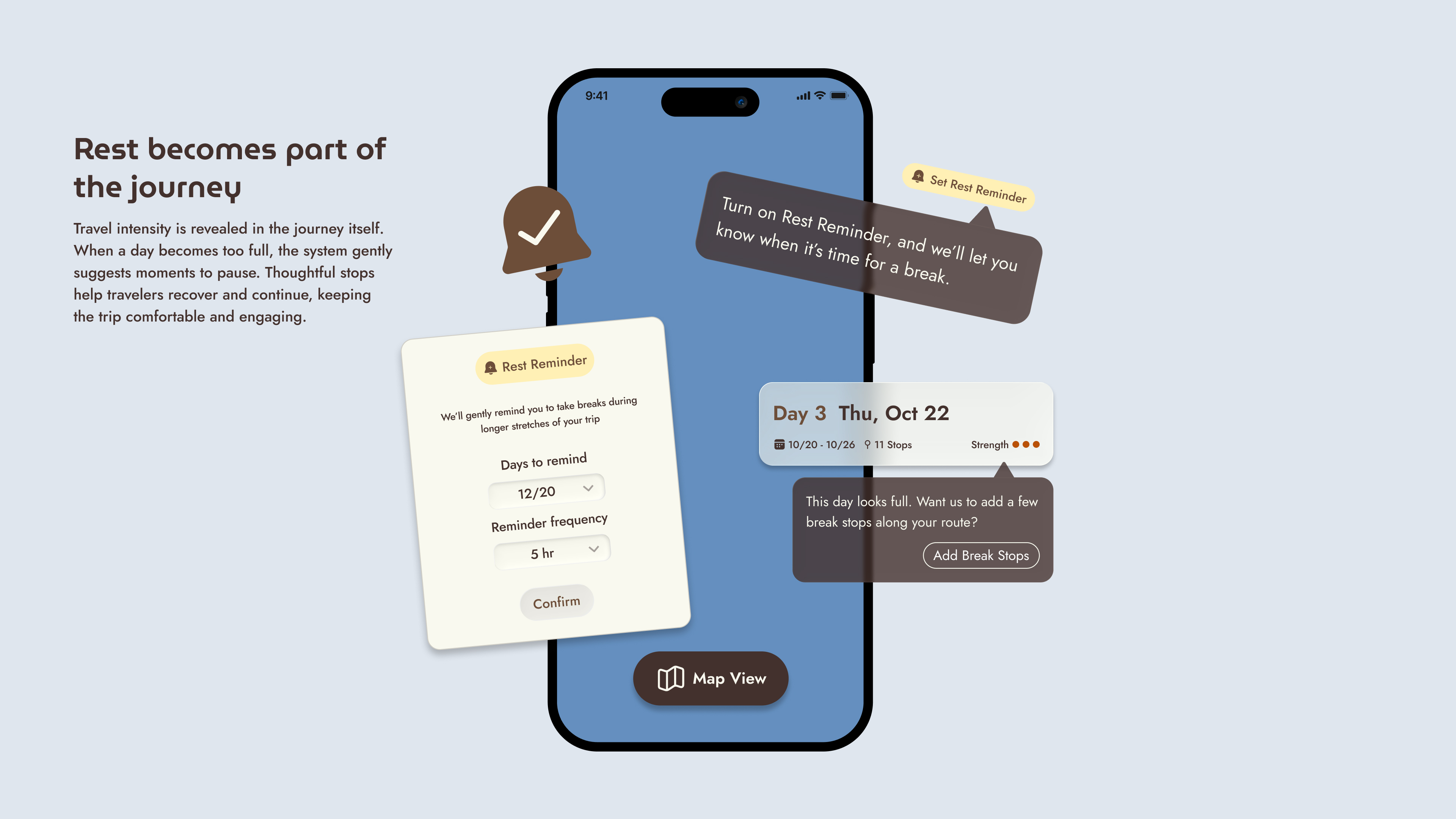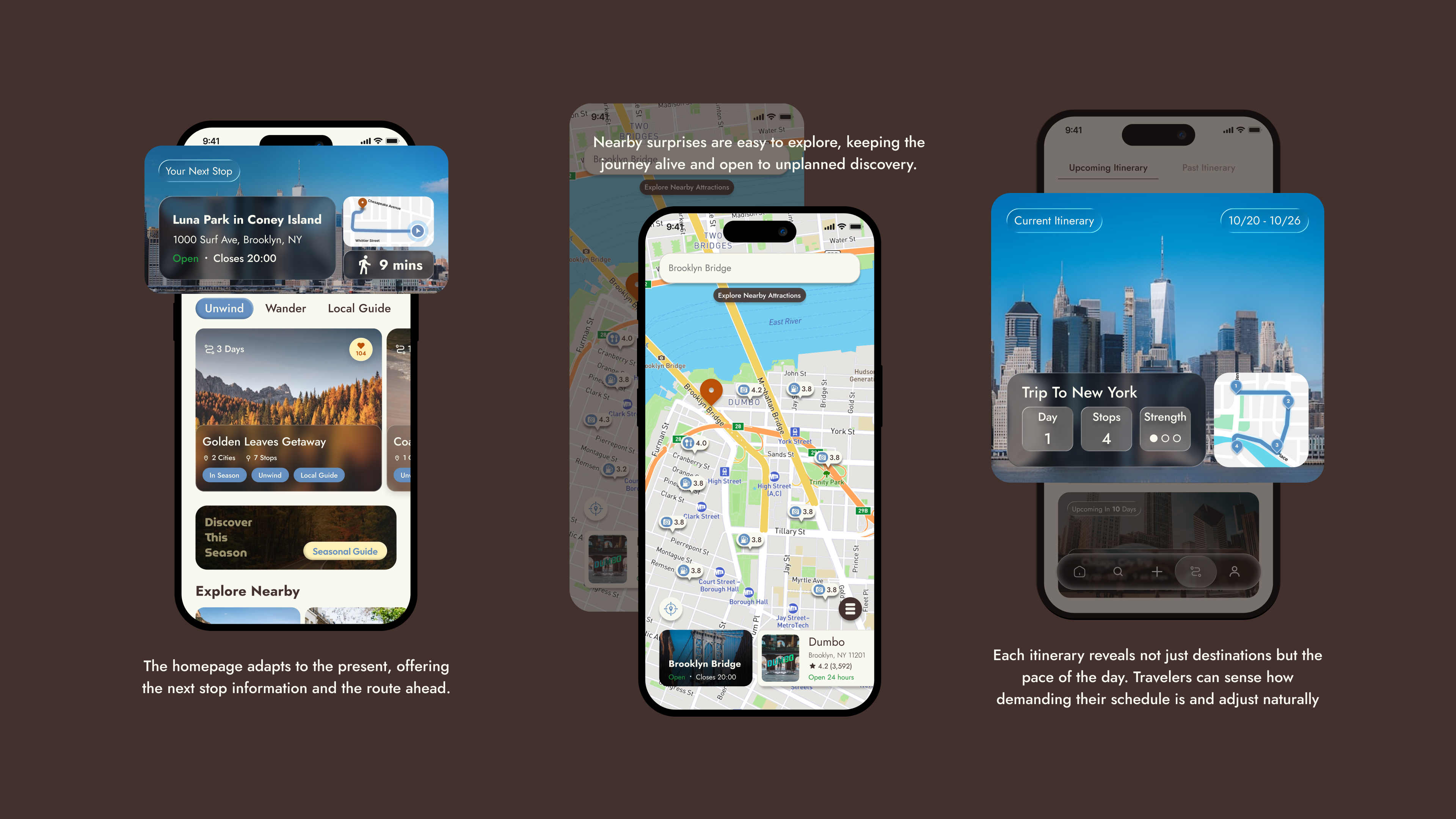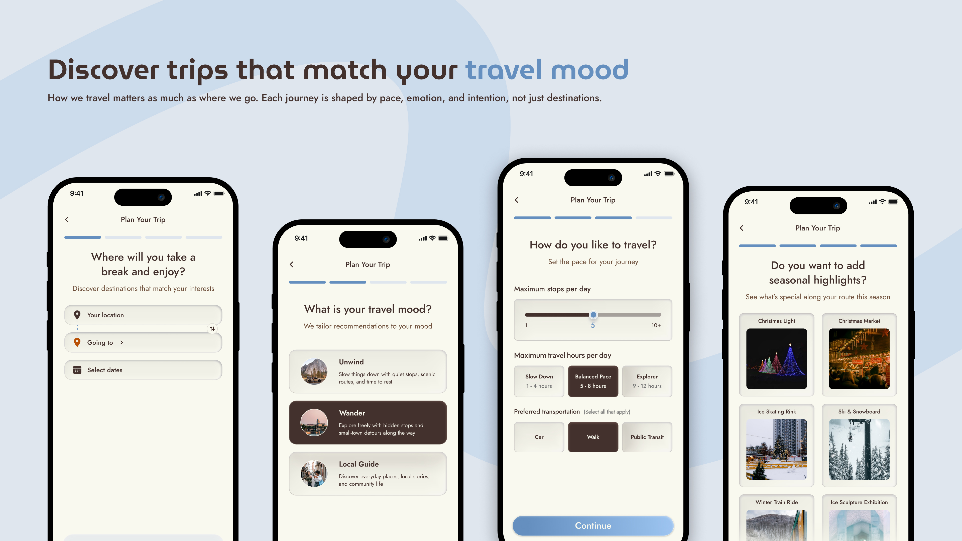 Existing navigation and travel planning systems are designed for efficiency above all else. Speed and optimization dominate the experience, often overlooking emotional states, decision fatigue, and the quiet desire for spontaneity and reflection. Planning becomes overwhelming, and the journey itself can feel rushed and disconnected.