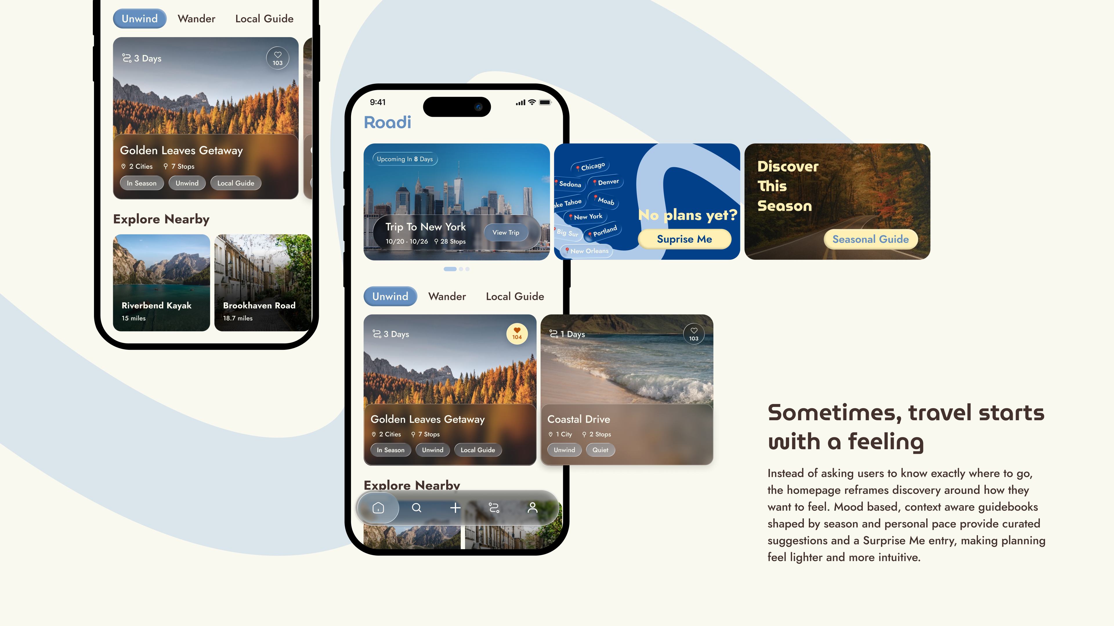 Roadi reimagines travel by shifting the focus from destinations to feelings. Instead of asking users where they want to go, it invites them to choose how they want to feel. Mood based and context aware recommendations respond to season and travel pace, shaping flexible routes and thoughtful stops along the way. By reducing the mental load of planning and navigation, Roadi creates space for rest, awareness, and presence throughout the journey.