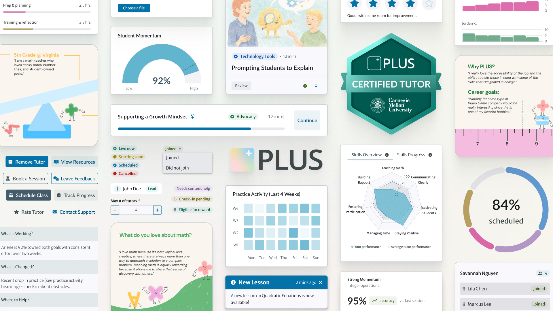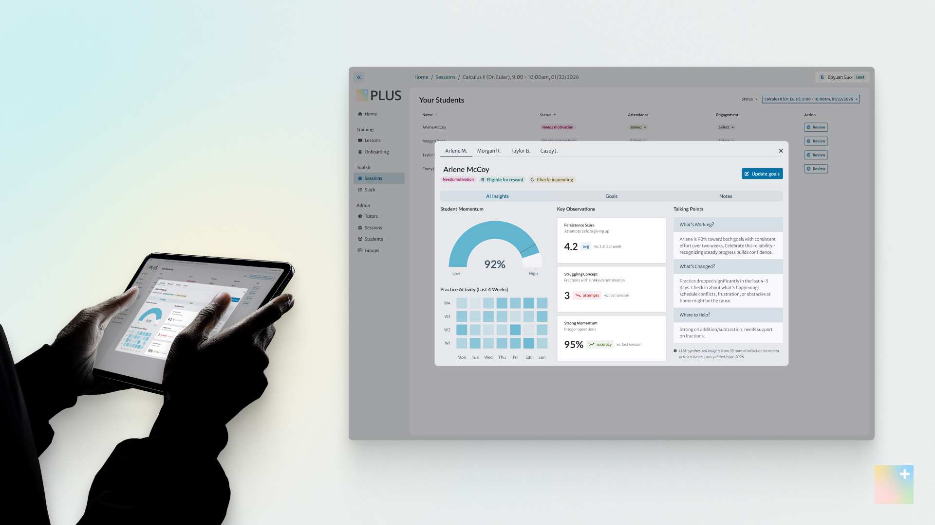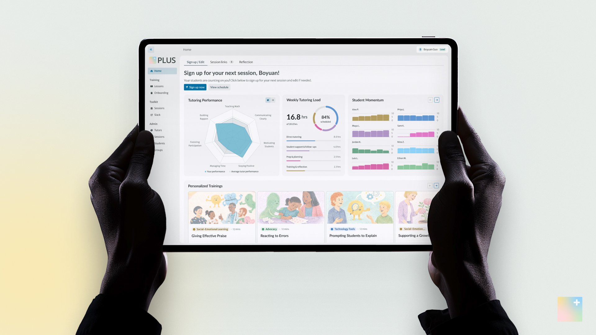 Rather than replacing human teachers with chatbots, PLUS redefines the role of AI in education. We place the technology "behind" the tutor, acting as an invisible super-power. The platform connects K-12 students in under-resourced schools with university-level tutors. Through a proprietary digital interface, these tutors receive real-time, AI-driven guidance—a "Co-pilot"—that helps them navigate complex math concepts and student emotional needs in the moment.