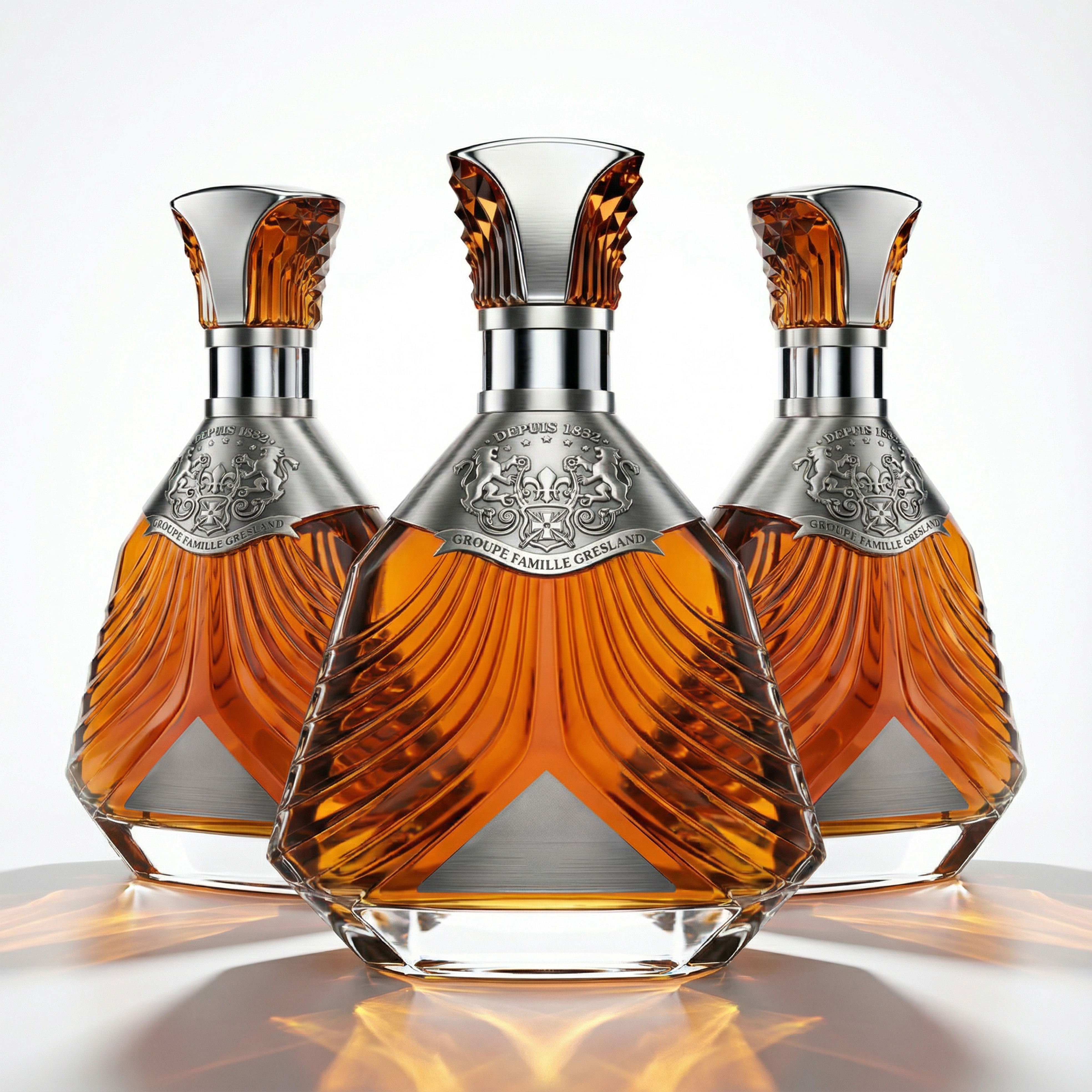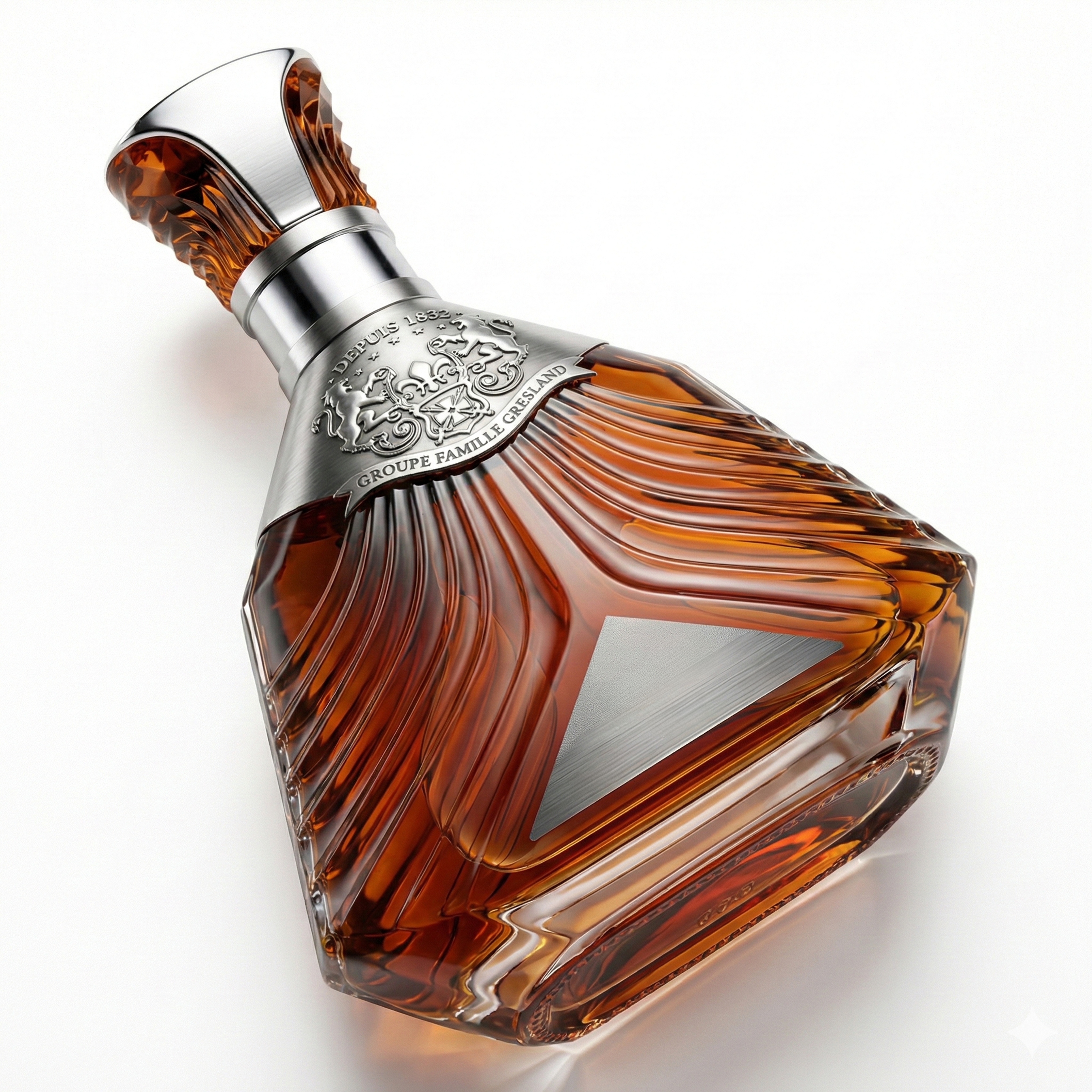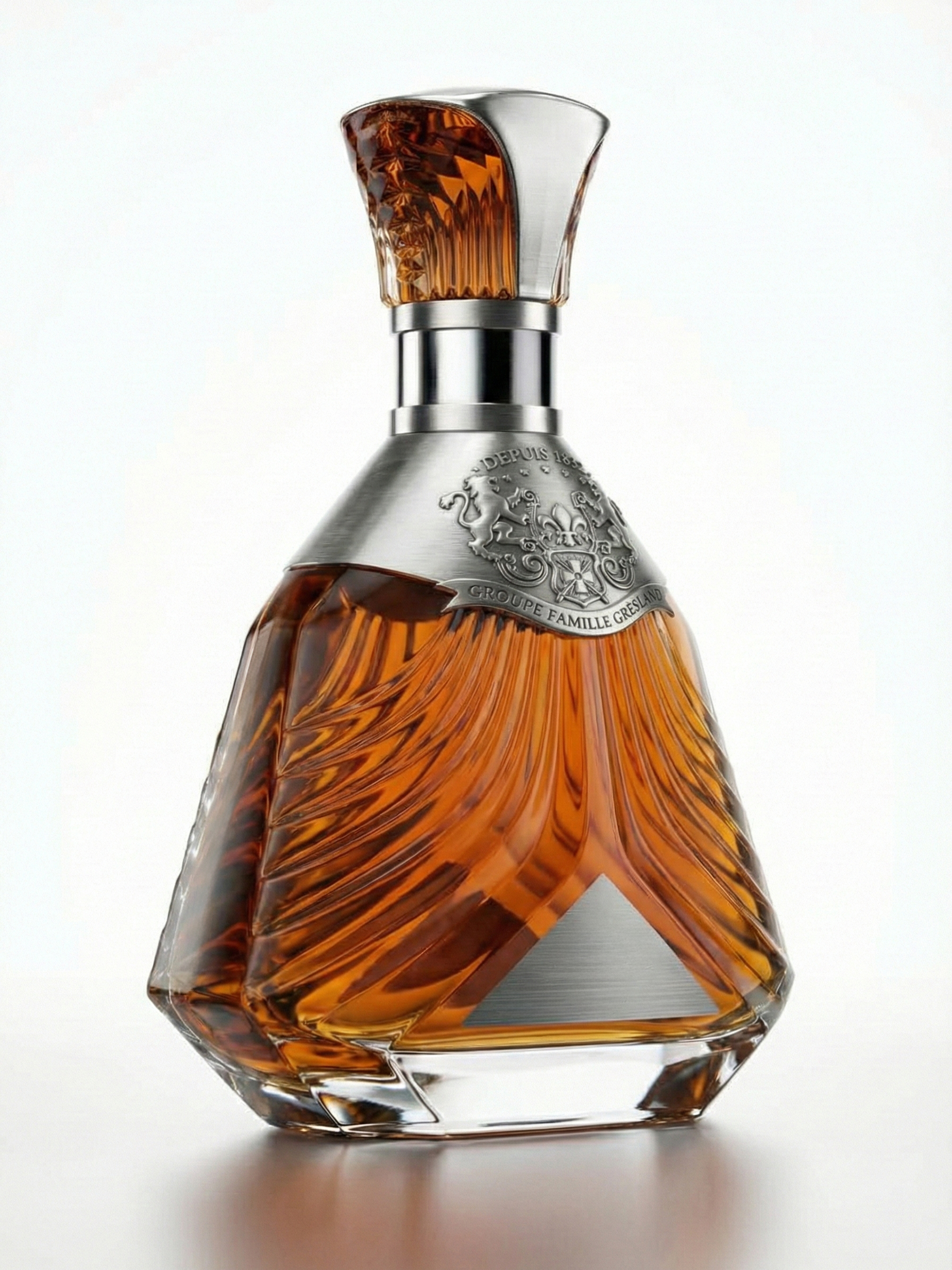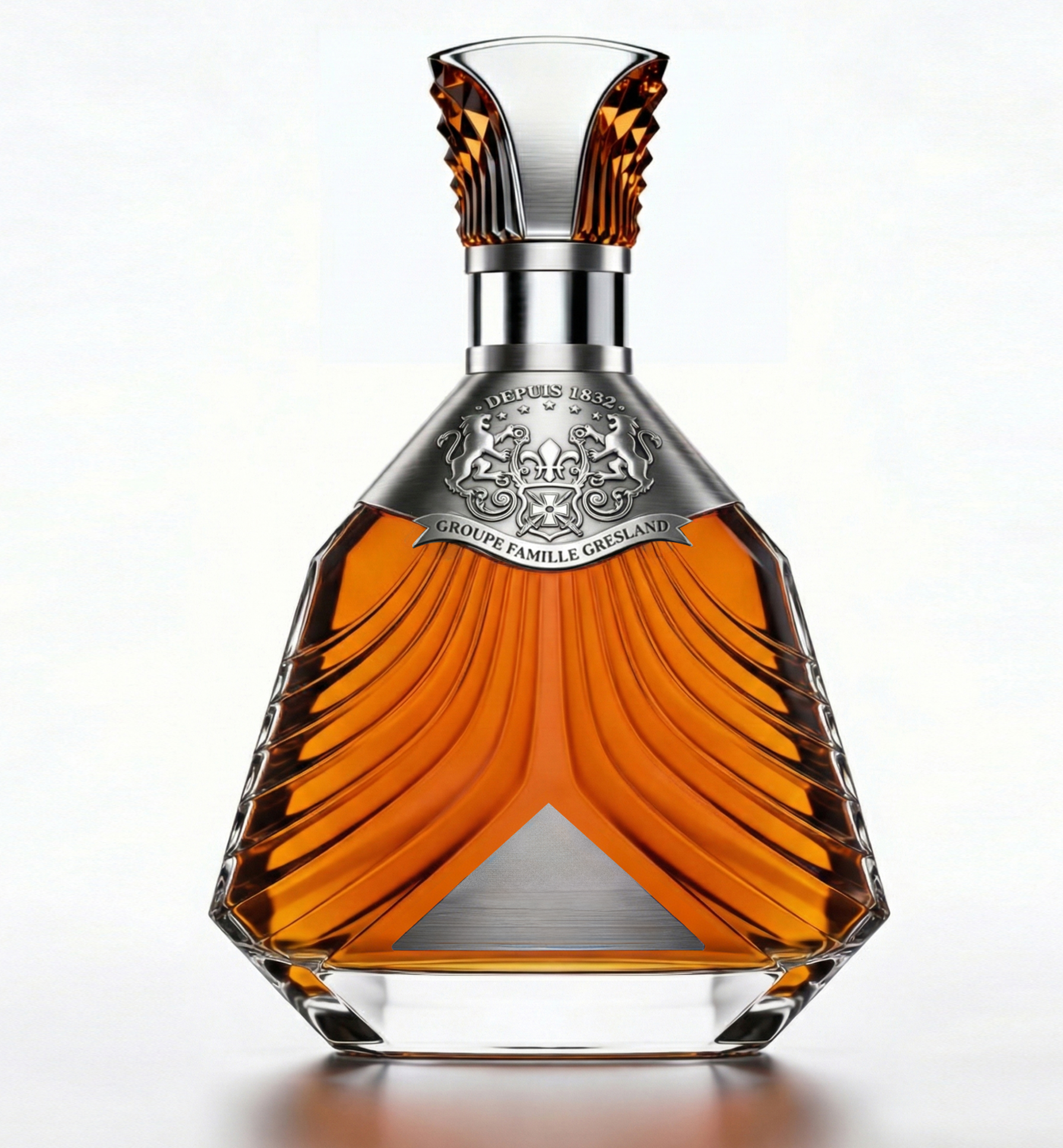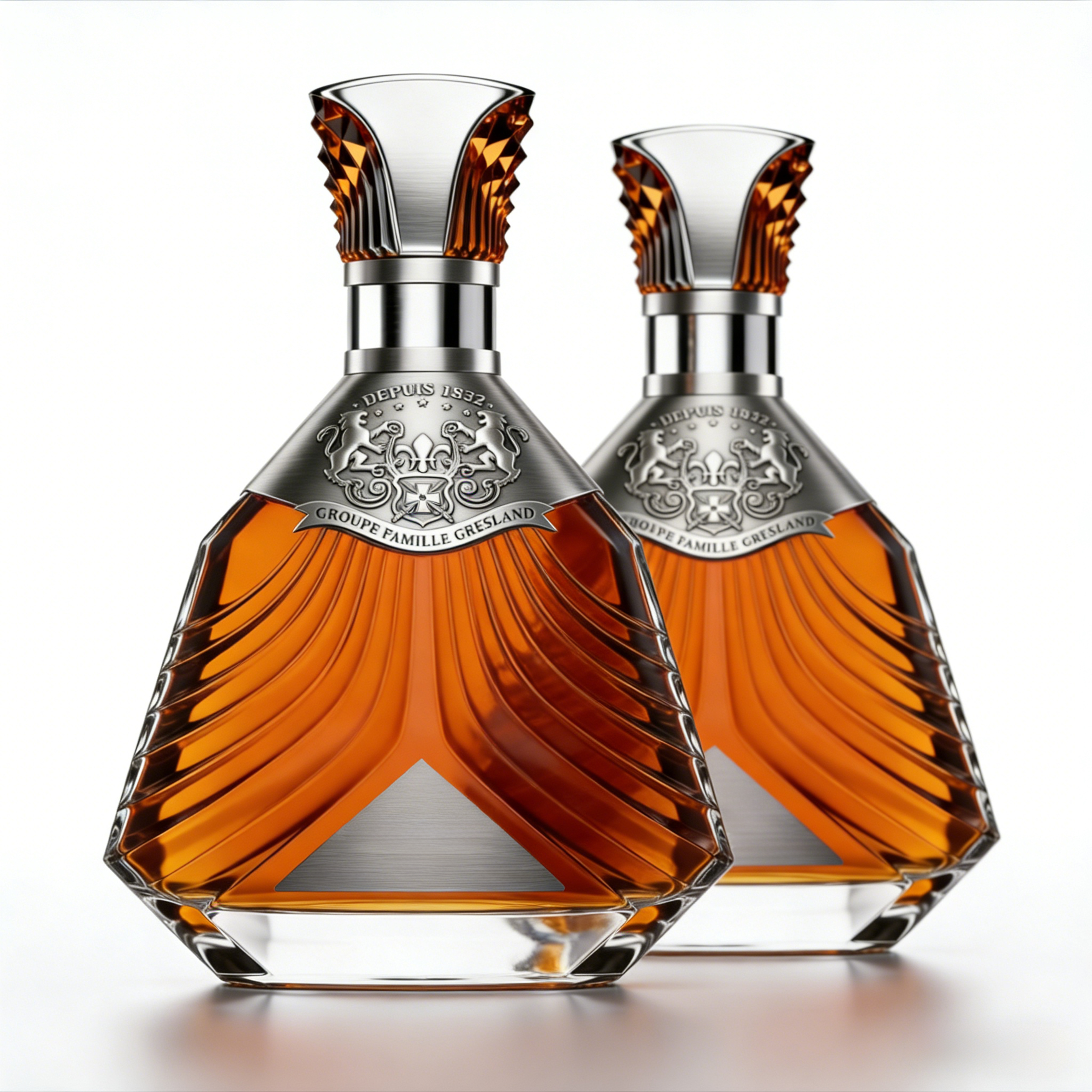 Anchoring the form is a brushed metal collar, cold-stamped with the GRESLAND family's dual-lion crest, a deliberate nod to legacy amidst modern lines. The silhouette, with its tapered waist and multifaceted base, draws from aerodynamic principles, creating a vessel that feels both monumental and dynamic.