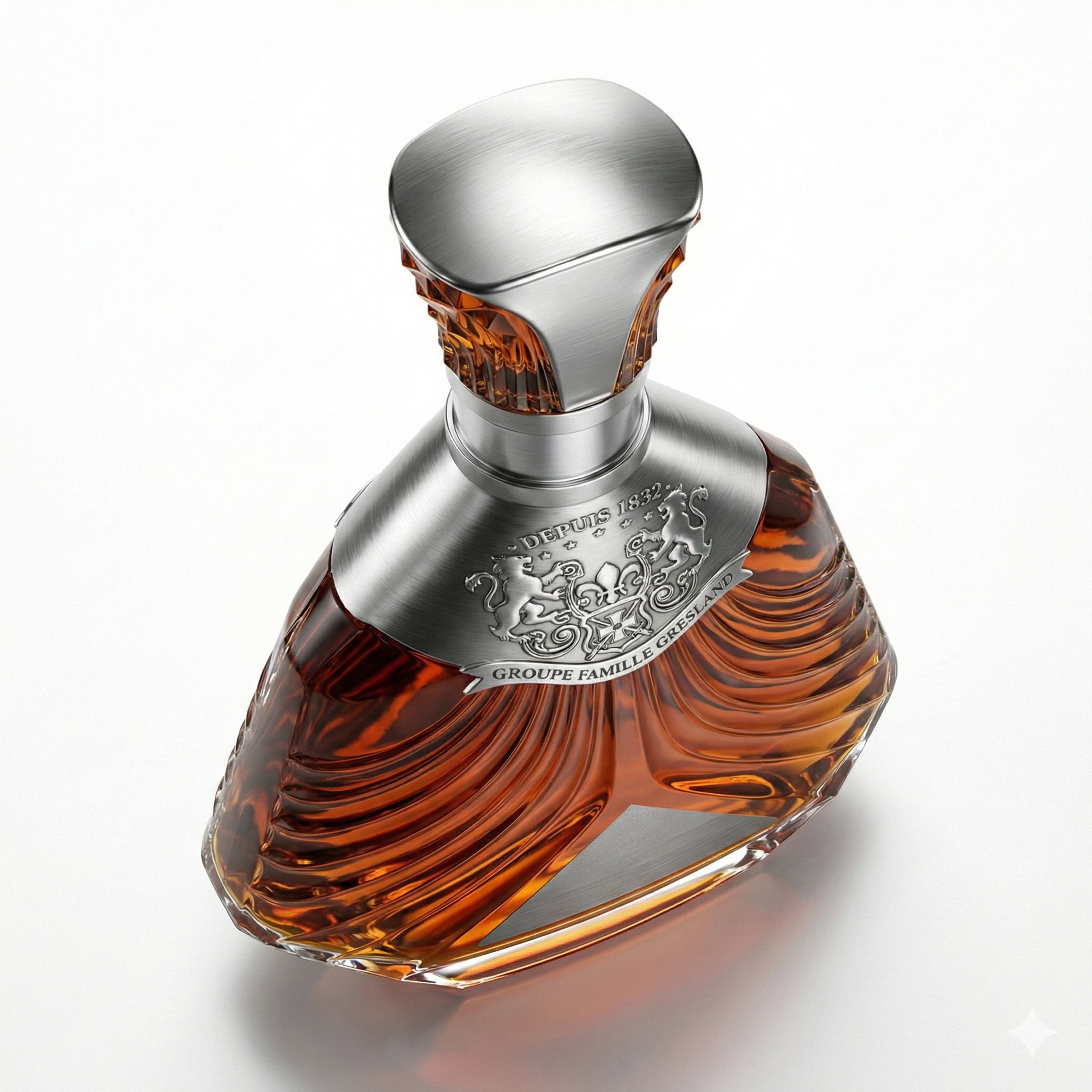 The CHÂTEAU BENC XO decanter redefines luxury spirits packaging through a bold dialogue between heritage and high-precision design. Its crystal architecture, defined by three sharp longitudinal flutes and a 45° faceted pour groove, transforms light and liquid into captured motion—a visual metaphor for kinetic energy rendered in still life.