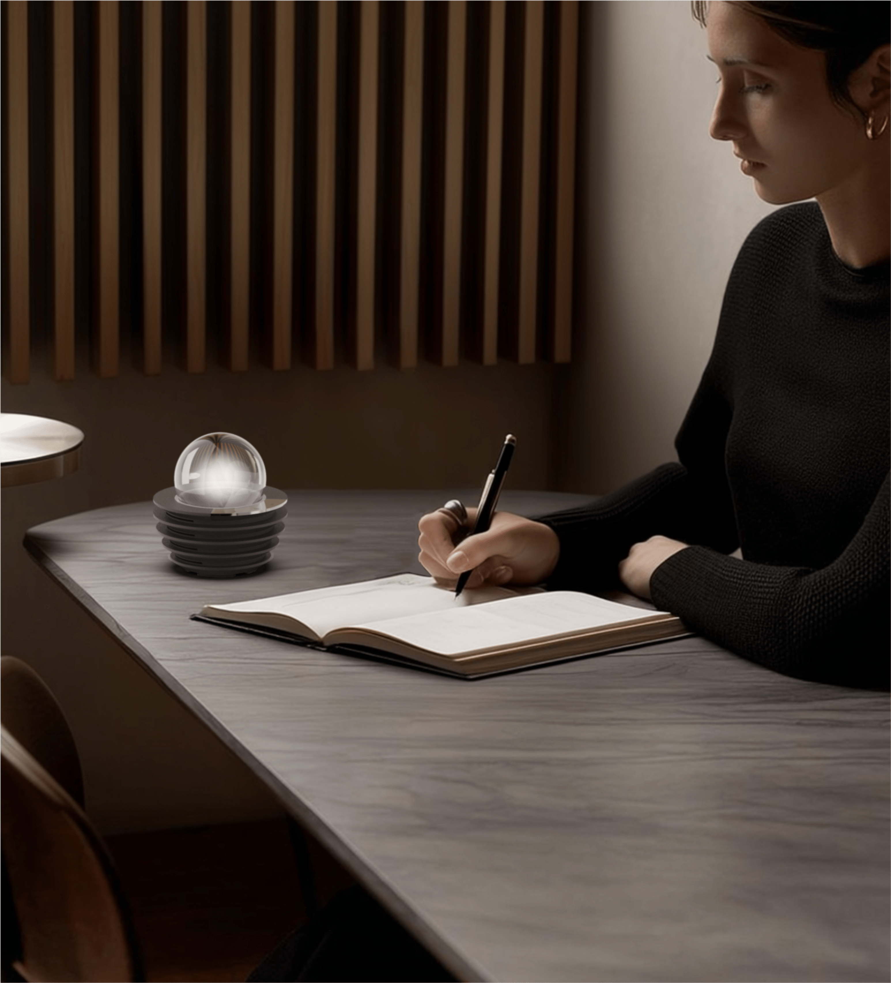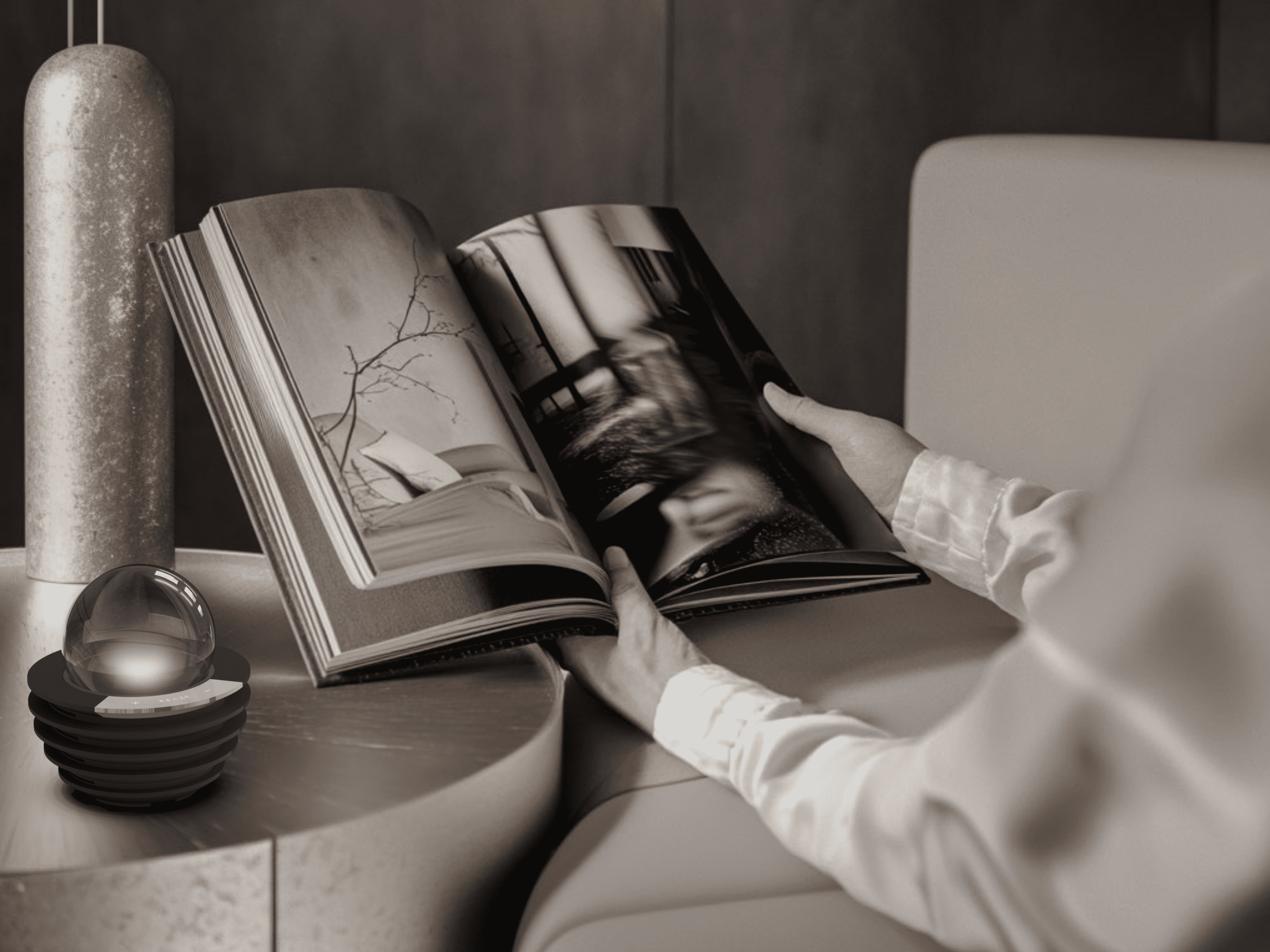Externally, REAZE introduces industrial-grade 3D sand printing to consumer electronics, giving each housing a unique natural texture and warm tactile quality. The transparent glass light chamber contrasts with the rugged sand base, embodying a distinct "Tech Wabi" aesthetic. Its minimalist sculptural form, centered on an annular light signature, balances futuristic design with artistic expression.