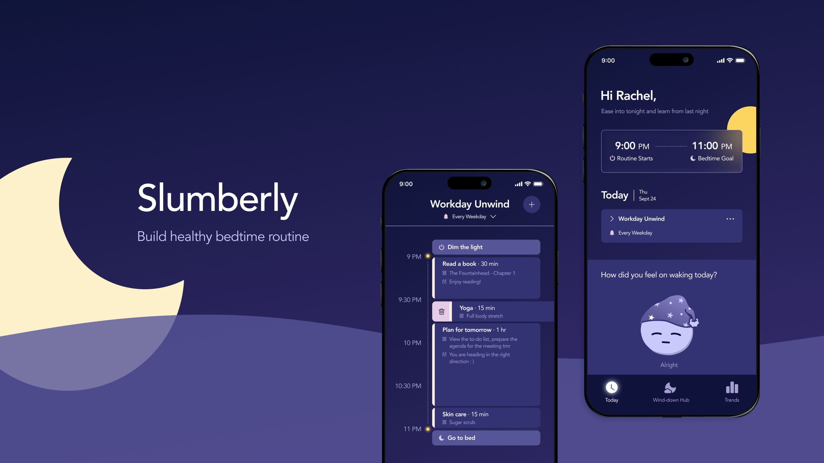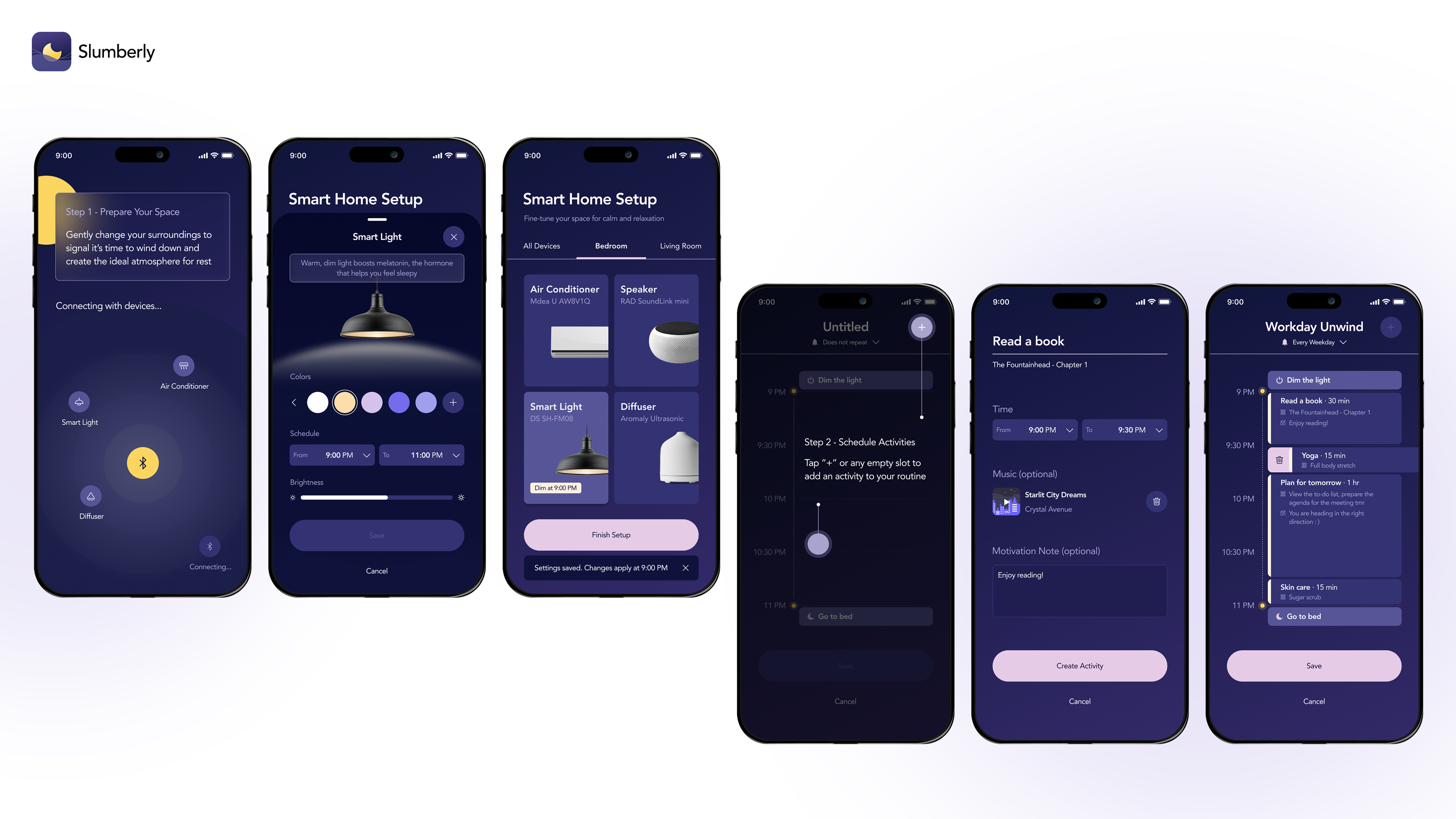 Going beyond a time planner, Slumberly applies behavioral science to help users design and carry out bedtime rituals with ease. It guides users to plan an ideal wind-down window, choose suitable activities, and automatically prepare their environment at bedtime, intentionally minimizing decision fatigue and cognitive load.