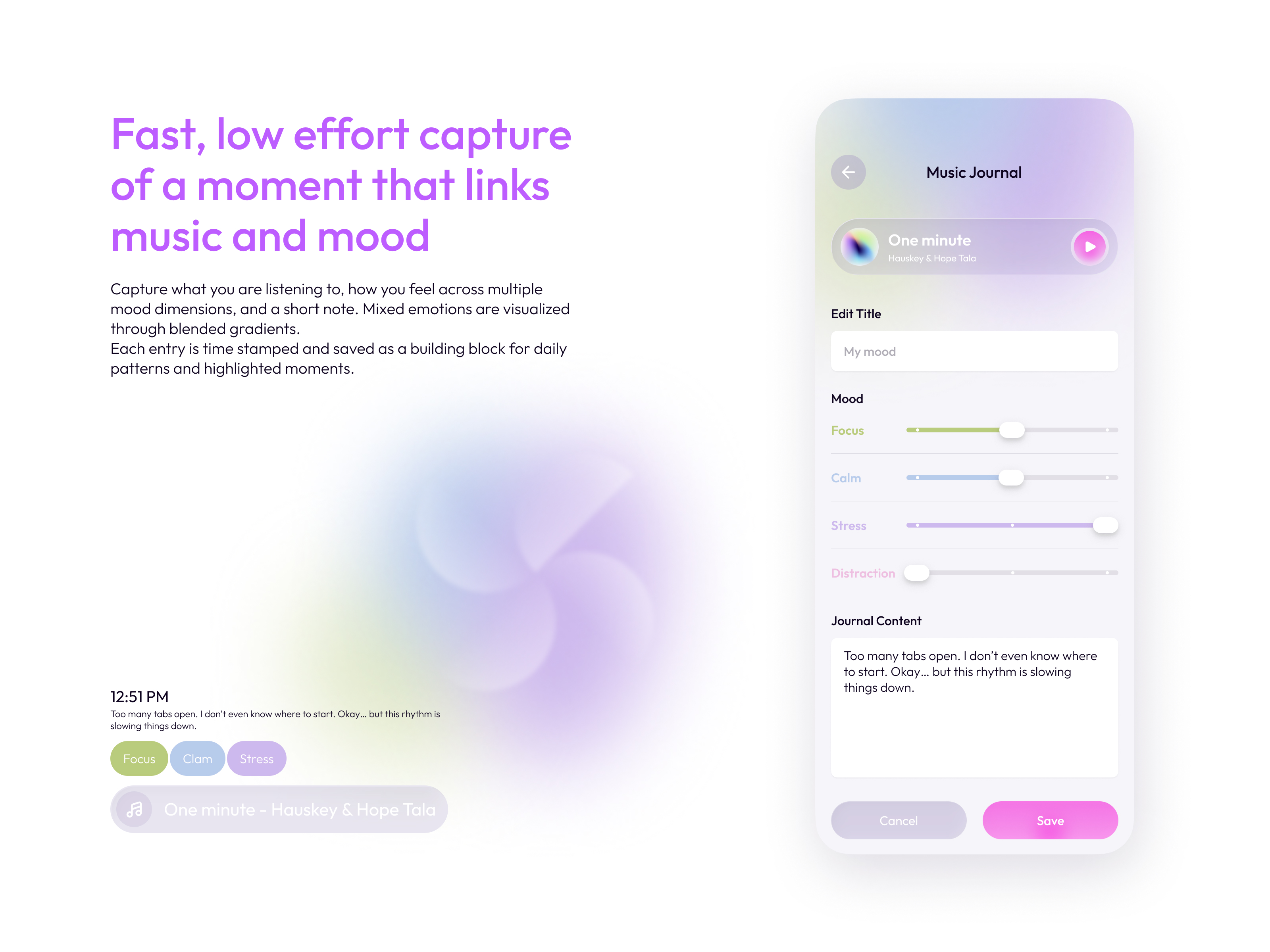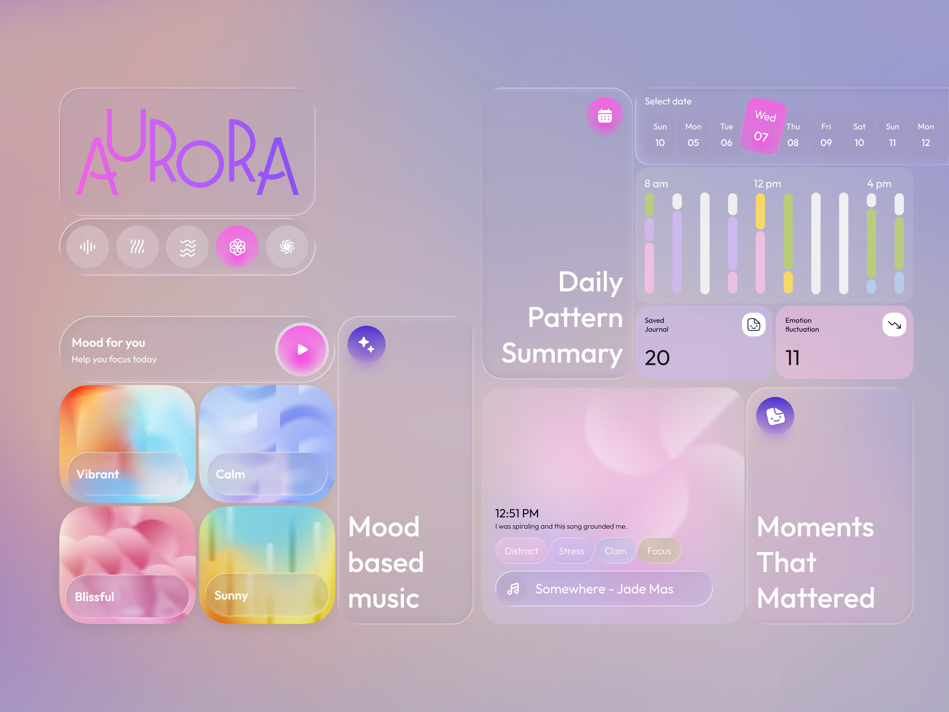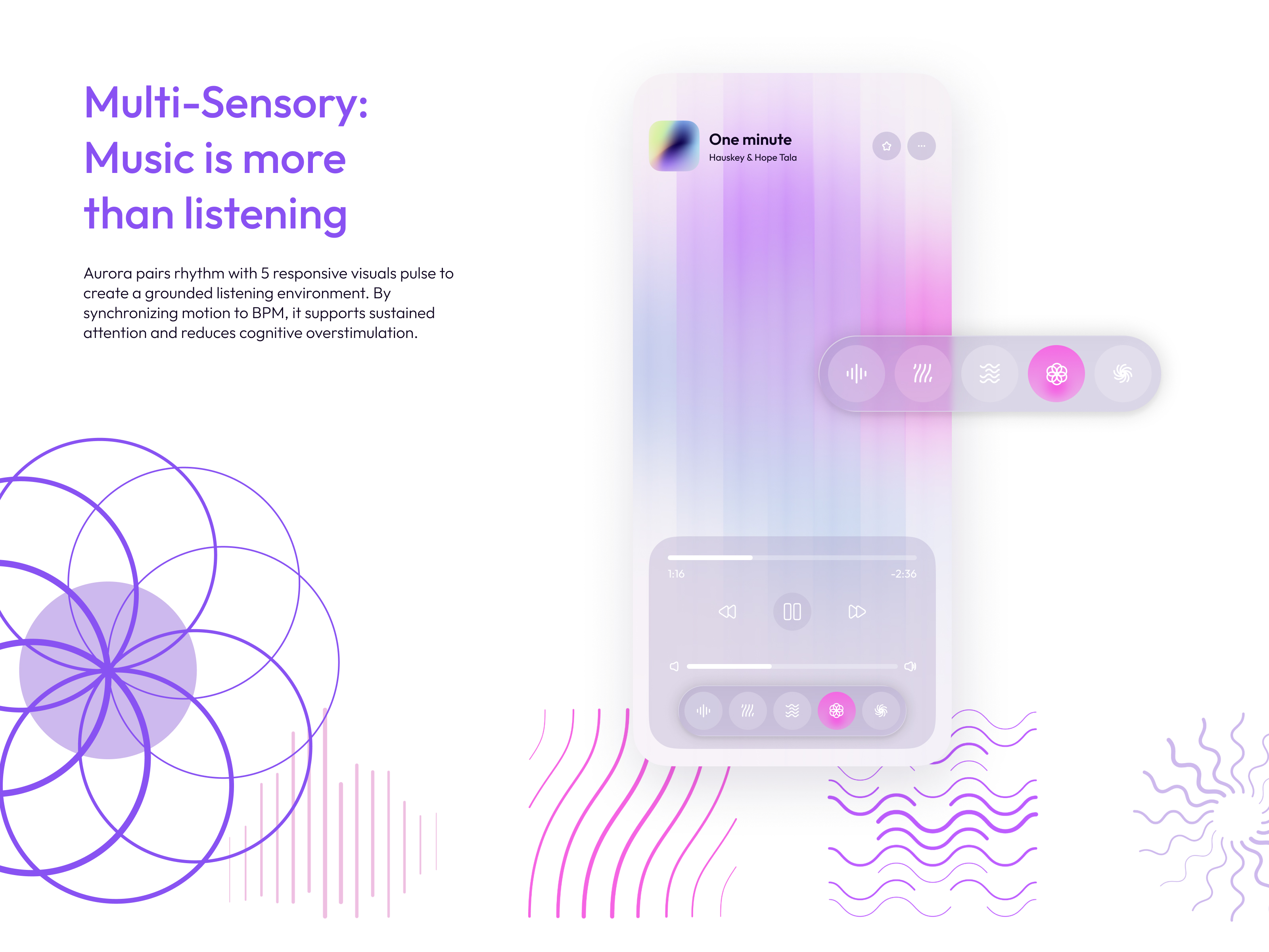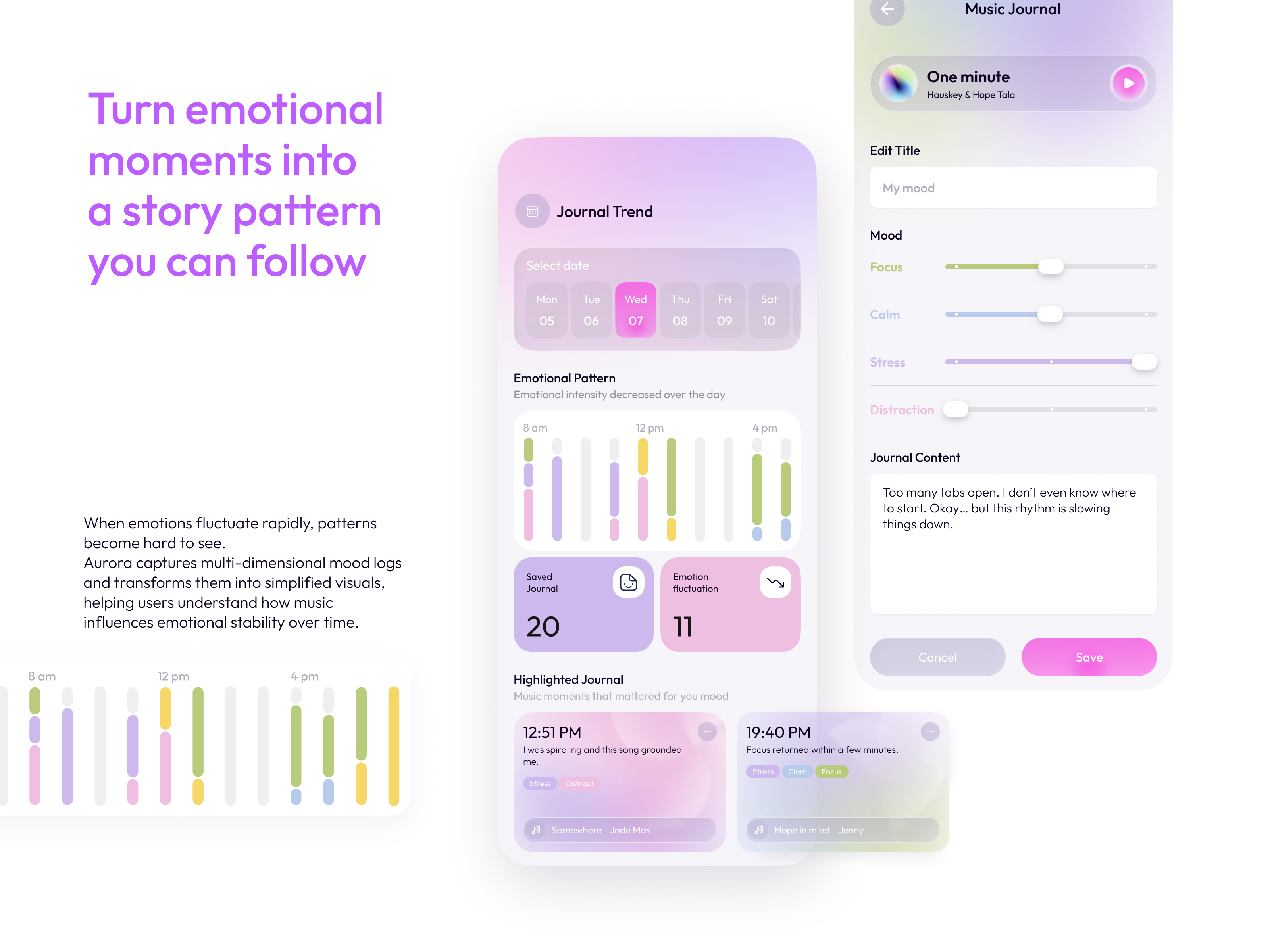 Through rhythm-synced visuals and a multi-dimensional music journal, Aurora helps users recognize how sound influences their focus and emotional regulation. By transforming fleeting listening moments into meaningful patterns, Aurora supports sustained attention and builds long-term self-regulation habits for neurodiverse wellbeing.