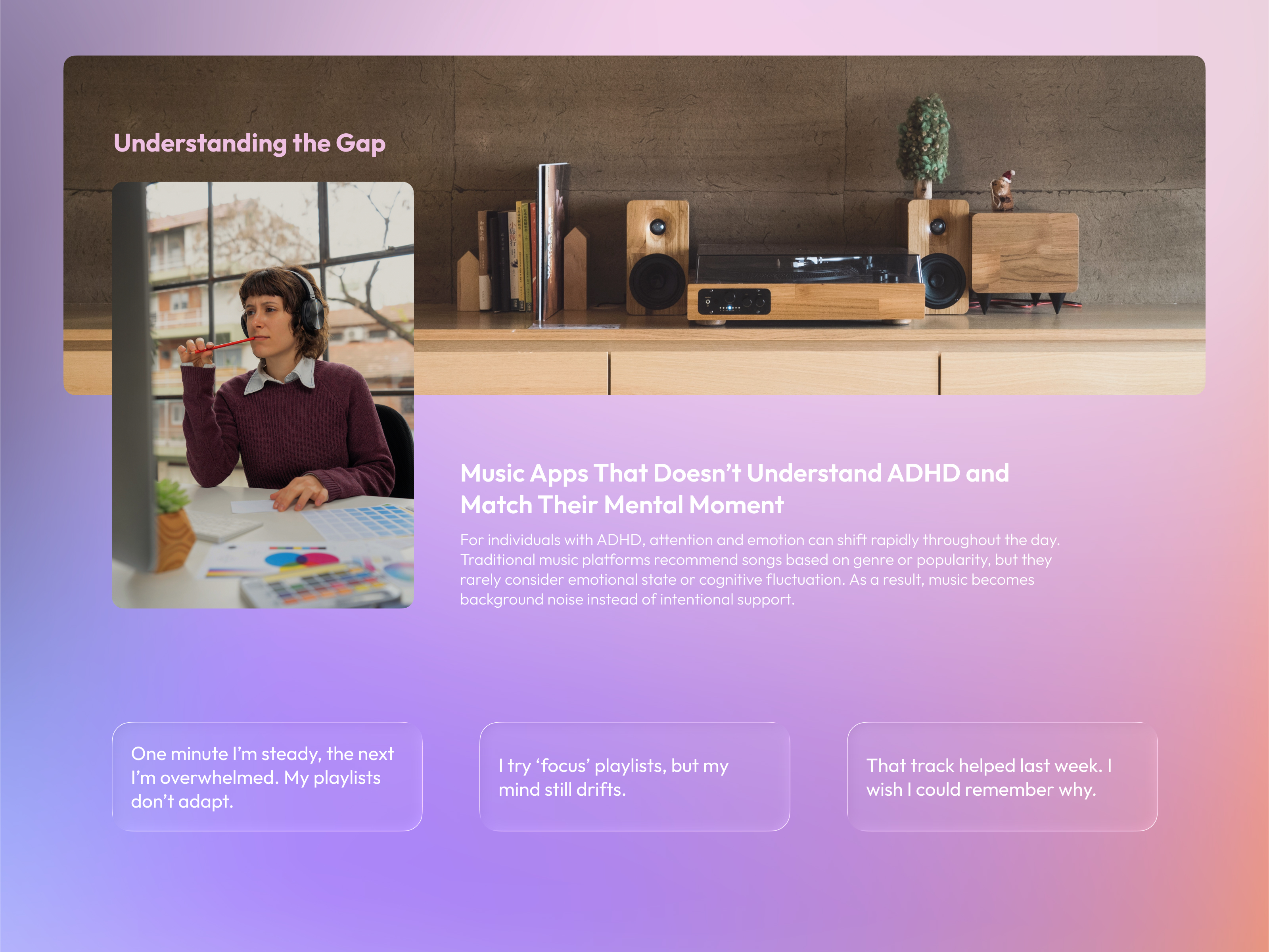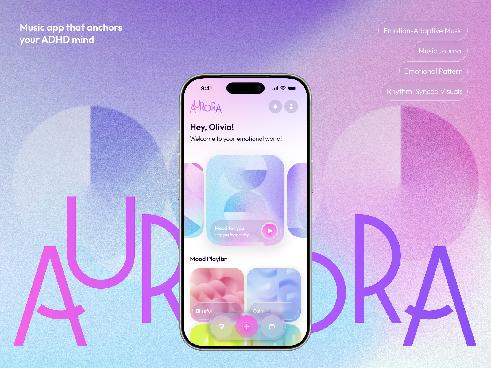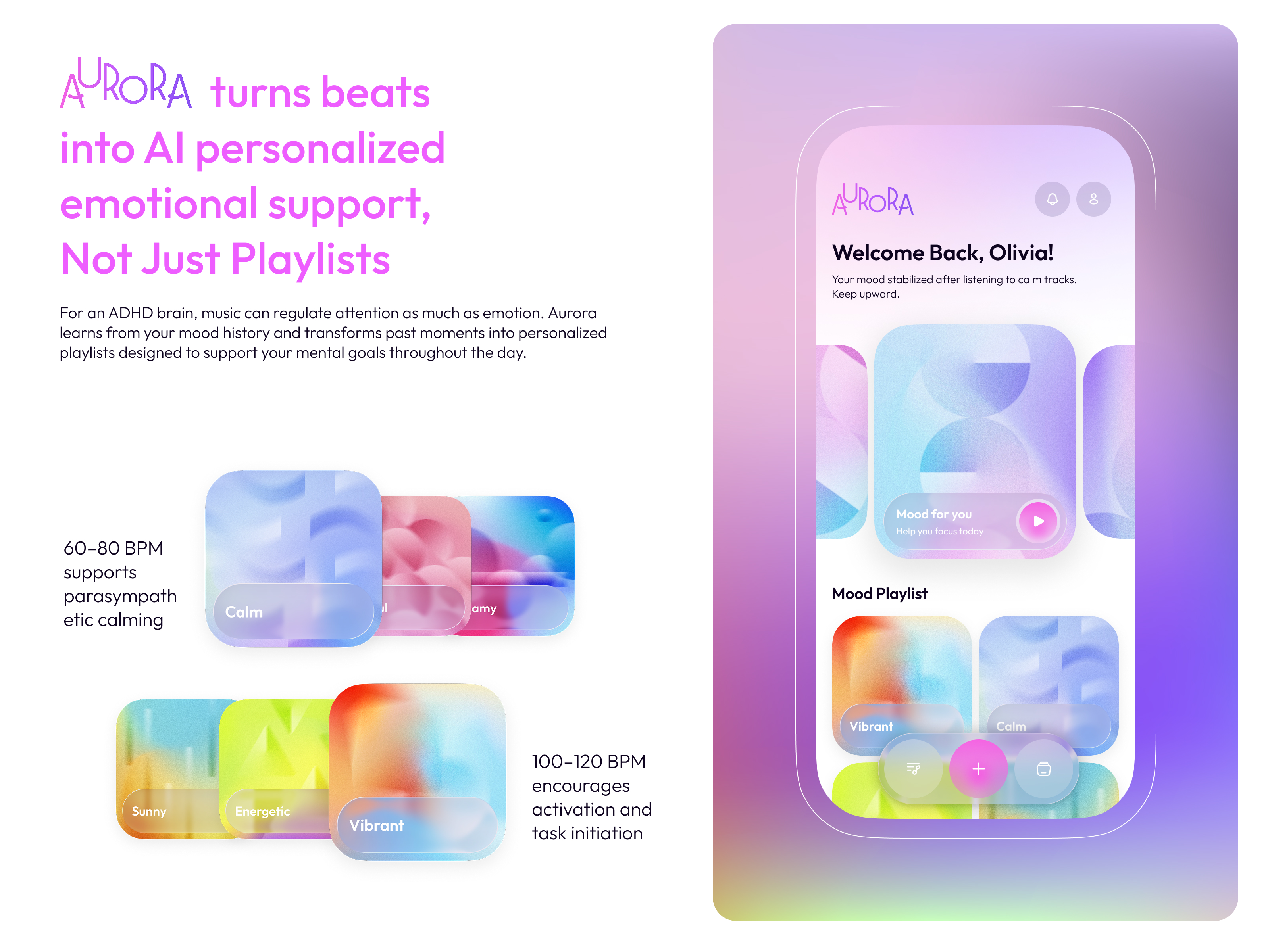 AURORA is a neuroscience-backed music therapy app built for ADHD individuals, who often struggle with persistent distraction, emotional instability, and fragmented daily experiences. Rather than functioning as a traditional music app, Aurora analyzes mood patterns over time to generate state-matched playlists and structured emotional patterns.
