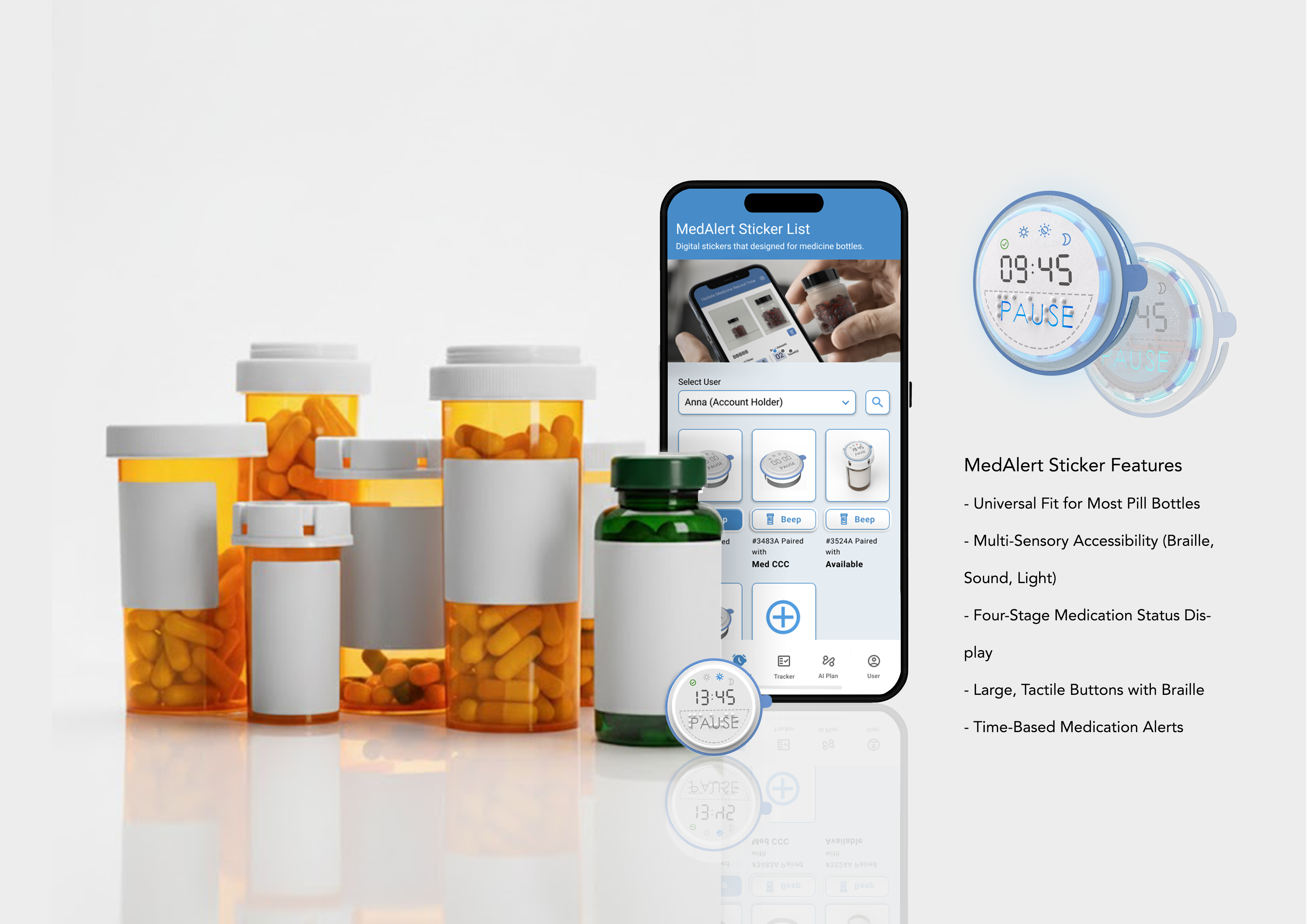 The MedAlert AI combines a compact device with AI and UX-driven solutions to simplify medication management. It includes a physical sticker that can be attached to any medicine cap and a mobile app for digital support.