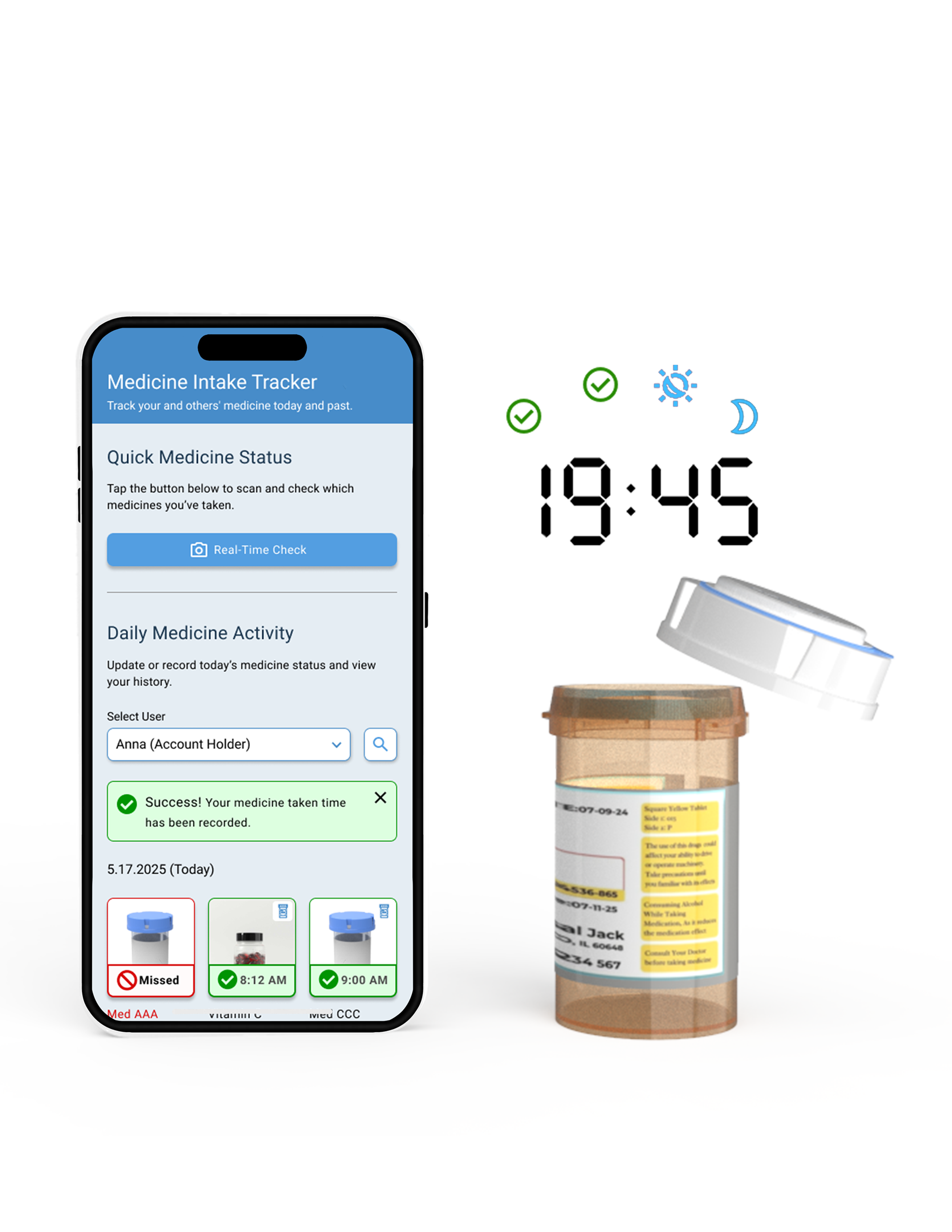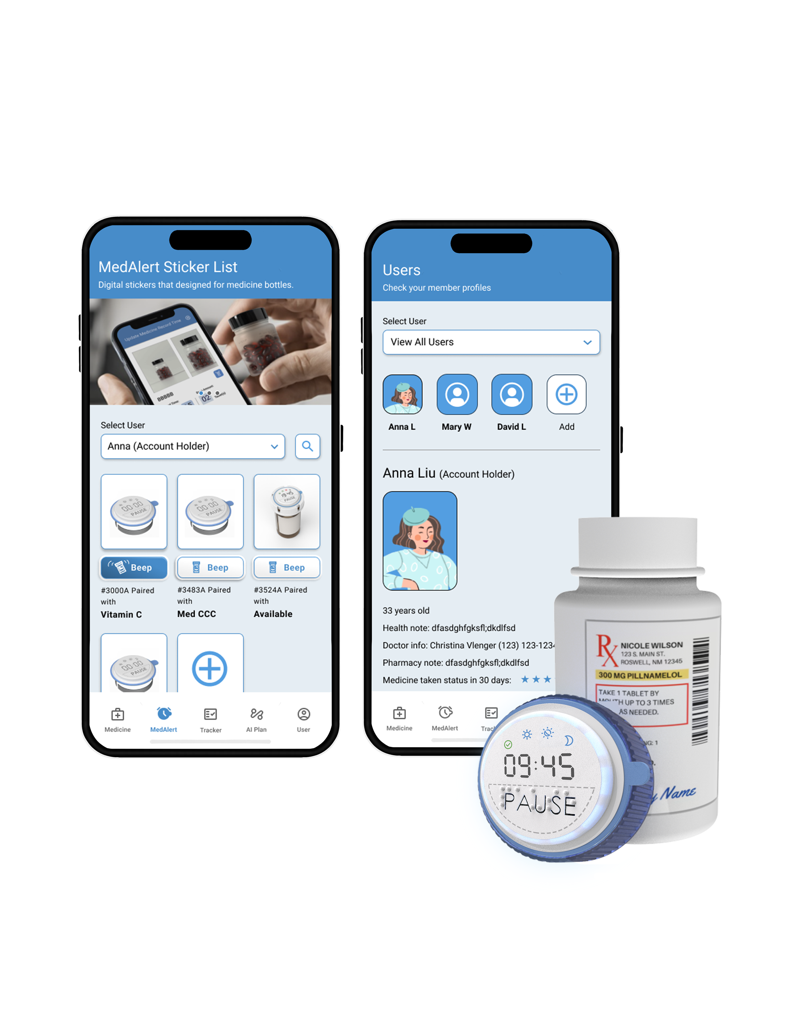 The sticker allows users to hear and see alerts when activated. It stands out from similar products due to its portable design, accessibility, affordability, and reusability across different medications without requiring any changes to any medicine bottle. The app lets families set alerts remotely and track medication in real time. AI auto-recognizes medicines, builds schedules, and monitors status instantly.