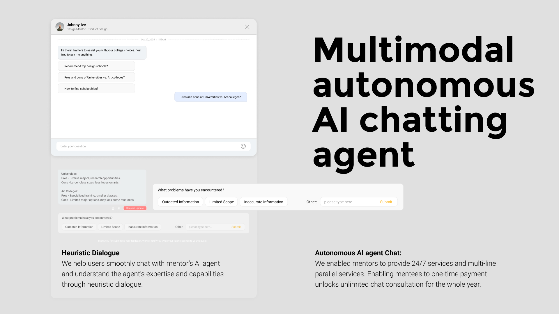 To extend support beyond scheduled mentoring sessions, FitU incorporates an AI conversational assistant capable of answering questions, providing guidance, and helping students explore potential universities at any time.