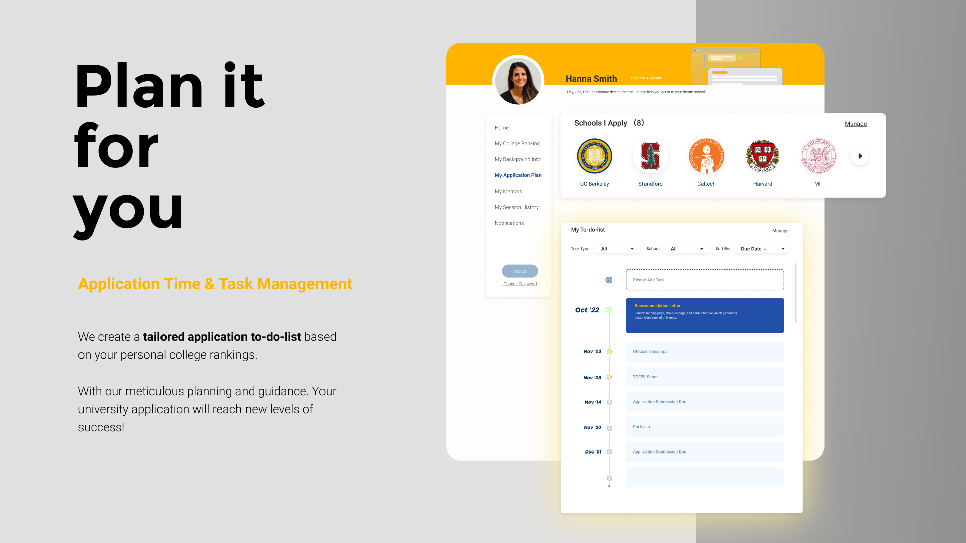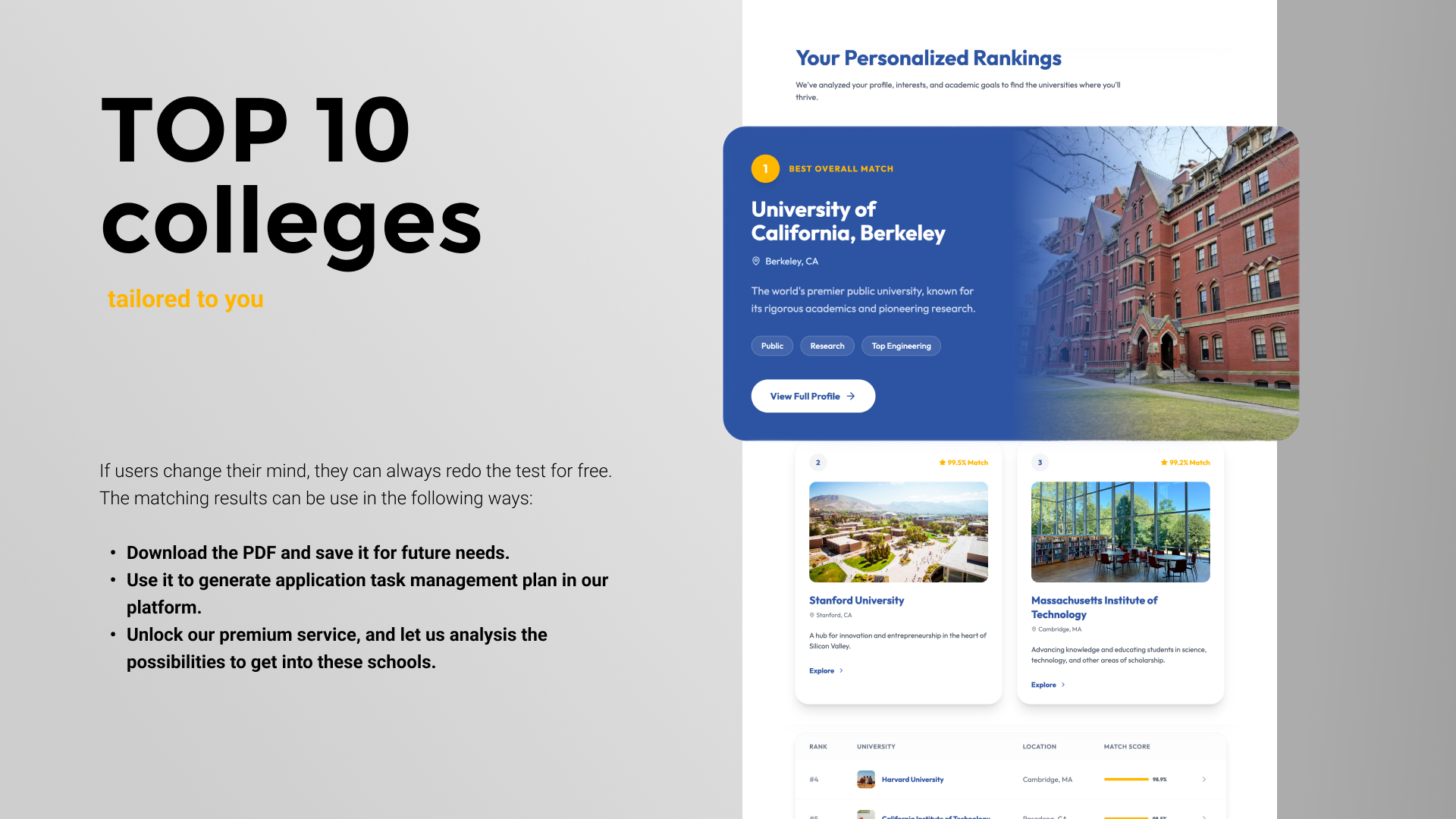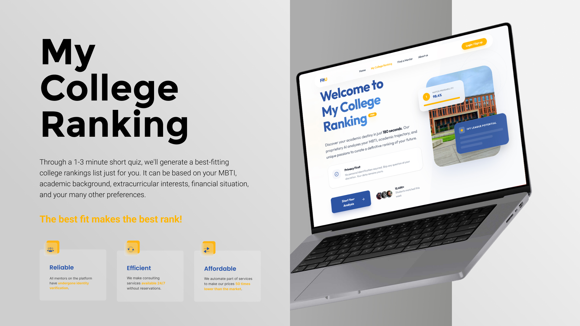 By combining personalized ranking, mentor matching, and application task management into a single platform, FitU redefines how students approach college selection. Instead of navigating fragmented information and conflicting rankings, students receive a coherent, data-driven pathway toward universities that truly fit their ambitions and potential.