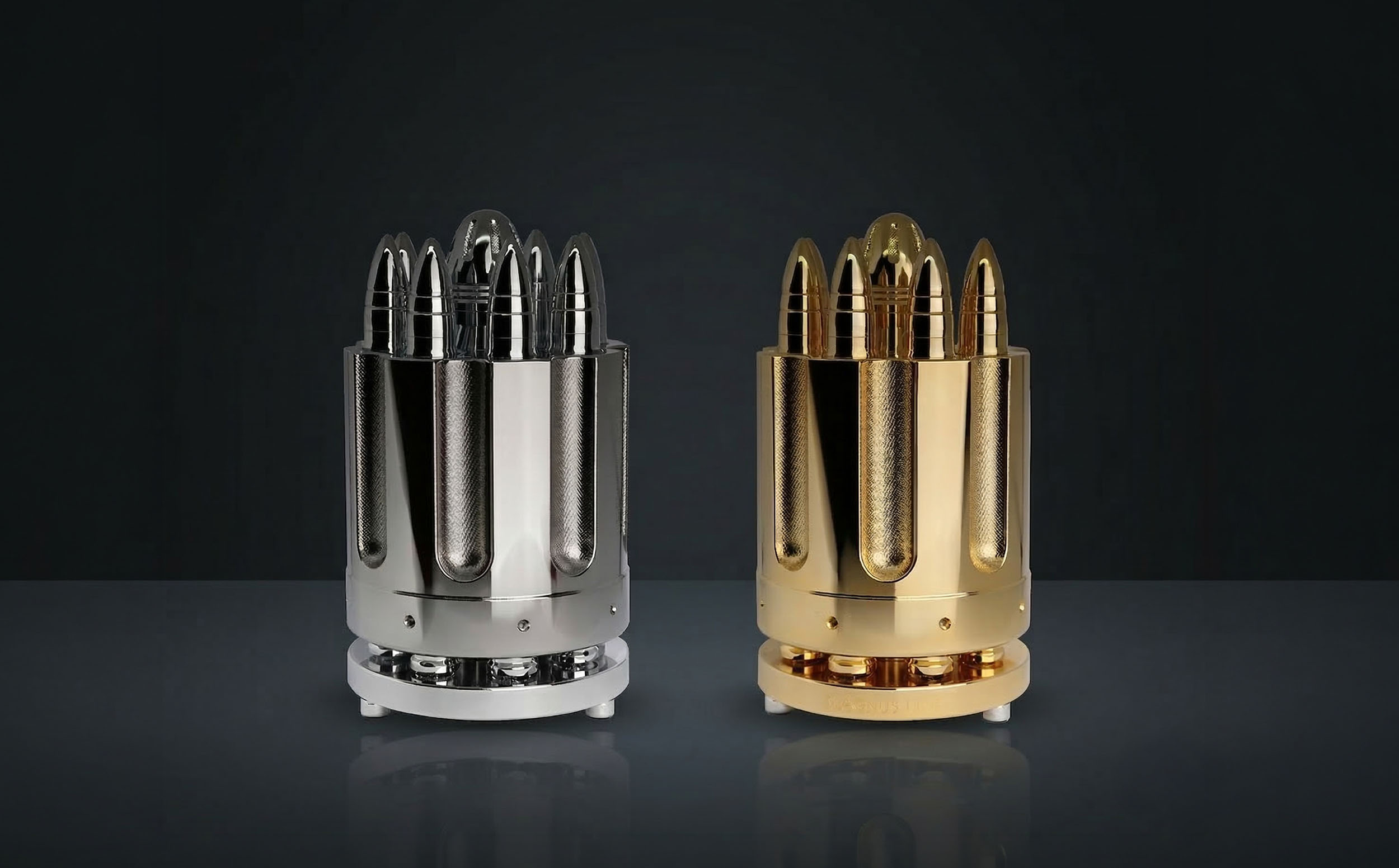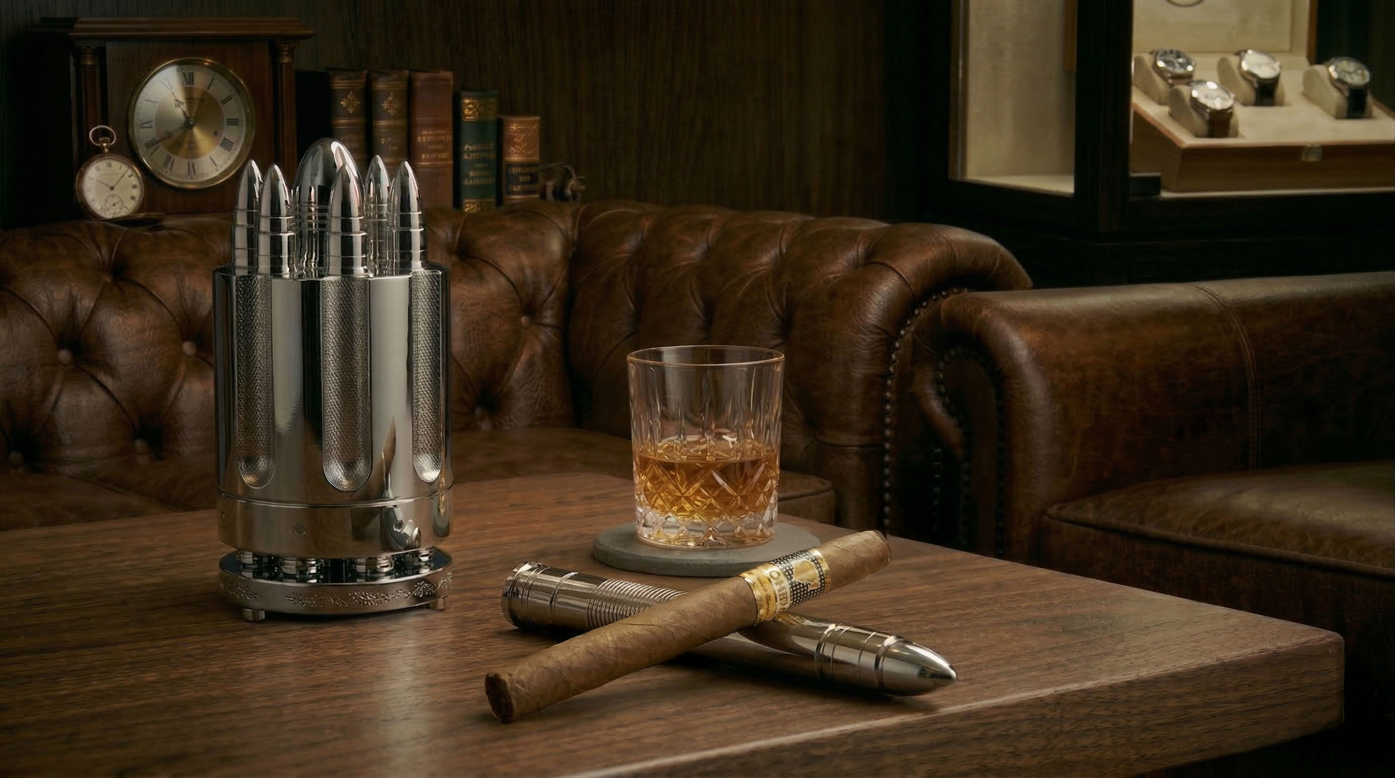 The MAGNUS LIFE Revolver Cigar Set is a precision-engineered cigar accessory inspired by the rotating cylinder of a revolver. The design reimagines the traditional cigar holder as an interactive centerpiece that combines mechanical craftsmanship with the ritual of cigar enjoyment.