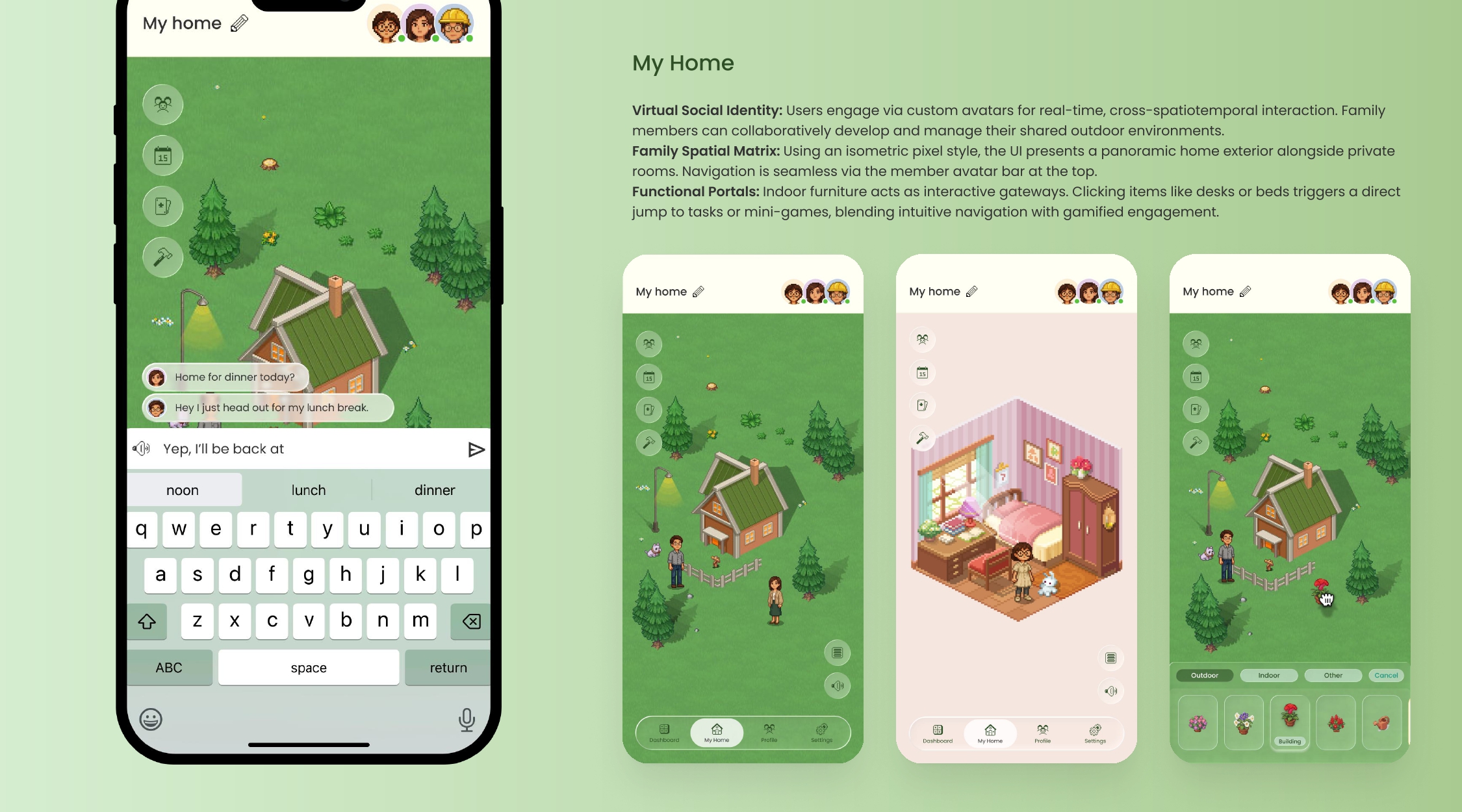 Through ambient signals, collaborative tasks, and lightweight interactions, family members can stay emotionally connected while participating in a shared digital space. By reframing work activity as a form of communication, Family Re:Union introduces a new approach to remote family connection—one where presence can be felt even when words are few.