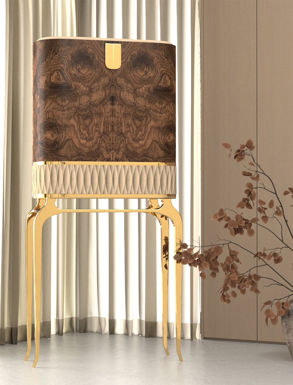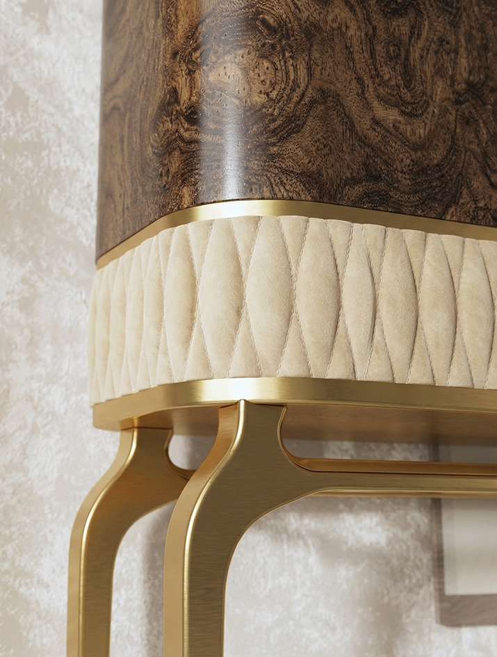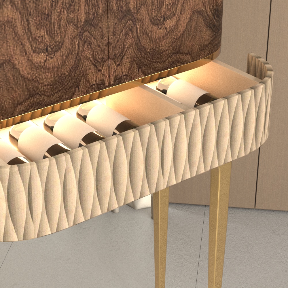 本款高脚边柜以中式传统家具的“枨”结构为设计灵感,提炼其 “结构即装饰” 的美学内核,将横枨的力学逻辑与线条韵律转译为挺拔灵动的柜腿骨架,既承袭传统家具 “四平八稳、刚柔并济” 的稳固特质,又赋予柜体现代轻盈的视觉张力;材质上以现代装饰木皮承载温润肌理搭配轻奢金属与立体绗缝工艺,在冷暖碰撞与层次对比中实现传统骨相与当代质感的共生让传统美学在现代家居语境中焕发新生。