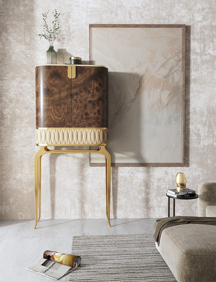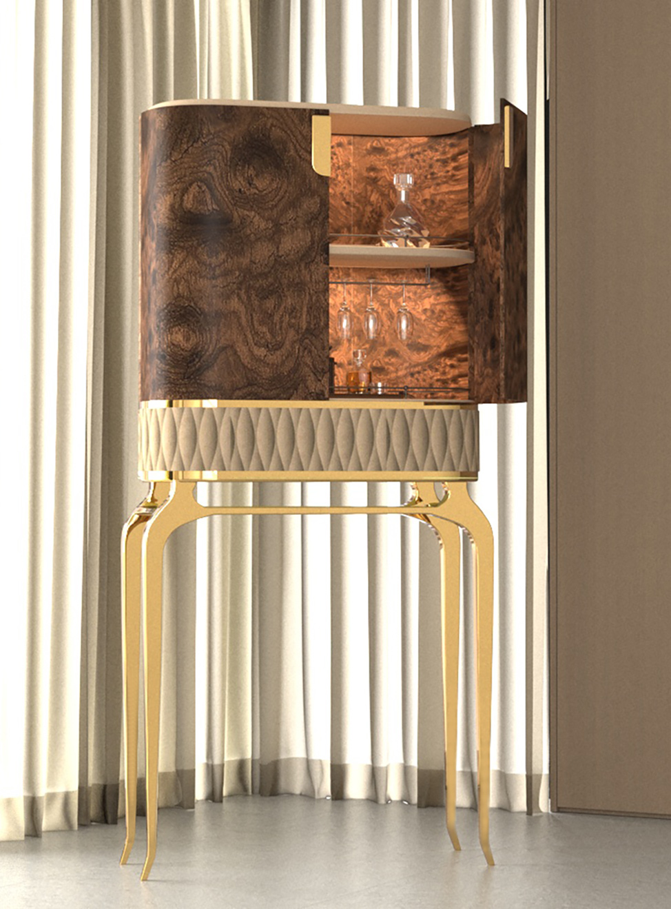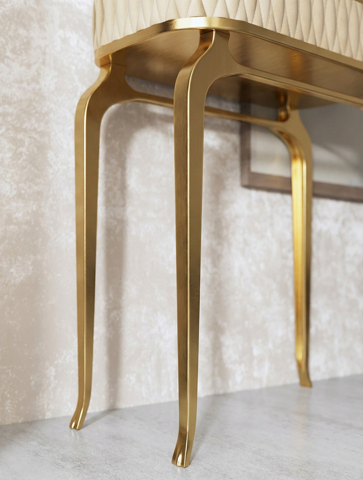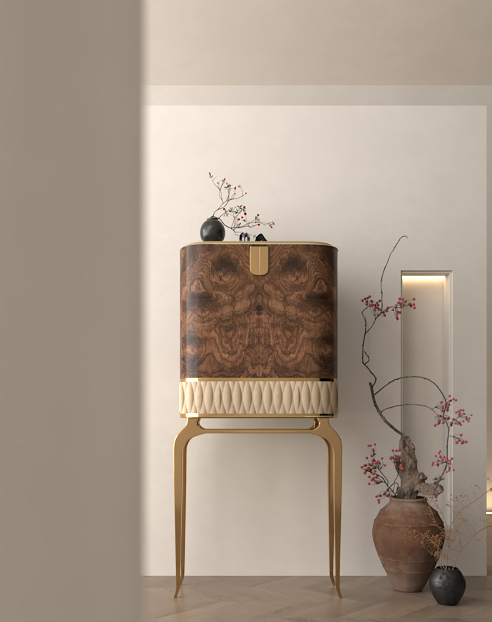 本款高脚边柜以中式传统家具的“枨”结构为设计灵感,提炼其 “结构即装饰” 的美学内核,将横枨的力学逻辑与线条韵律转译为挺拔灵动的柜腿骨架,既承袭传统家具 “四平八稳、刚柔并济” 的稳固特质,又赋予柜体现代轻盈的视觉张力;材质上以现代装饰木皮承载温润肌理搭配轻奢金属与立体绗缝工艺,在冷暖碰撞与层次对比中实现传统骨相与当代质感的共生让传统美学在现代家居语境中焕发新生。