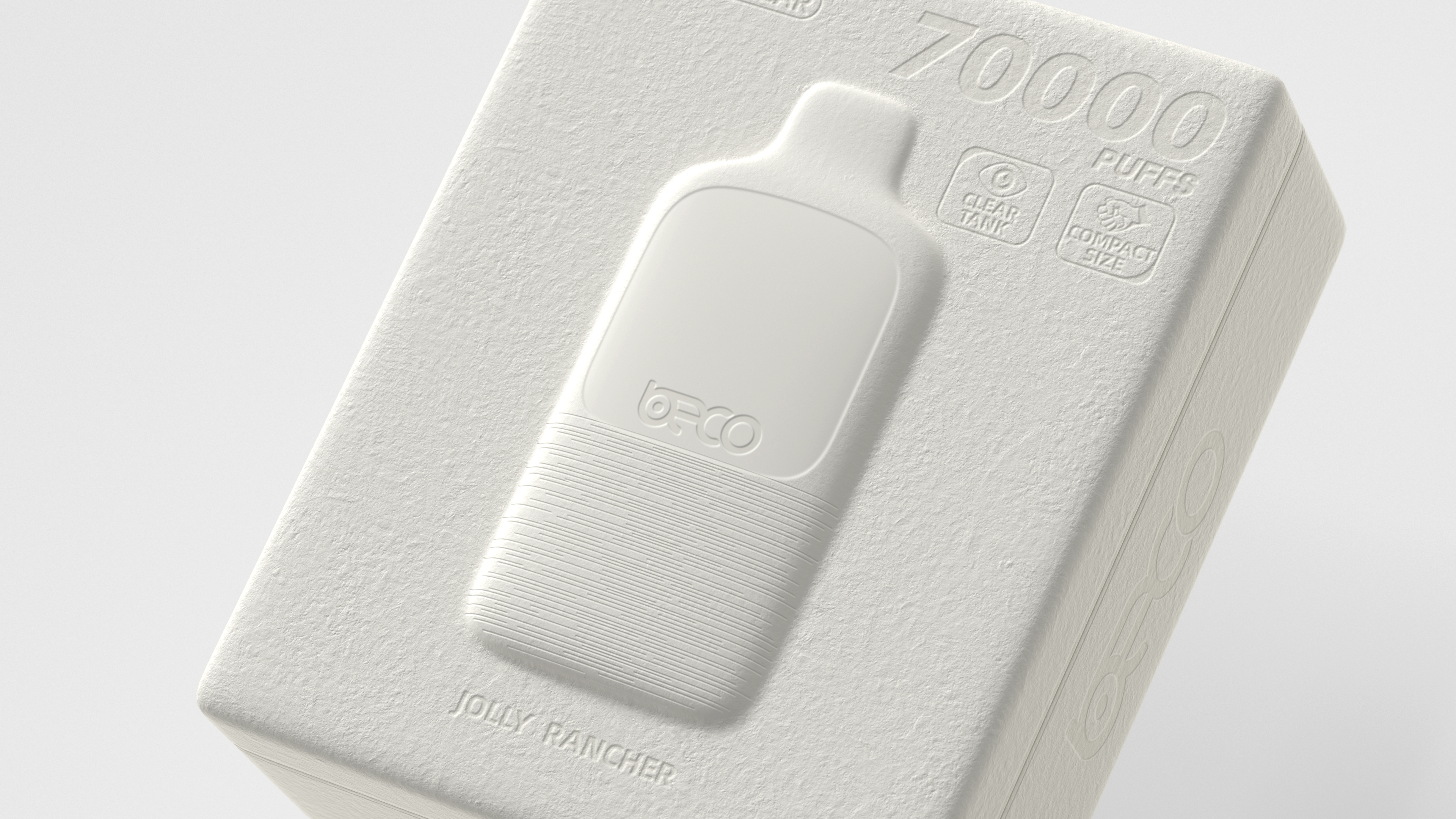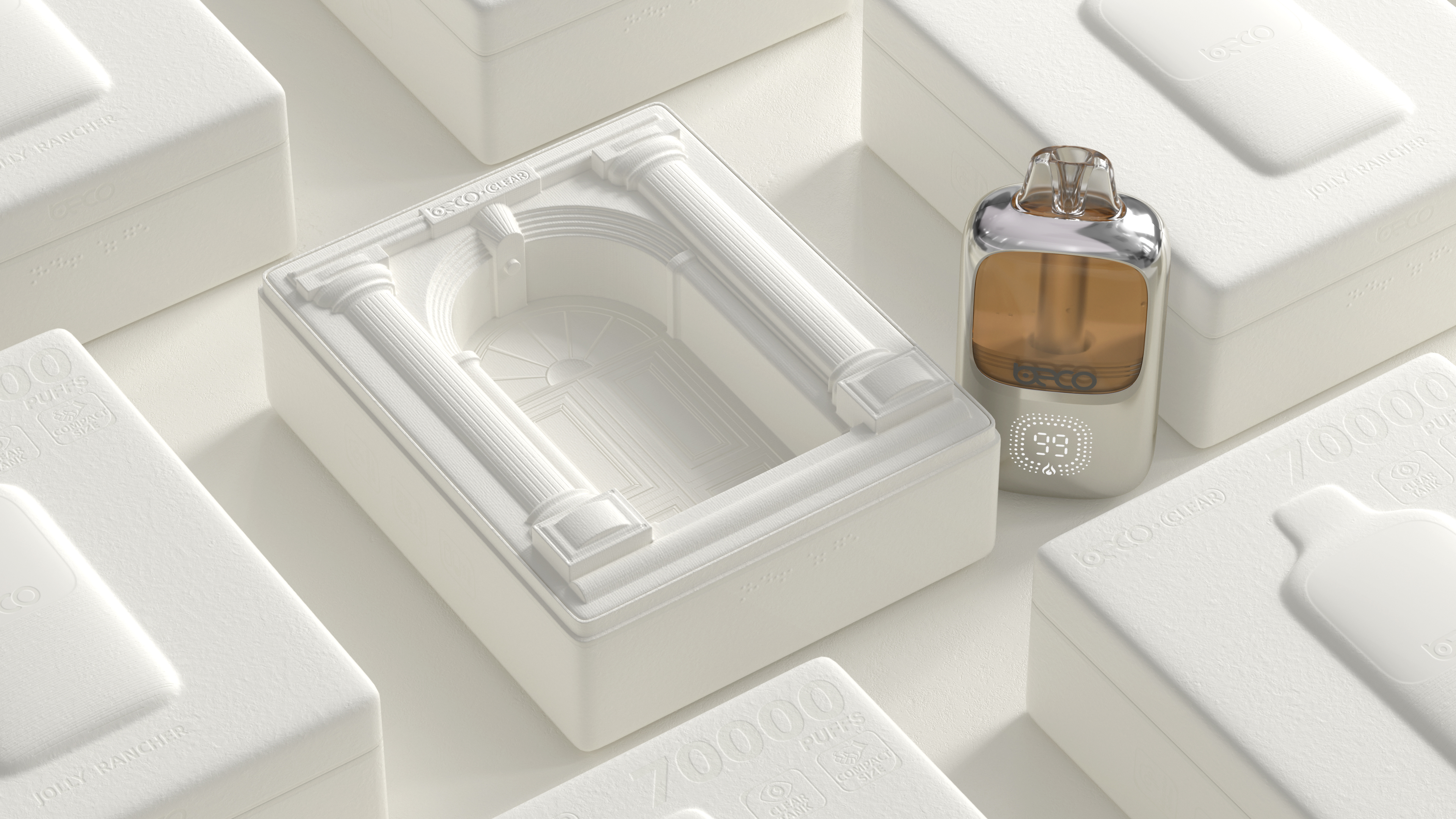 The packaging is centered around 100% biodegradable paper pulp. Utilizing a custom molding process that mirrors the product's form, it creates a structure without seams or excess material. Braille on the side spells out "Hello World," adding a touch of human-centric care and reflecting cultural progress. The natural texture of the paper pulp offers a warm, tactile quality that communicates the eco-friendly ethos. This not only underscores a broader social responsibility but also elevates the design's role in fostering a healthier shared environment. It resonates with the functional purity of the product's clear tank, embodies the environmental purity of biodegradable materials, and, through a lens of Western architectural aesthetics, frames the user experience as "enjoying luxury and purity with every puff."
