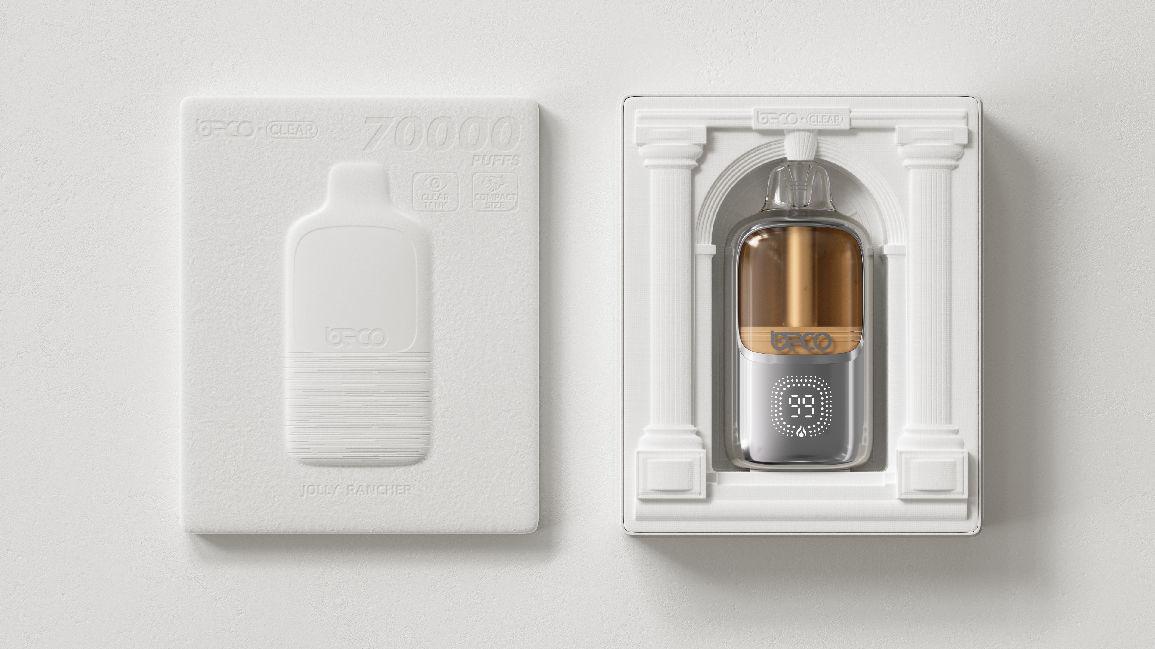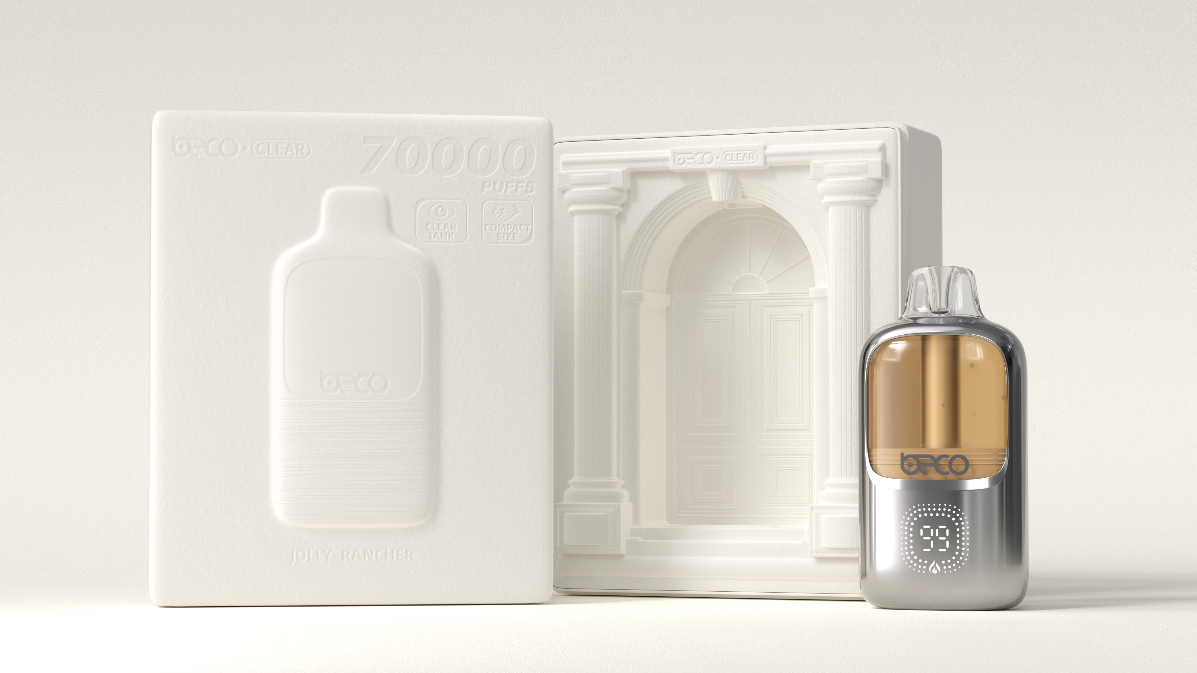 Housed within its streamlined, ergonomic body is a high-capacity 850mAh battery, providing up to 3 days of use on a single charge. The seamless, one-piece molded exterior is designed to fit naturally in the hand. A deliberate material contrast between the molded metallic painted finish and the transparent e-liquid tank adds an attractive tension to the design, while making the e-liquid level clearly visible. beco clear proves that true strength can take a perfectly compact form, combining portability with elegance, and durability with craftsmanship.