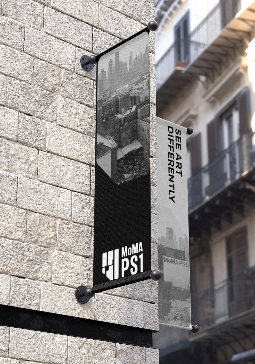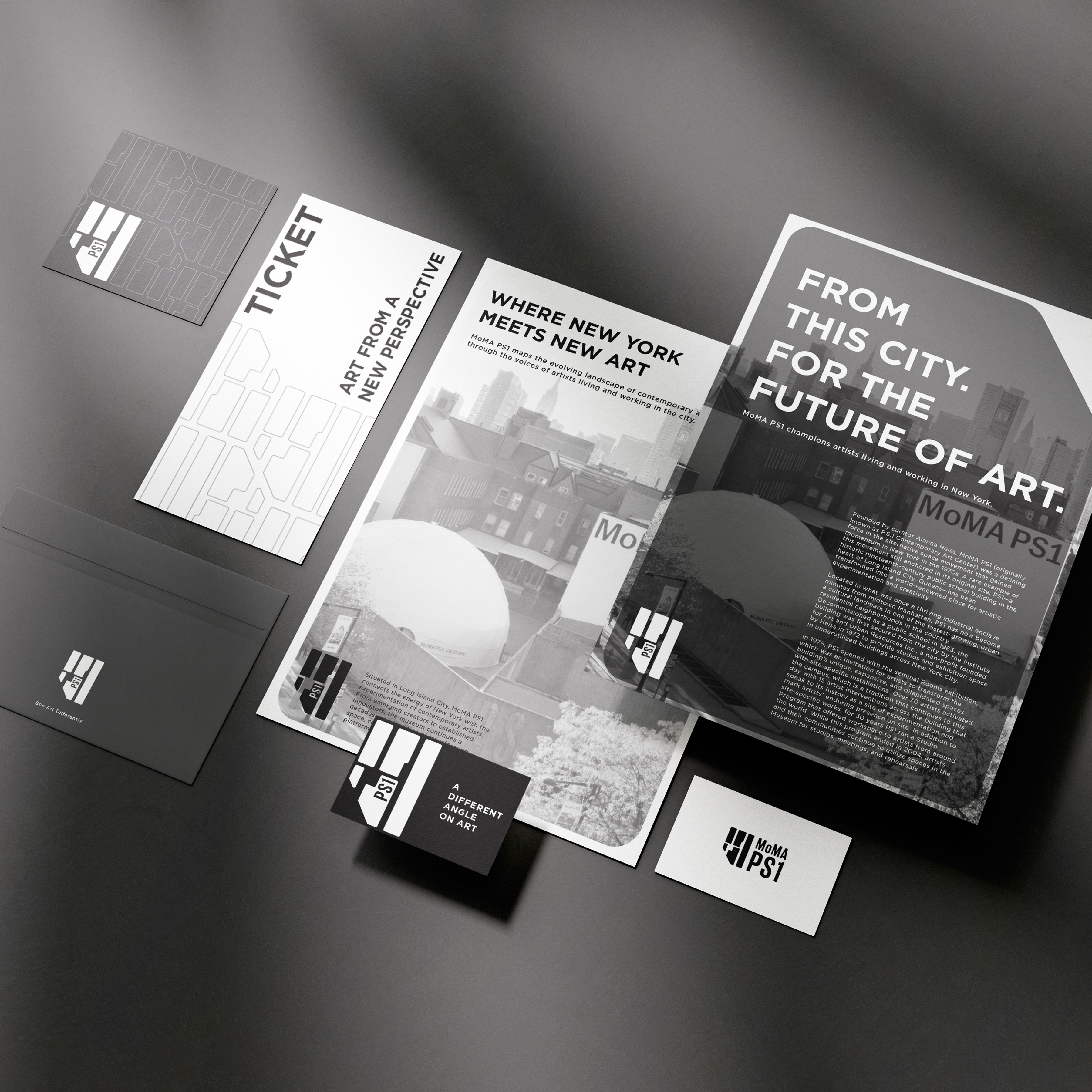 A minimal palette of black, grey, and white allows the artworks to remain the focal point while creating a flexible identity across exhibitions, publications, and digital media. Using MoMA’s existing typeface maintains continuity with the institution while introducing a fresh visual language that highlights PS1’s distinct, exploratory character.