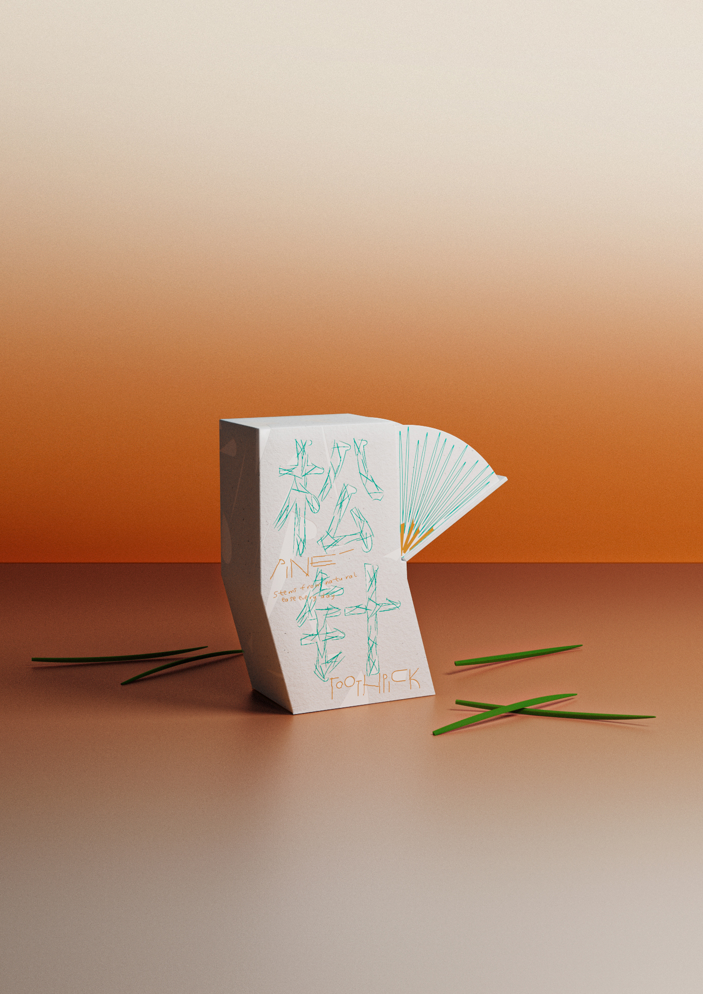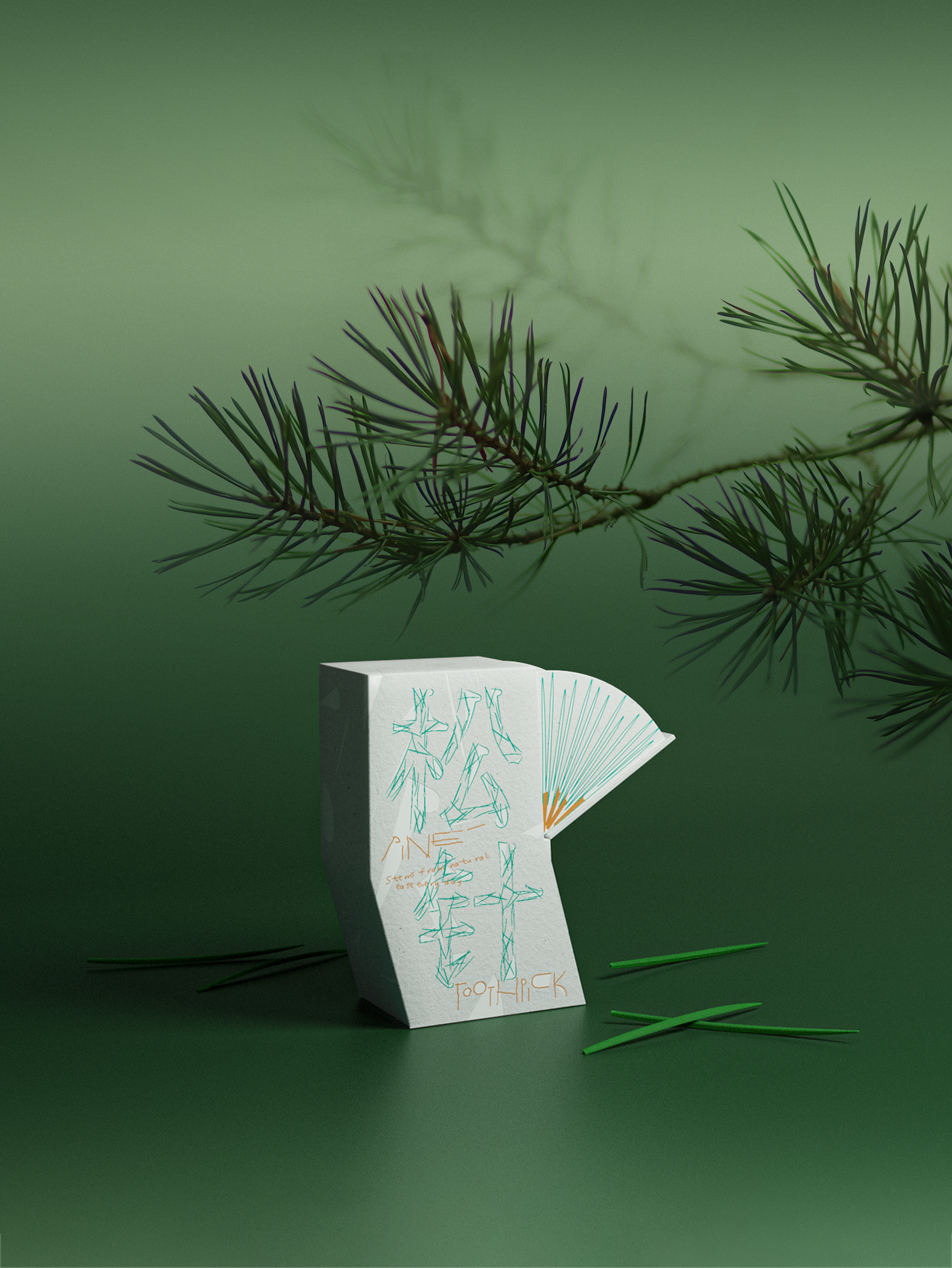 PINE TOOTHPICK is a toothpick design inspired by pine needles. In Chinese culture, the pine tree carries profound and timeless significance, symbolizing unyielding integrity, sincerity in welcoming guests, and its fresh fragrance evokes a sense of purity. We designed green, pine needle-shaped toothpicks to break away from the mundane appearance of ordinary toothpicks, evoking a sense of vitality, naturalness, and delight. Made from HIP (High Impact Polystyrene), it mimics the natural curve of real pine needles, reflecting the resilience of pine. A subtle pine scent and lifelike texture restore the essence of nature. The paper packaging box is shaped to imitate the curvature of a pine branch. When you pull open the drawer, the arrangement resembles a cluster of pine needles, revealing the green, needle-like toothpicks inside.