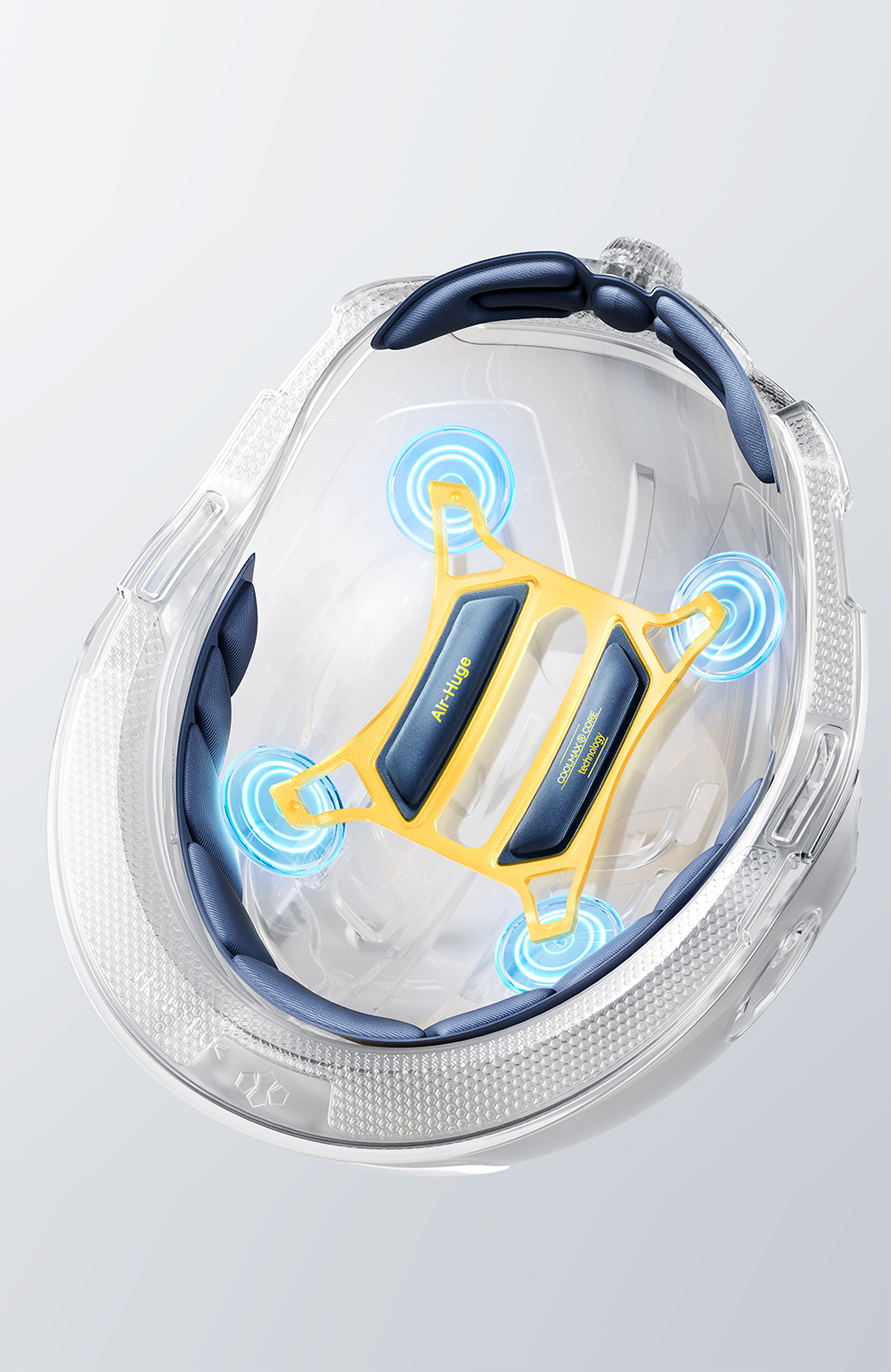 At its core, the patented AirHuge sunroof structure evolves from the ventilation logic of automotive sunroofs. Adhering to aerodynamic principles, it incorporates two sunroofs—a smaller one at the front and a larger one on the top. This allows riders to open either individually or simultaneously based on the wind speed, temperature, or personal comfort, offering three levels of ventilation intensity. At the same time, 32 “spring-flow” air ducts further guide airflow to reinforce air circulation, delivering tested ventilation performance three times greater than that of conventional helmets to completely address the issue of stuffiness. Moreover, the interior 4×4 FASAM module leaves a 1-cm gap between the head and the helmet to create a 360° airflow channel that increases the ventilation area by 28%. Its combination with the CoolMax lining ensures active moisture removal, keeping the rider dry and fresh even during extended wear. The module also employs a four-claw high-elasticity shock-absorption structure to effectively buffer impact, contributing to more comfortable and safer rides.