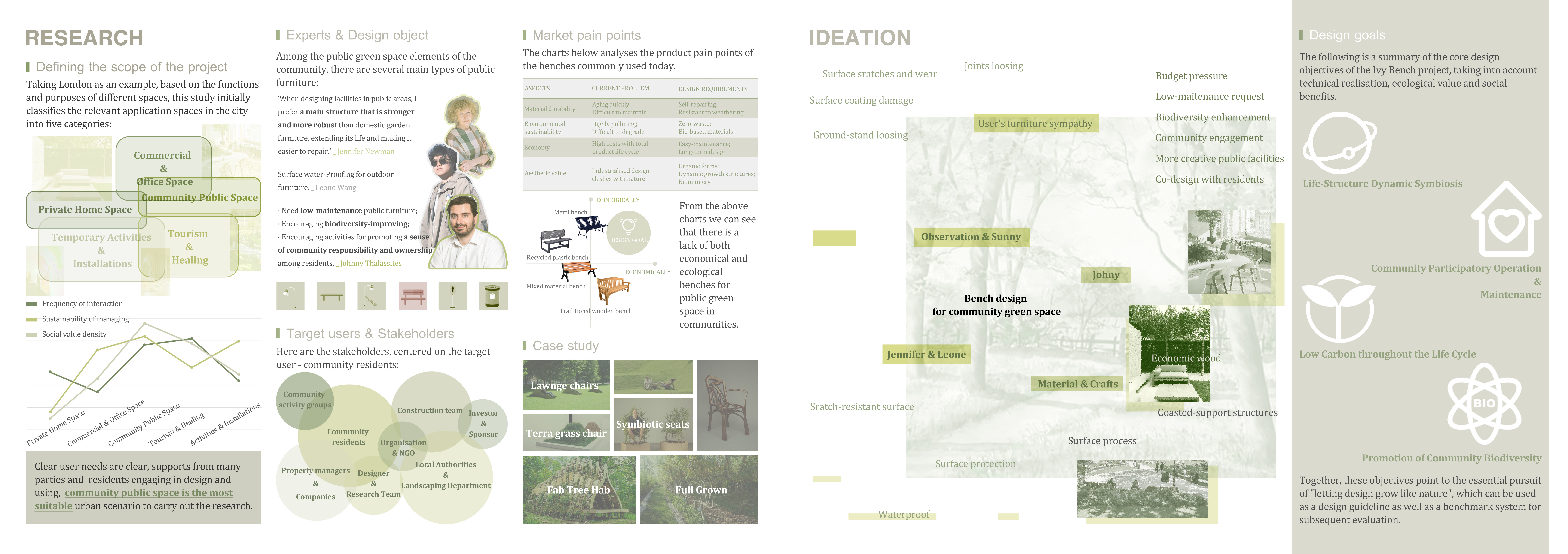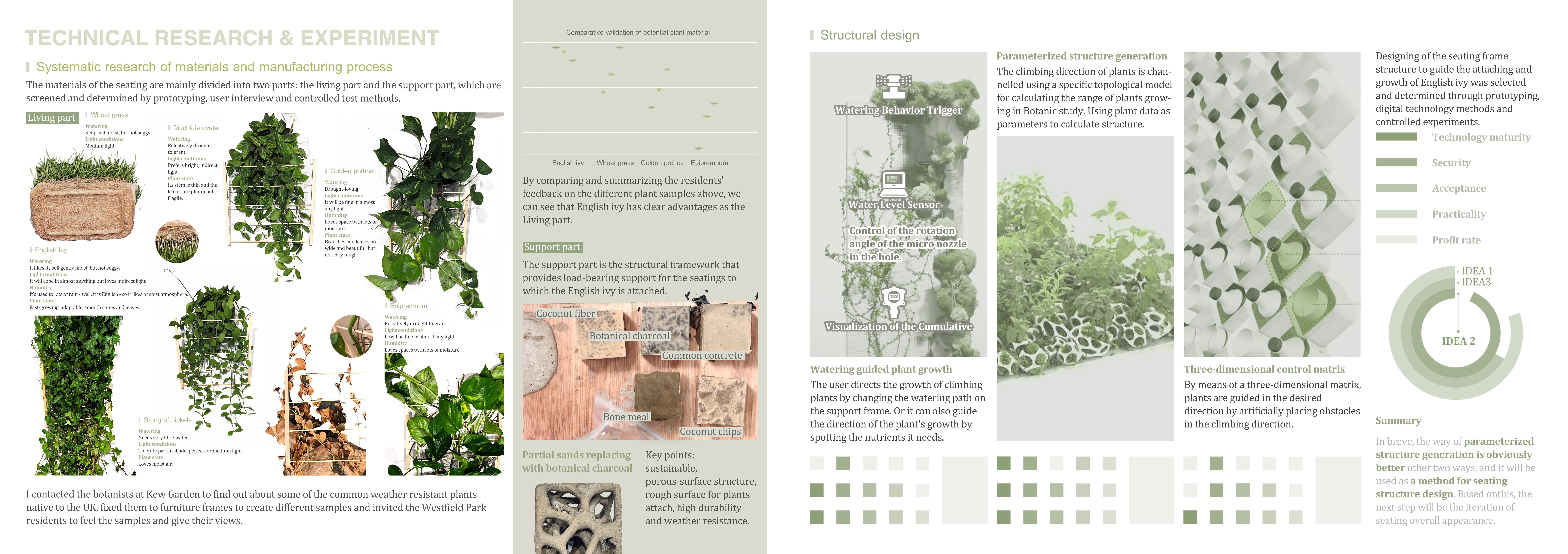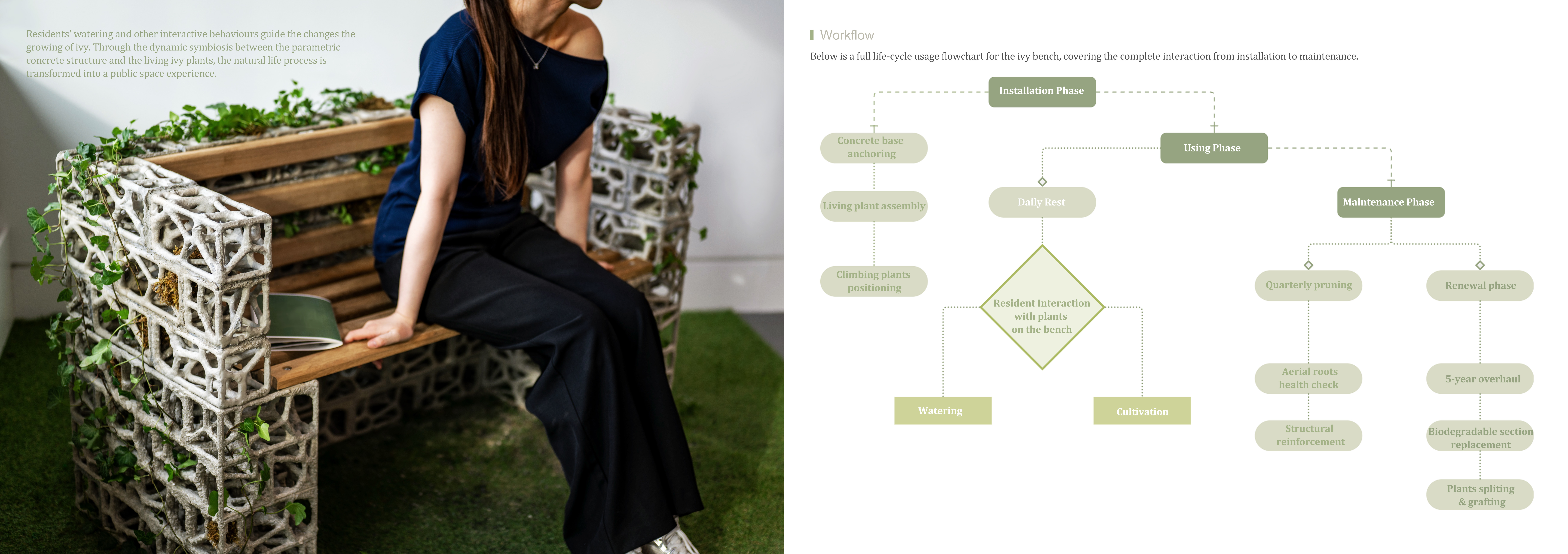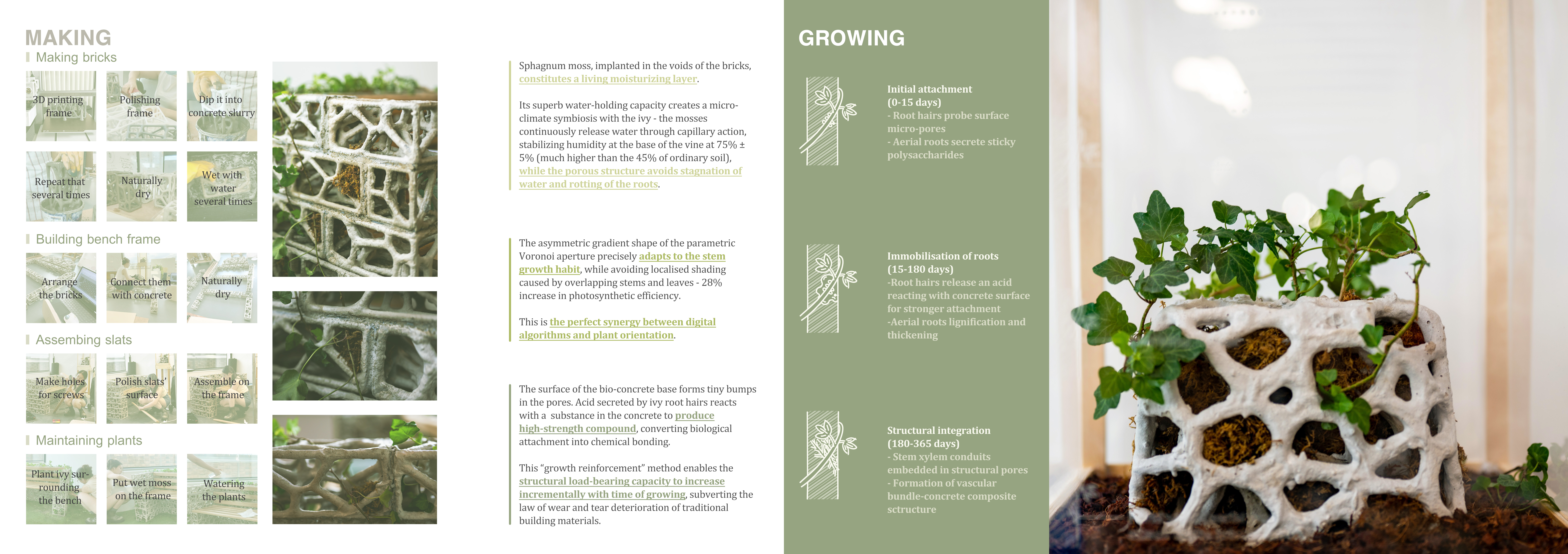 The result is not just a seat, but a co-living system. Over time, the ivy attaches to the concrete through natural root adhesion, forming a composite structure that grows stronger - reversing the typical degradation of materials. What makes this project truly transformative, however, is its social dimension. Residents are invited to water the seat and guide the ivy's growth, turning it into an active participant in daily life. This simple act of care fosters a sense of ownership and responsibility among community members, encouraging them to see public space as something they collectively shape and sustain.