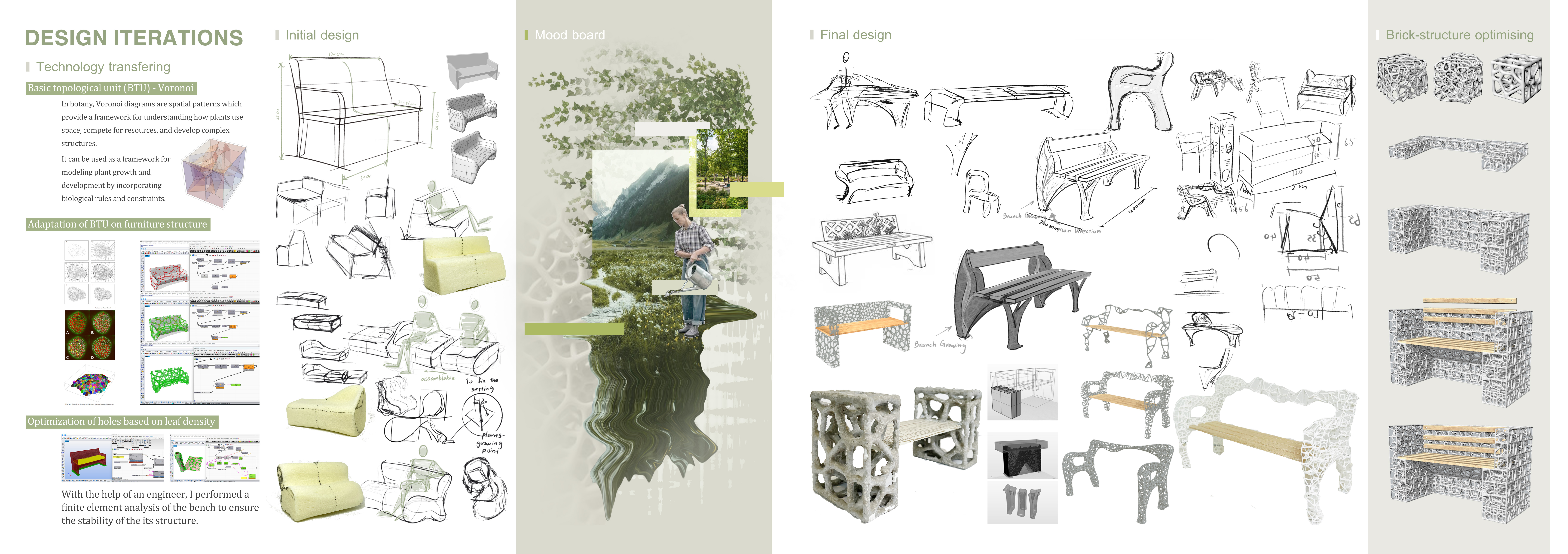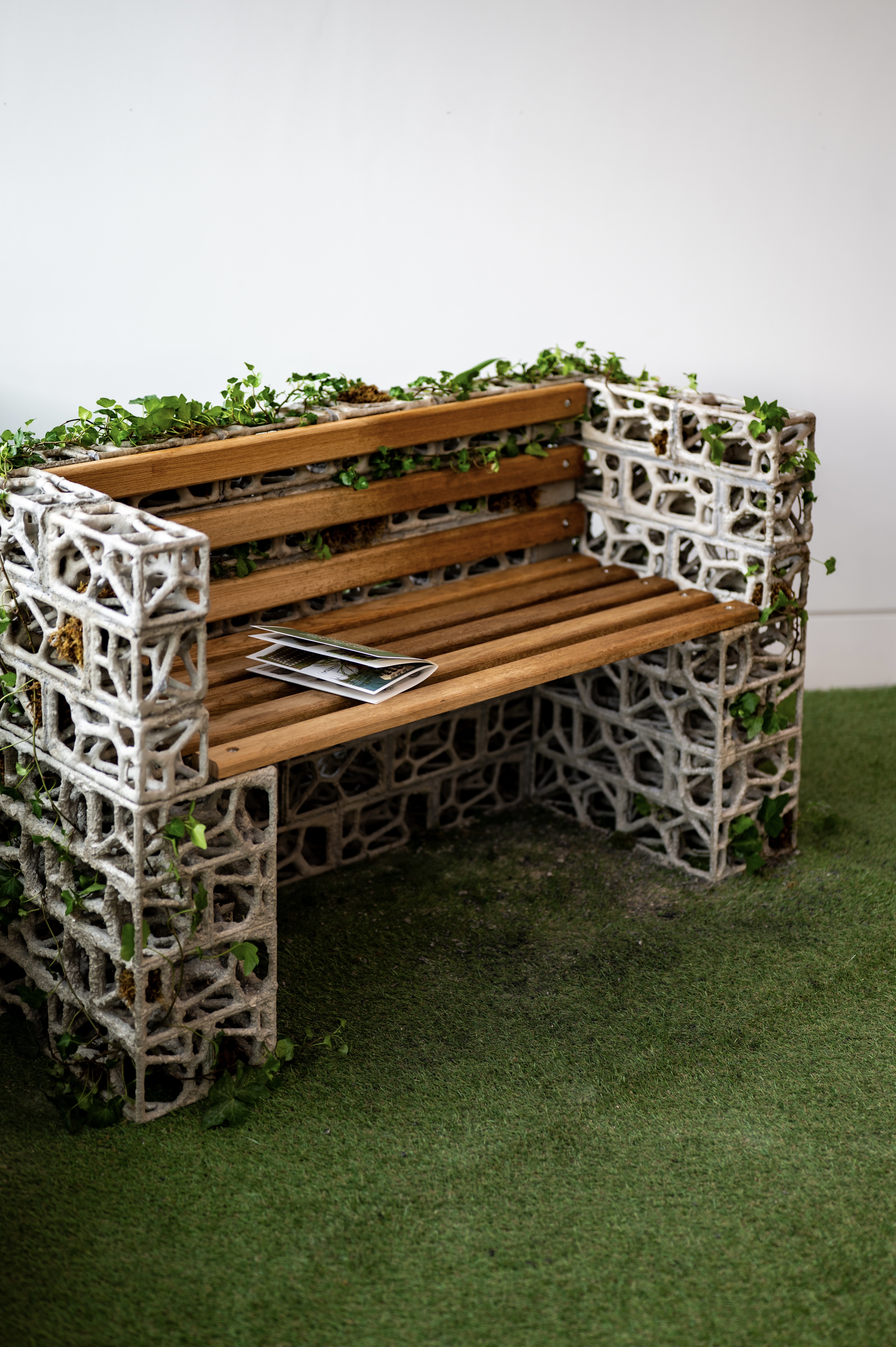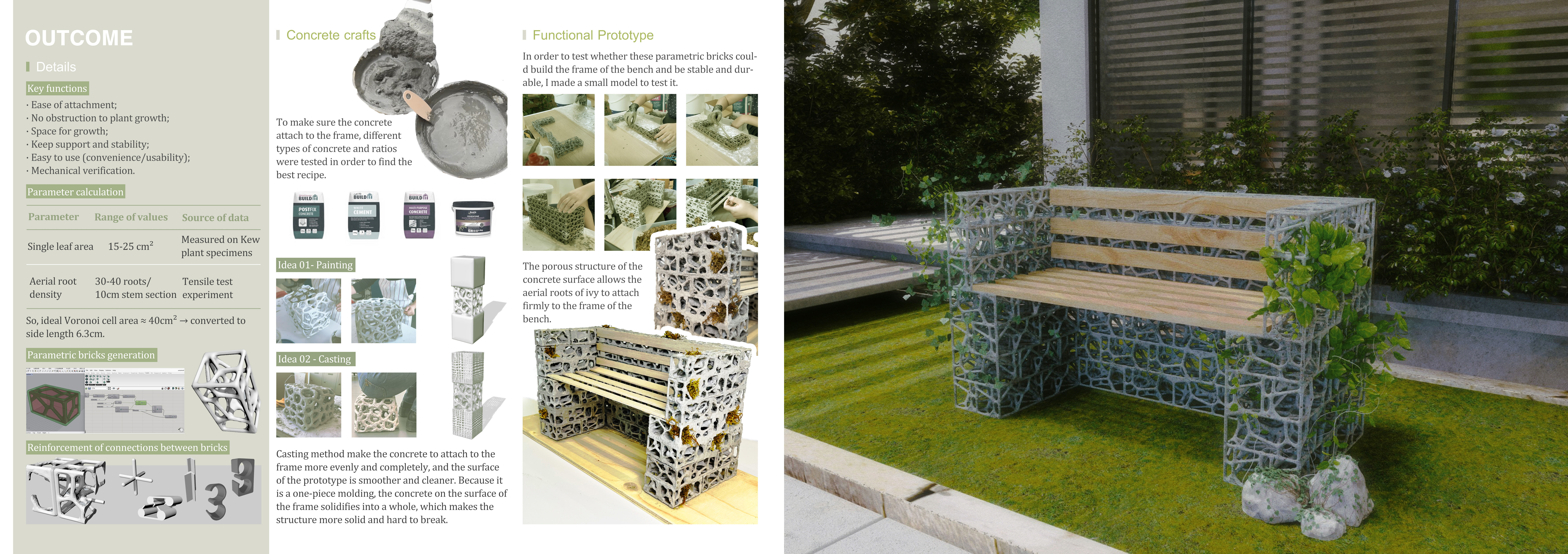 While many products rely on symbolic representations of nature, this design offers something radically different: a dynamic, reciprocal relationship between humans and living organisms. The frame is made of bio-concrete bricks with a porous surface structure, optimized through material experiments to support the growth of English ivy. Its parametric Voronoi-based frame is derived from botanical growth patterns, allowing the structure to physically guide and accommodate the plant's climbing behavior.