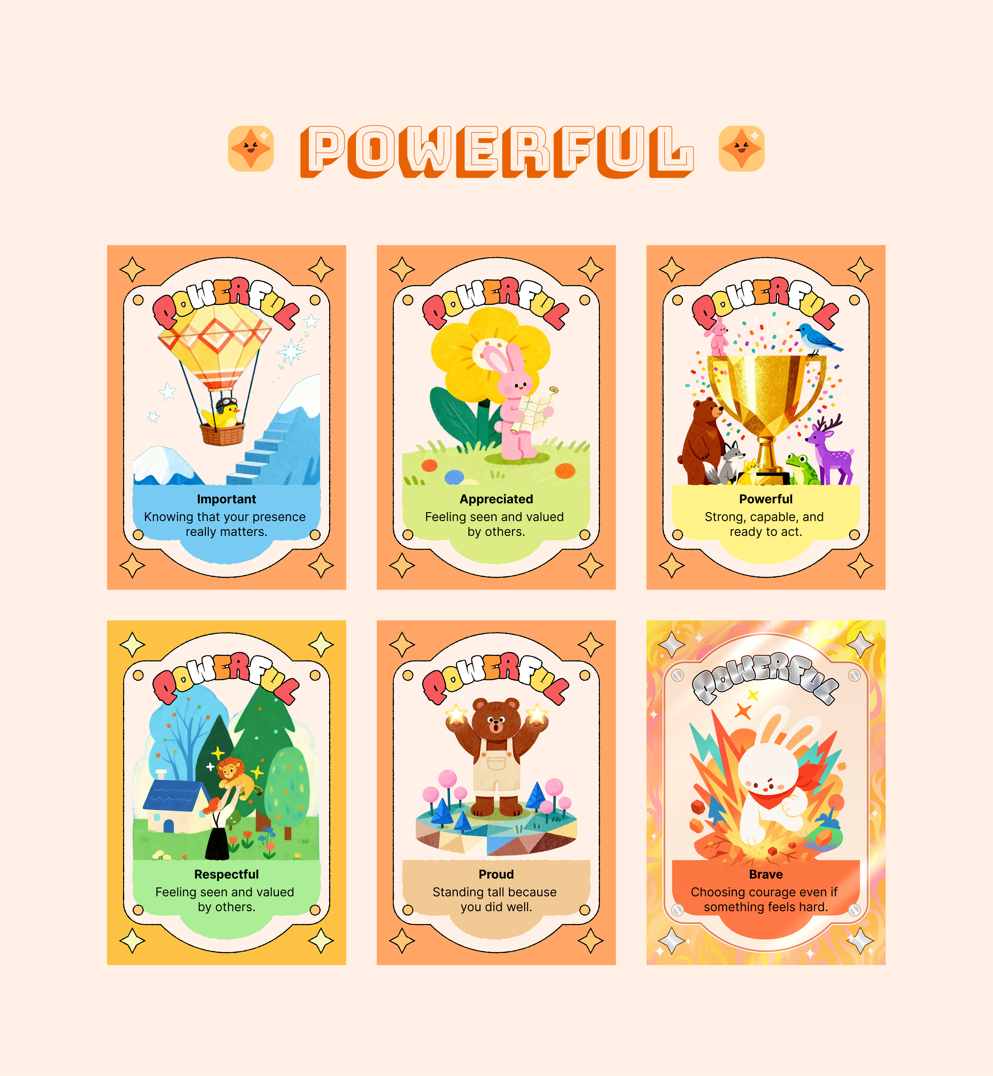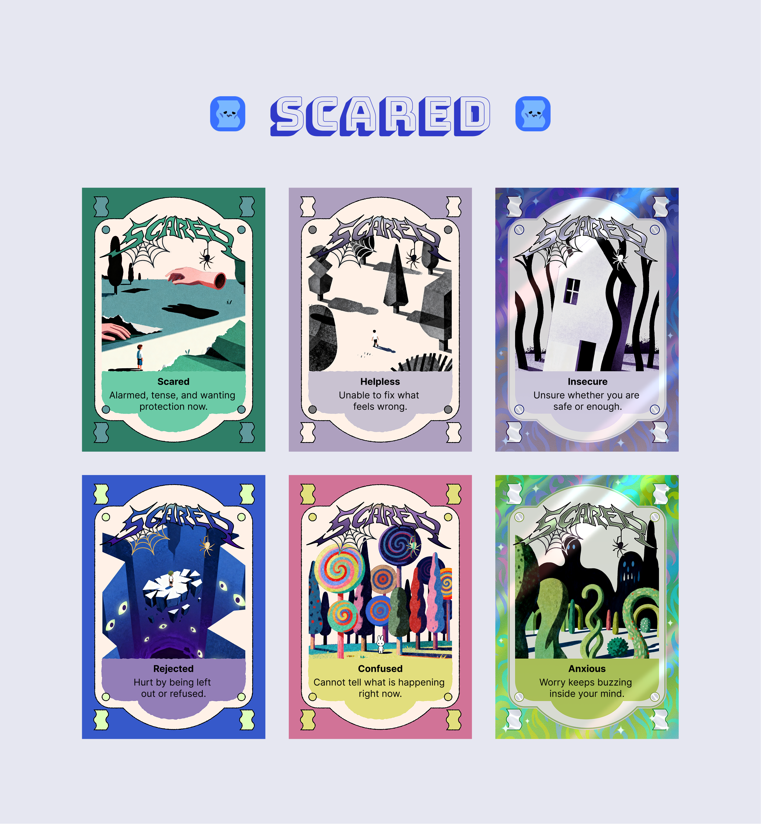The visual system is intentionally warm, imaginative, and child-friendly. By combining structured emotional theory with playful storytelling aesthetics, the cards create a safe and encouraging entry point for conversations about feelings among children, parents, caregivers, and educators.