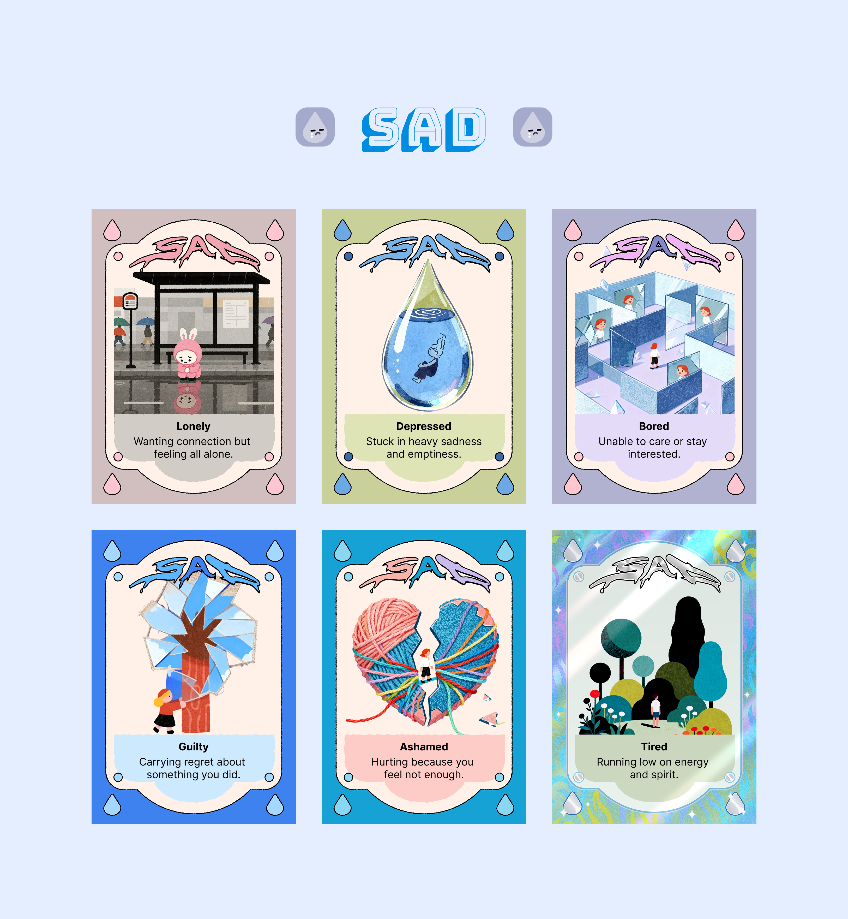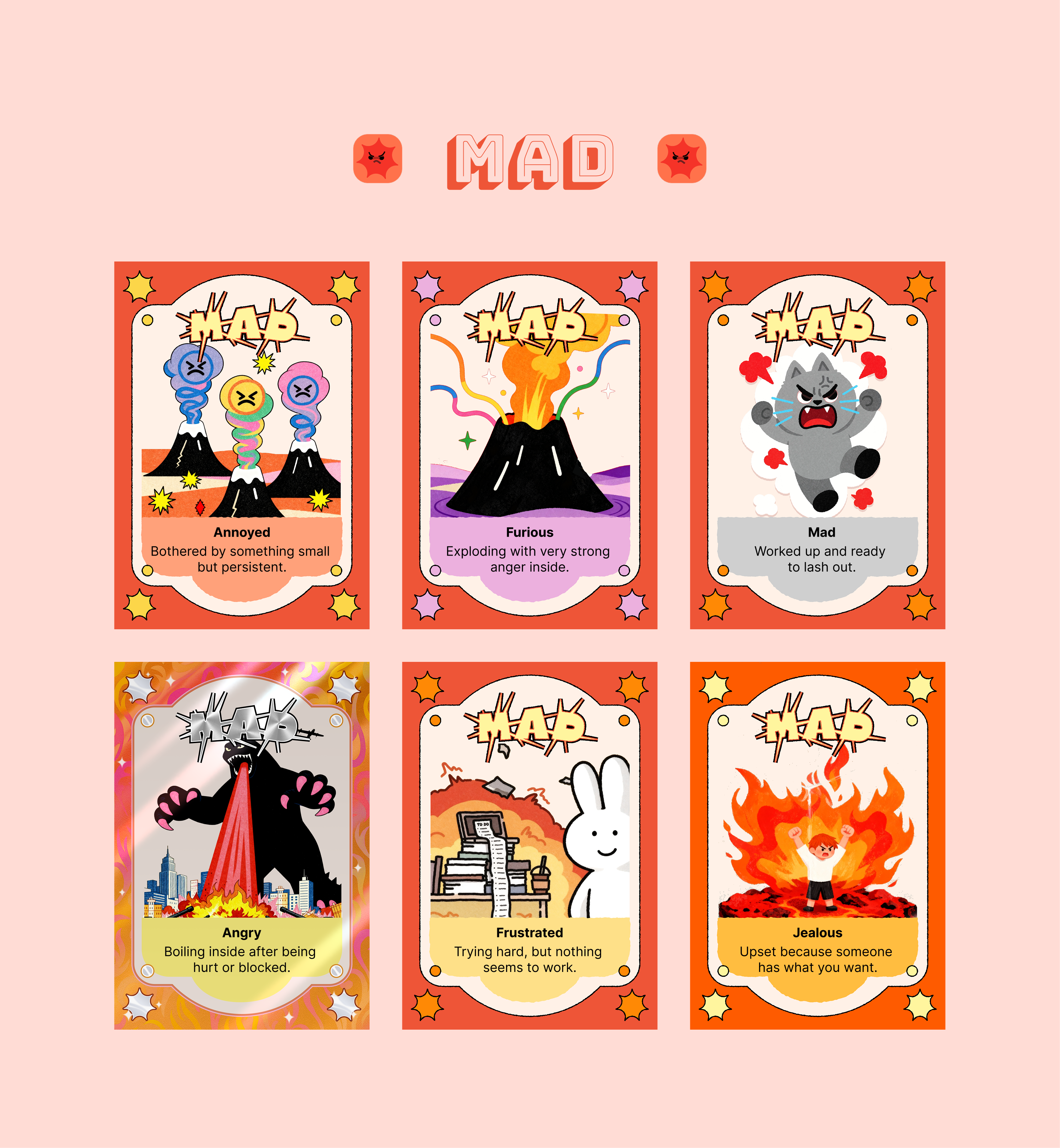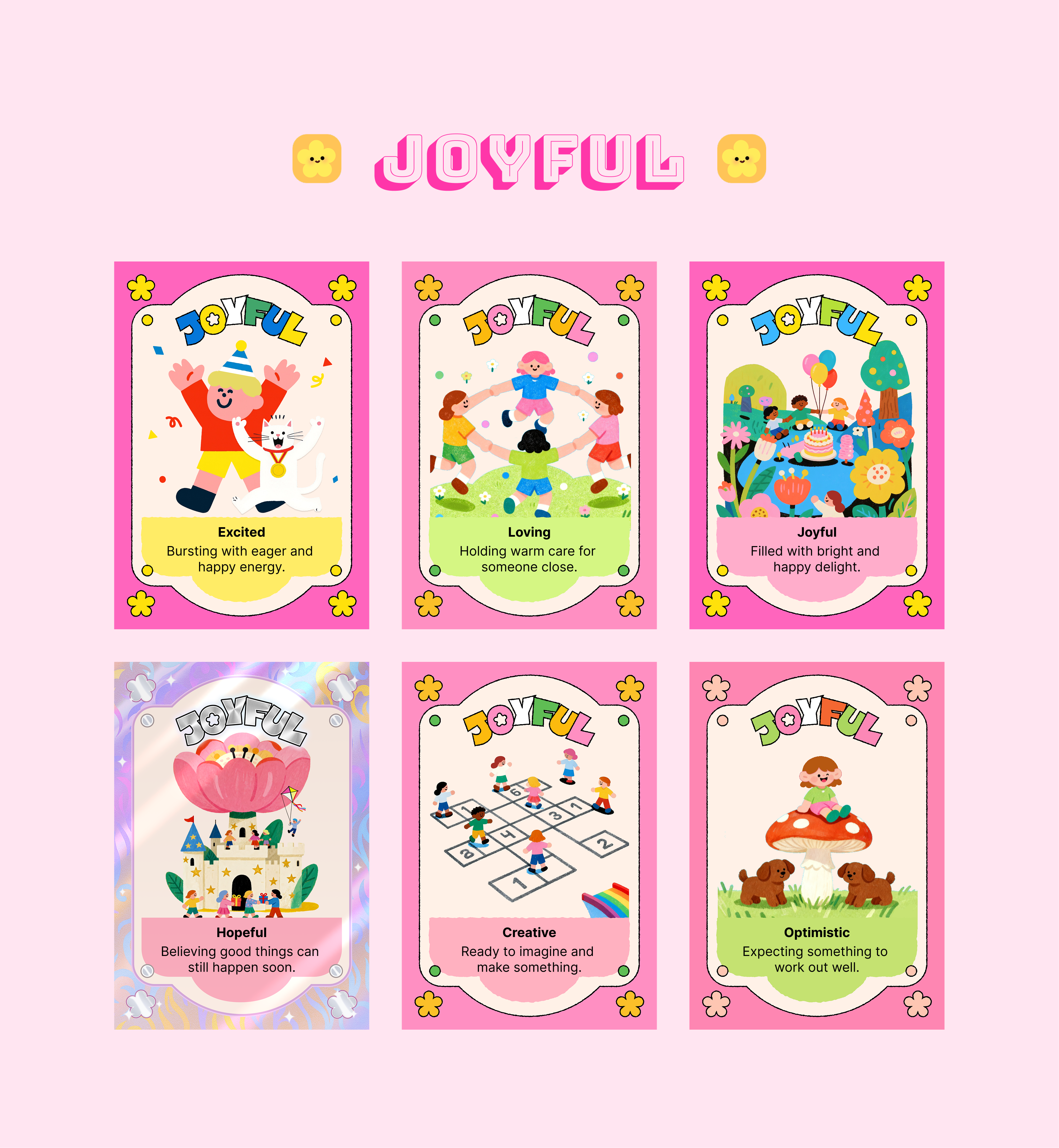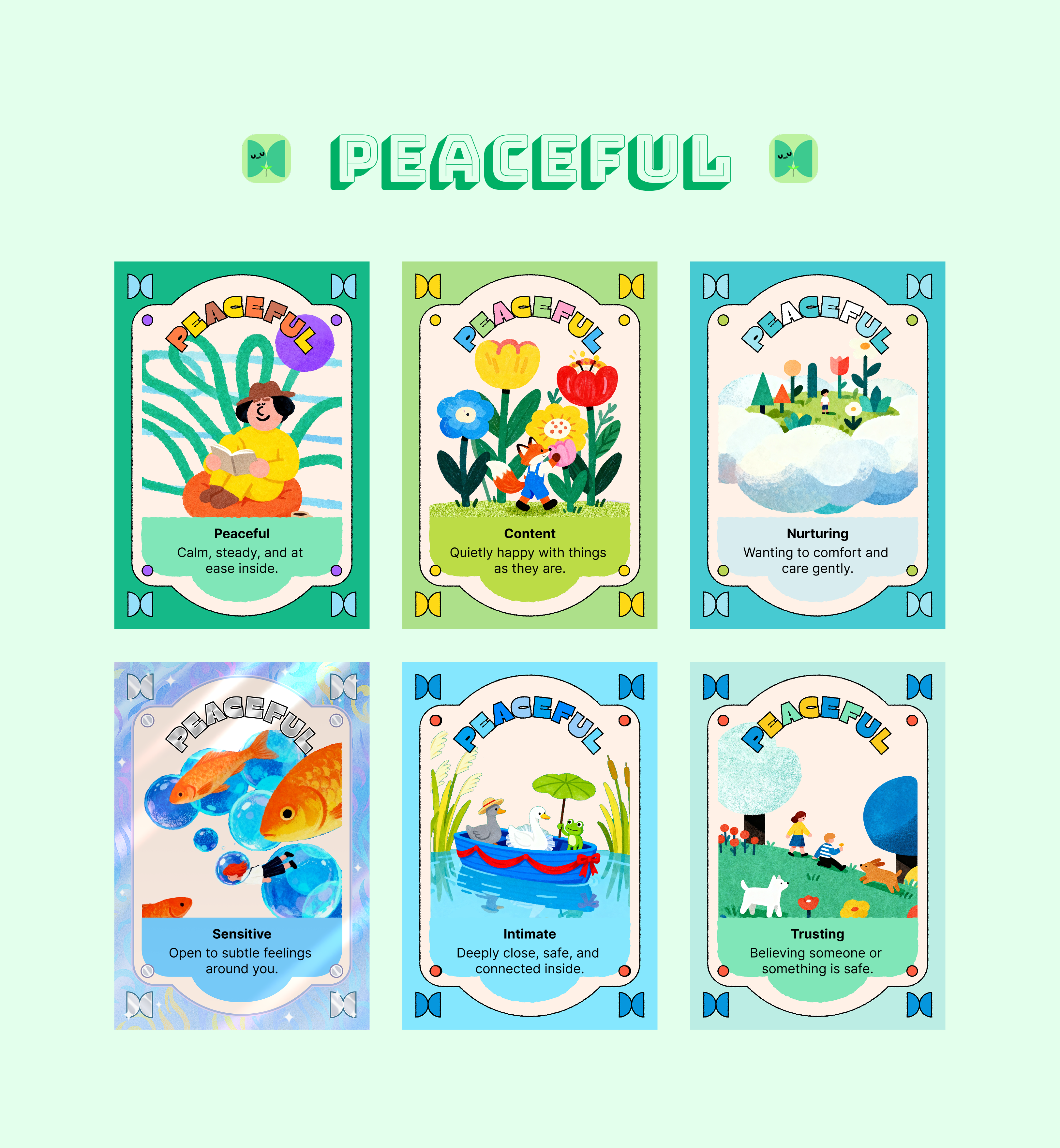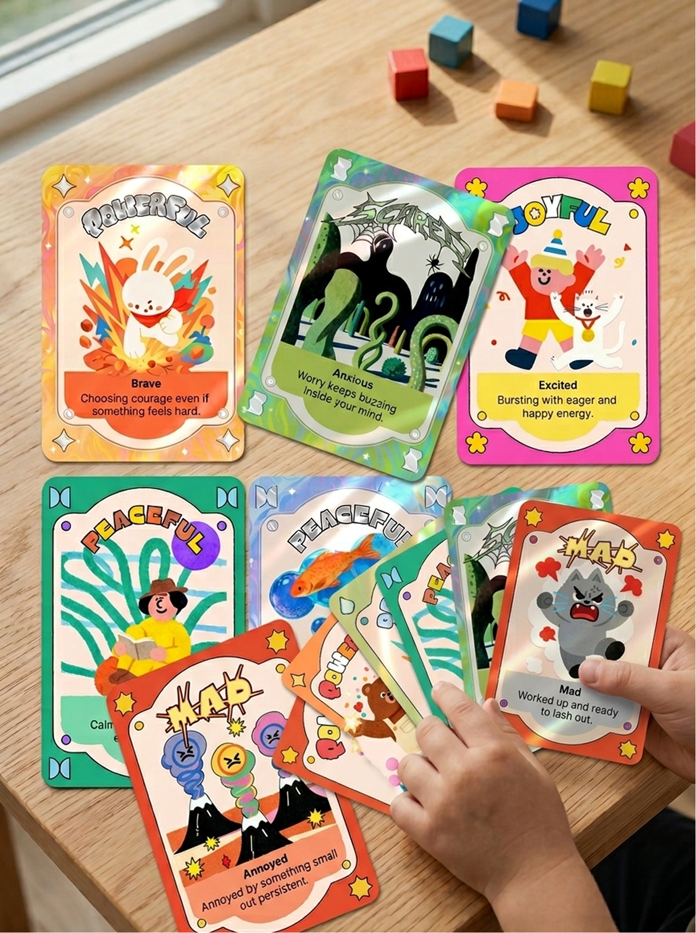 The card set organizes emotions into major emotional families and more specific sub-emotions, helping children move beyond simple labels like “happy” or “sad” and develop a richer emotional vocabulary. Through colorful illustrations, gentle descriptions, and collectible card-like presentation, the design turns emotional education into a visually inviting and approachable experience.