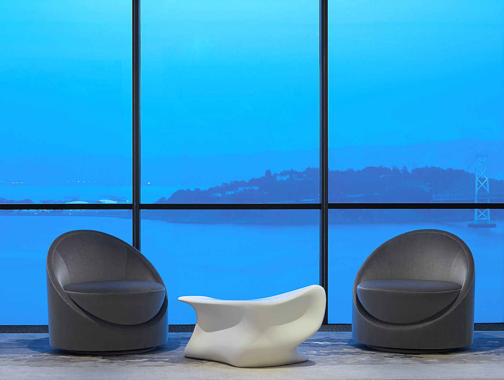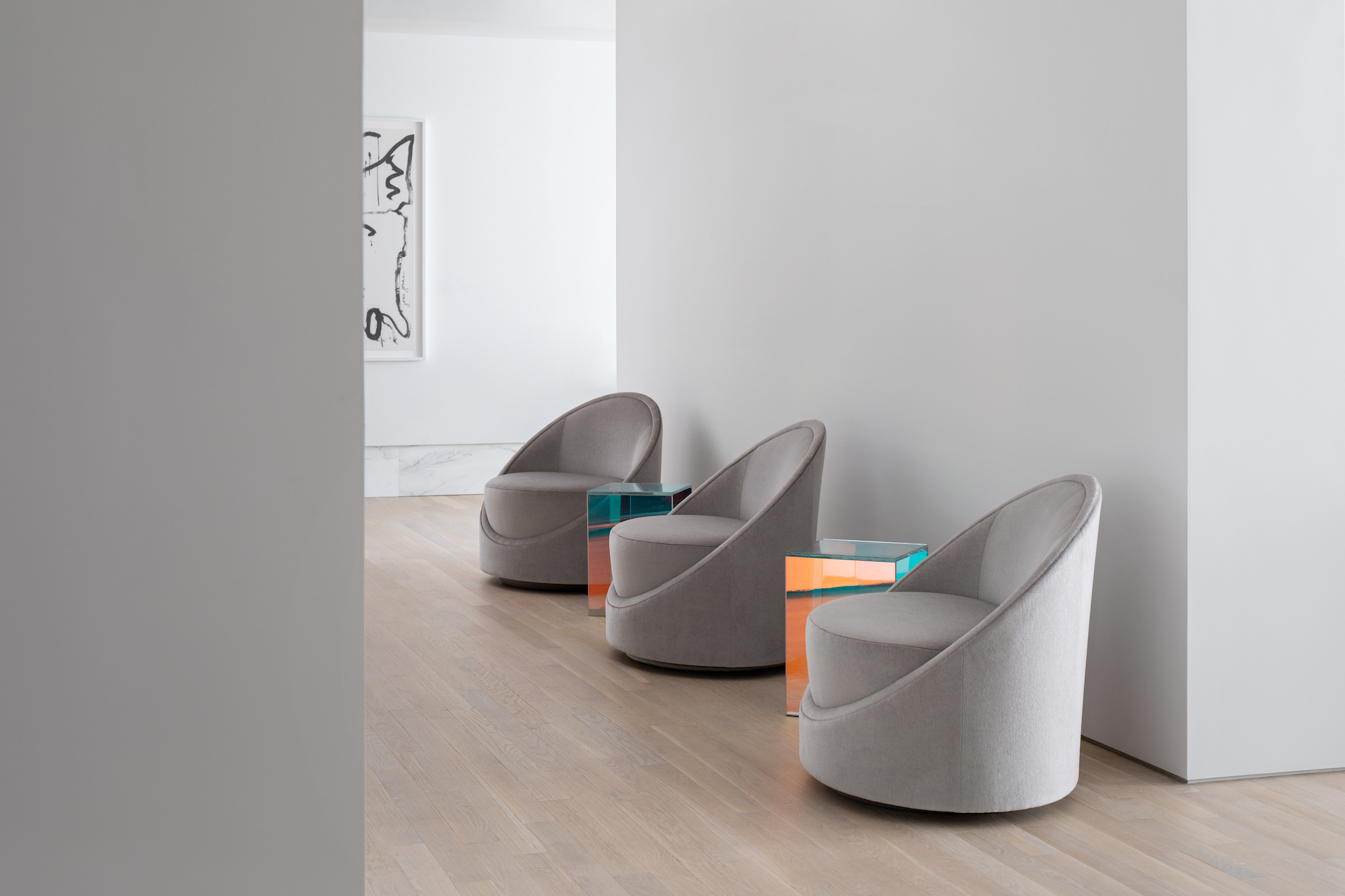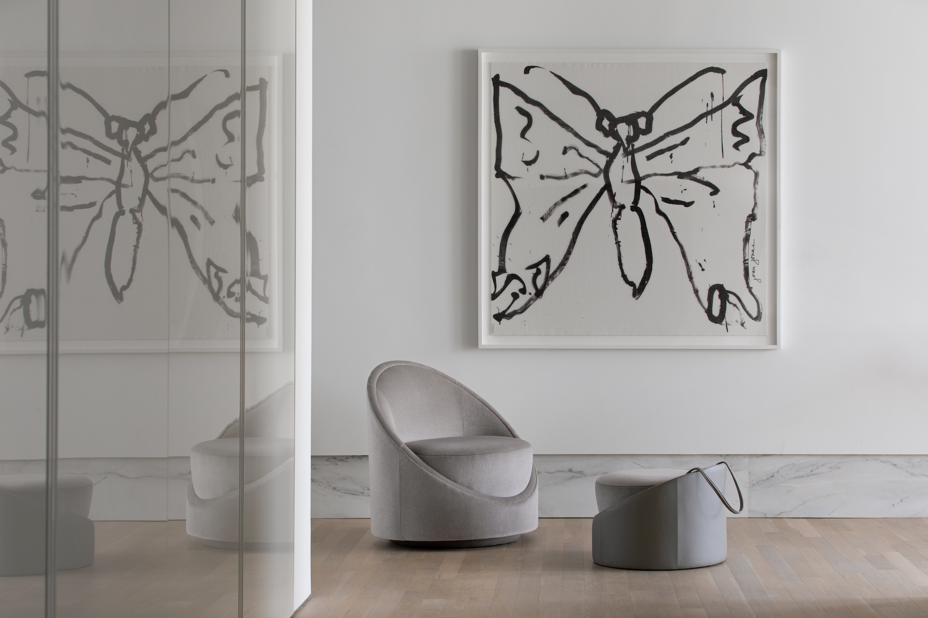 The Artis is a play on sculptural forms with rounded shapes meeting in perfect harmony to deliver a comforting seating environment with a swivel base for added functionality. Mohair upholstery completes the luxe presentation. The mohair selection is due to its strength and durability. The designer feels it important to design for longevity.