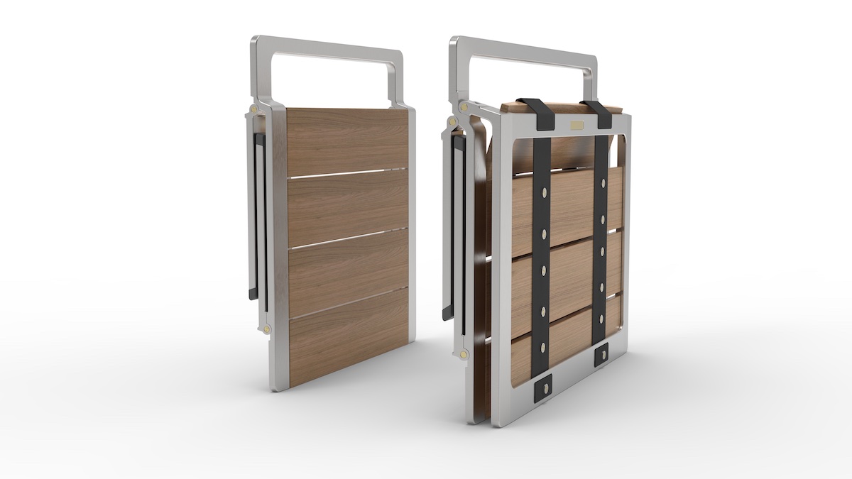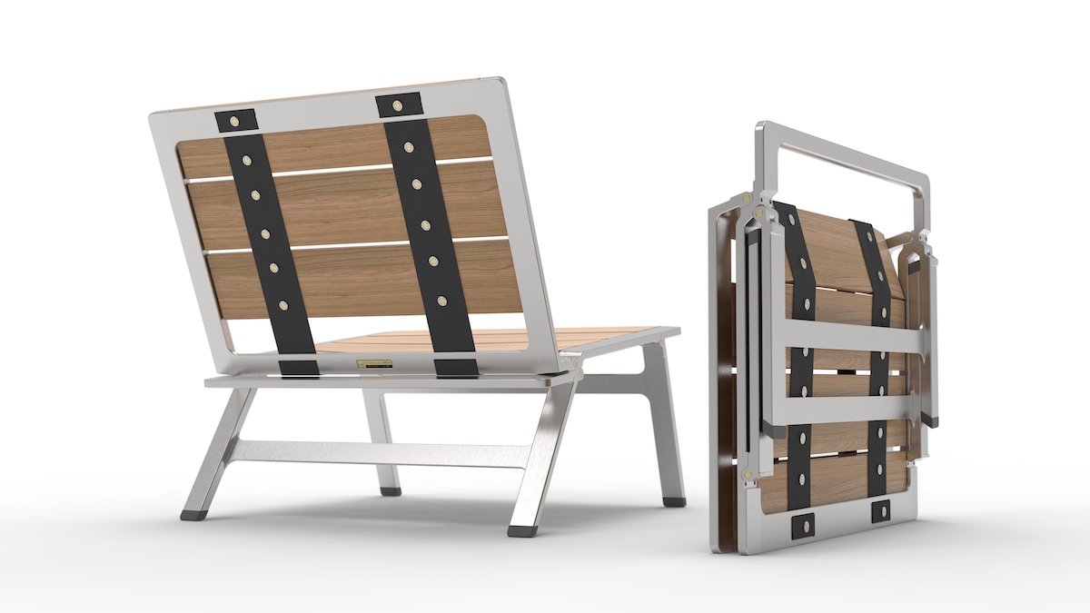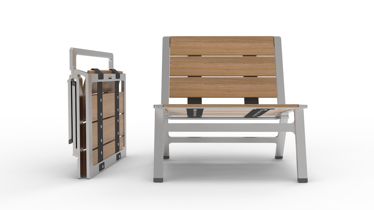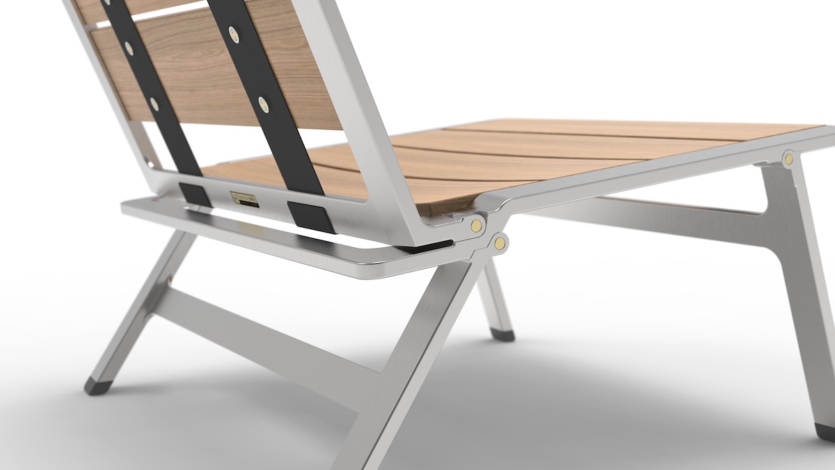 Born of the need for quality compact furniture on yachts, the Decker folding yacht chair easily folds from a lounge chair to a compact form factor that is easy to transport and stow. The teak seating surface is supported by webbing to add flex and comfort in the thin seat surface. Materials common in yachts such as stainless steel, brass and teak are used in the Decker chair to withstand harsh elements. An optional pad snaps into place and stows within the chair when folded. When folded, the Decker chair is only 4 inches thick and has an integrated handle.
