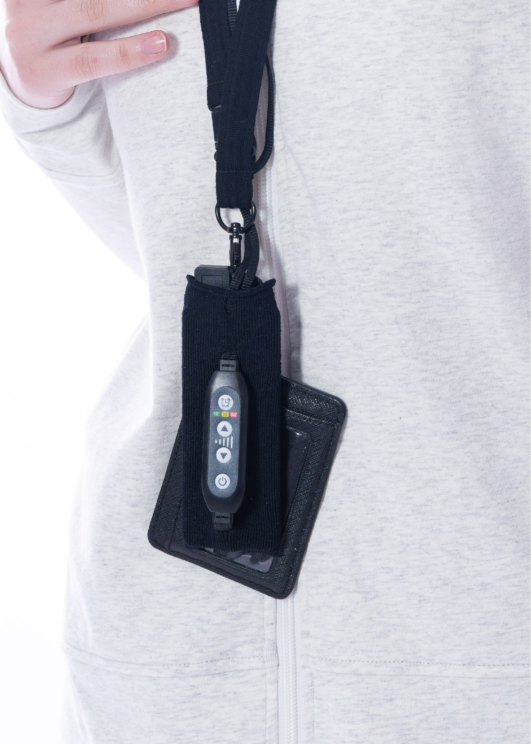 The LanyardWarmer features a safety release clip and a swivel thumb hook to hold the seamless battery carrier together with ID badge, keys, or name tag. The stretchable battery carrier is seamlessly tailored to minimize the weight and bulkiness for holding the control and the ultra-slim power bank, which weighs only 61g.