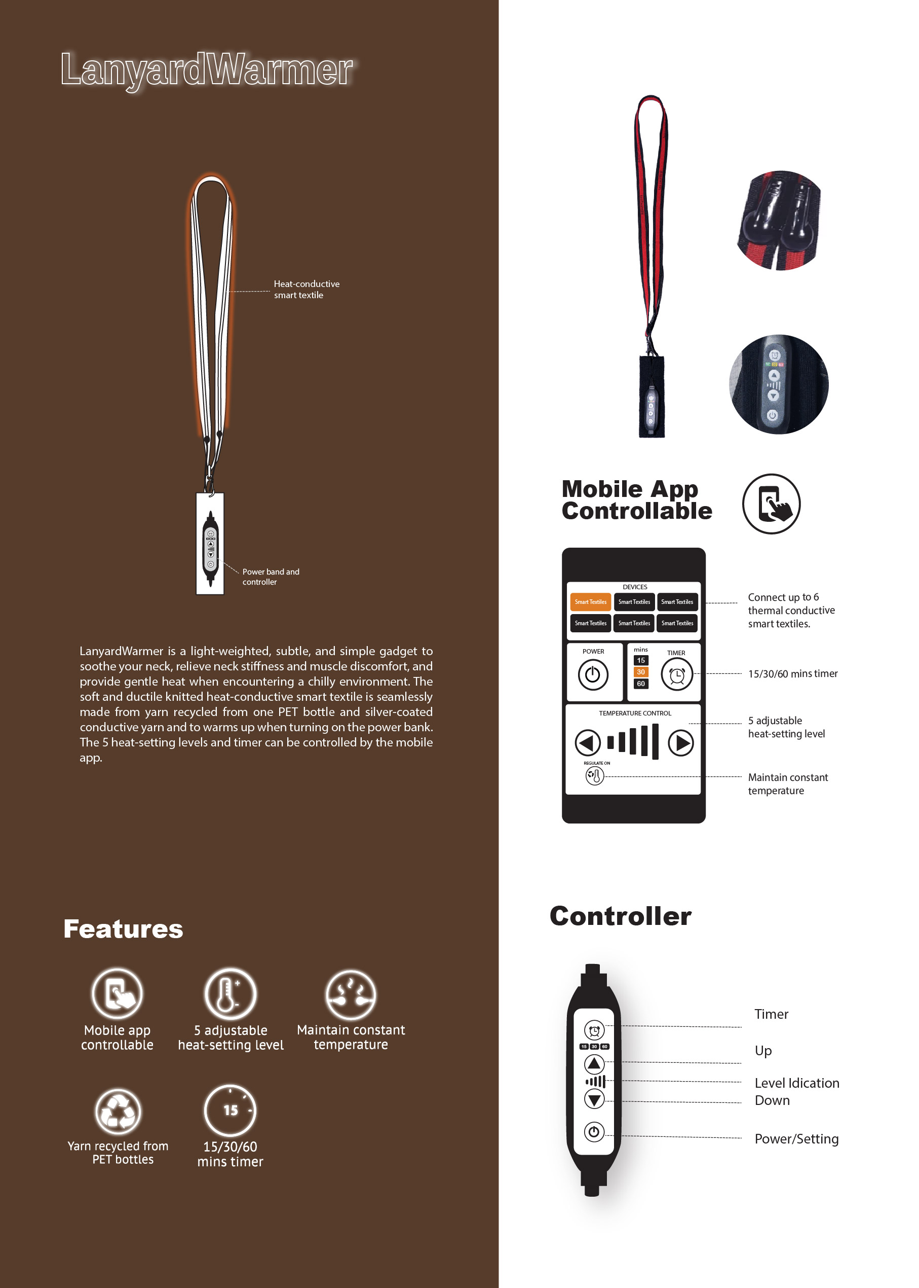 LanyardWarmer is a light-weighted, subtle gadget to soothe your neck discomfort, relieve neck stiffness, and warm you up in a chilly environment. The first-of-its-kind soft and ductile heat-conductive smart textile is seamlessly made with recycled polyester yarn from PET bottle waste and silver-coated conductive yarn to generate heat energy from resistance once plugged to a power bank and give a gentle sensation like the skin under the sunshine. It warms your neck and chest in giving a heartwarming touch.