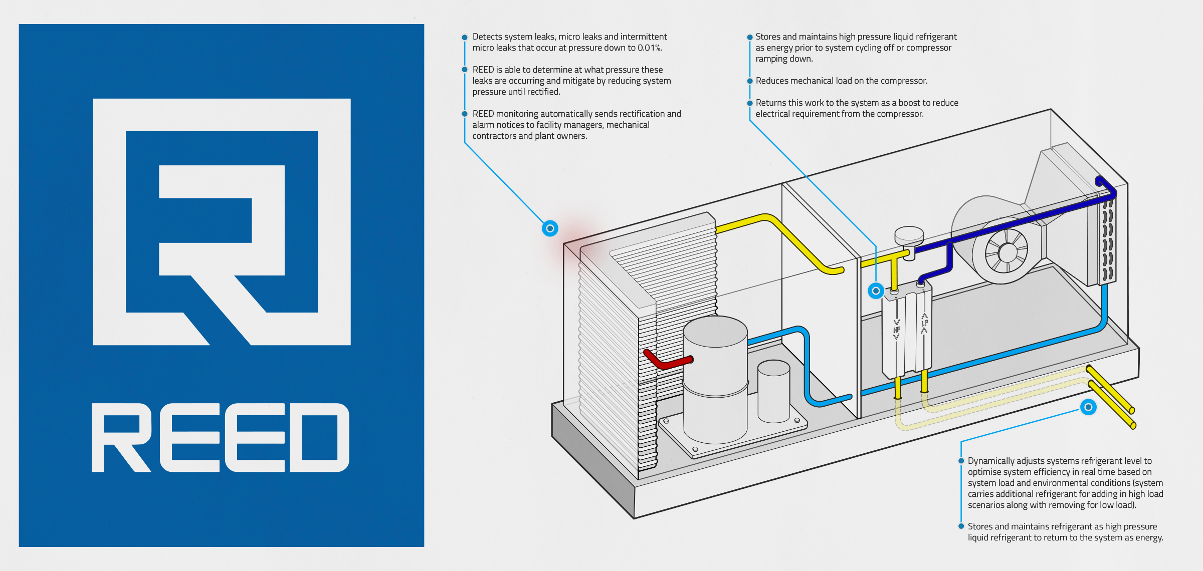 The Regulating Energy Efficiency Device (REED) is a revolutionary energy saving and leak mitigating technology developed for commercial HVAC-R. REED was designed around the second law of thermodynamics, utilising normally wasted energy to improve system efficiency. REED harvests and stores refrigerant energy which is lost through normal system operation. REED then uses this ENERGY like a battery to reduce system energy requirements, saving electricity and reducing system wear, which extends plant life.