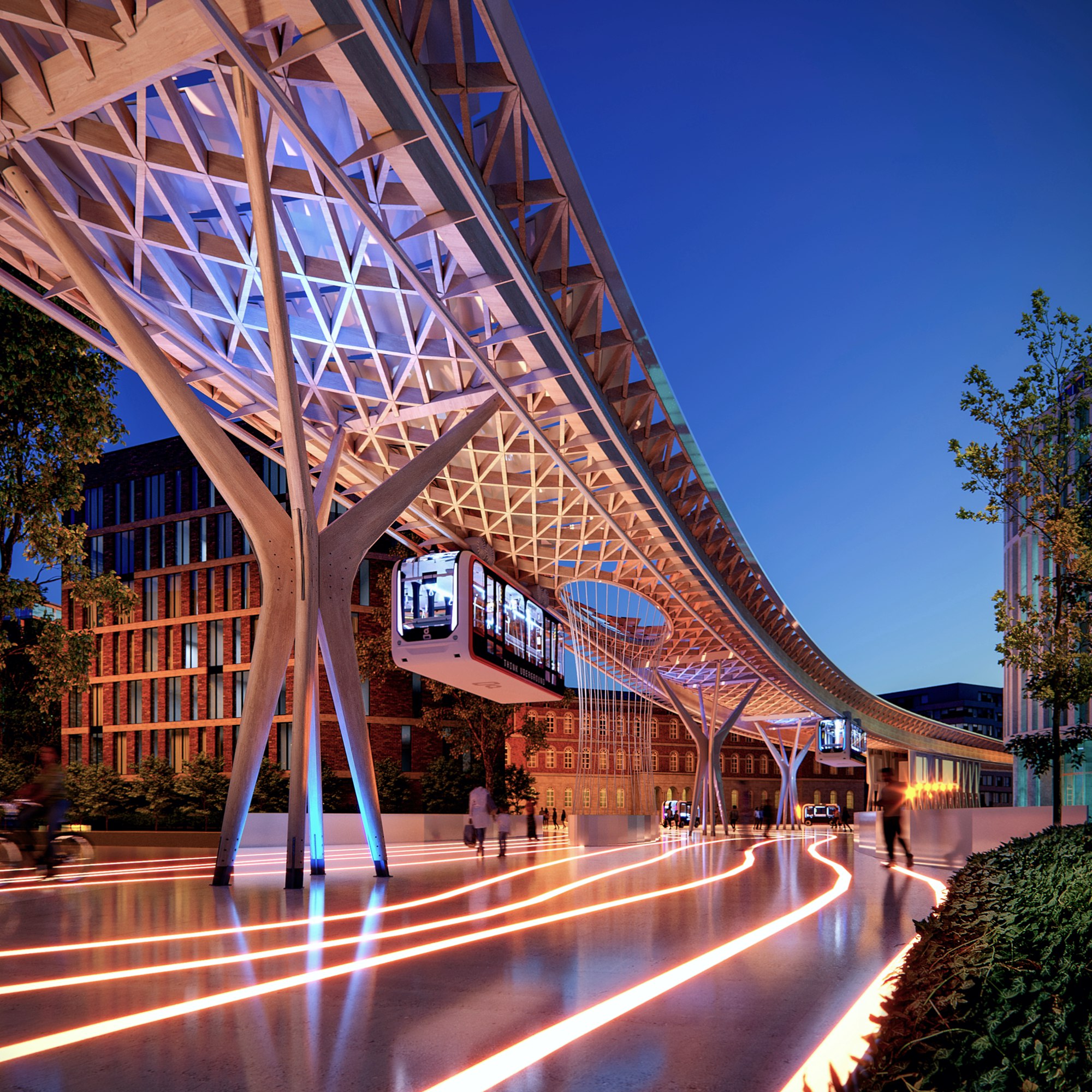 The Sunglider Smart Uberground Metro is about re-inventing public transport in the age of decarbonisation and climate resilience. Some experienced volunteer enthu-siasts from universities in Osnabrück (D) and Warsaw (PL) want to make cars obso-lete in their community by conquering the +1 level with identical autonomous peo-ple movers, express goods movers and small autonomous buses to serve the last mile on the ground. The metro is to be powered 100% by self-generated solar energy collected by special PV modules on the "roof" of the metro track. The Sunglider is designed to connect the city centre, towns and cities of »Greater Osnabrück«, the paradigm area, on 14 radial and two annular lines, one of them encircling the historic centre. The overhead railway system and power station is designed with tree-like pylons, treetop-like roofs and wooden stops. All made of glulam, locally recycled and manufactured. The architecture is an iconic urban construction creating completely new urban sensations. The PV capacity on the roof is 250 MW; enough to generate 117% of the electricity the Metro requires, saving 300.000t CO2 p.a.. All Metro vehicles are »offsprings« of former Local Motors Olli to avoid expen¬sive prototyping and to save the valuable experien¬ces of this lighthouse-pro¬ject. All vehicles are 3 D-printed in local micro-factories with 100% recyclable organic composite mate¬rials. The wheel set is a roller-coaster transfer to make the vehicles fast and ultra silent. The vehicles get power through induction. The Sunglider is supposed to reduce car traffic by 60 % - if not completely. Mainly because the Metro has a wait-free service control¬led by AI (a glider arrives every 5 Min, day and night just in time) and it is free of charge; the main two arguments why people will leave their cars at home. Sunglider’s economy reduces the investment drastically and cuts O&M costs of public transport. This is offset by unique opportunities: selling huge surplus power, trading CO2 certificates, leasing cargo services. Sunglider disrupts the expensive and backward Public Transport. That’s why Sunglider is free of charge, still making a profit!! The Sunglider Smart Uberground