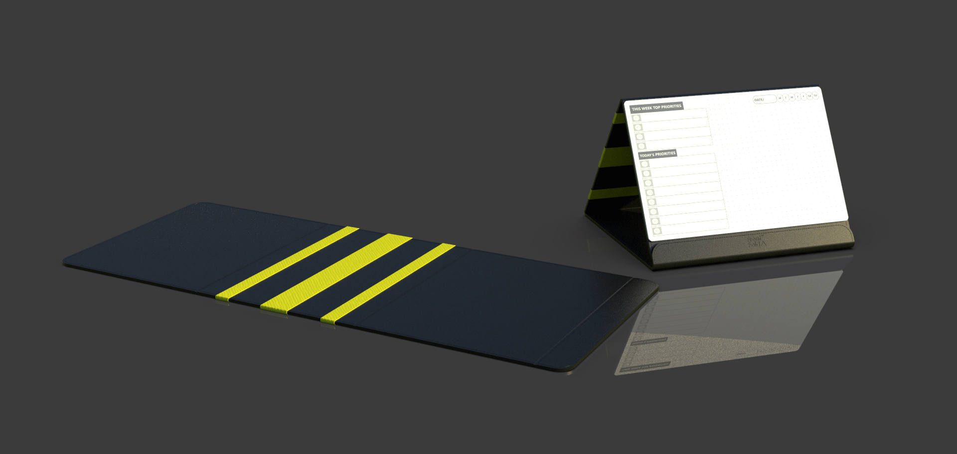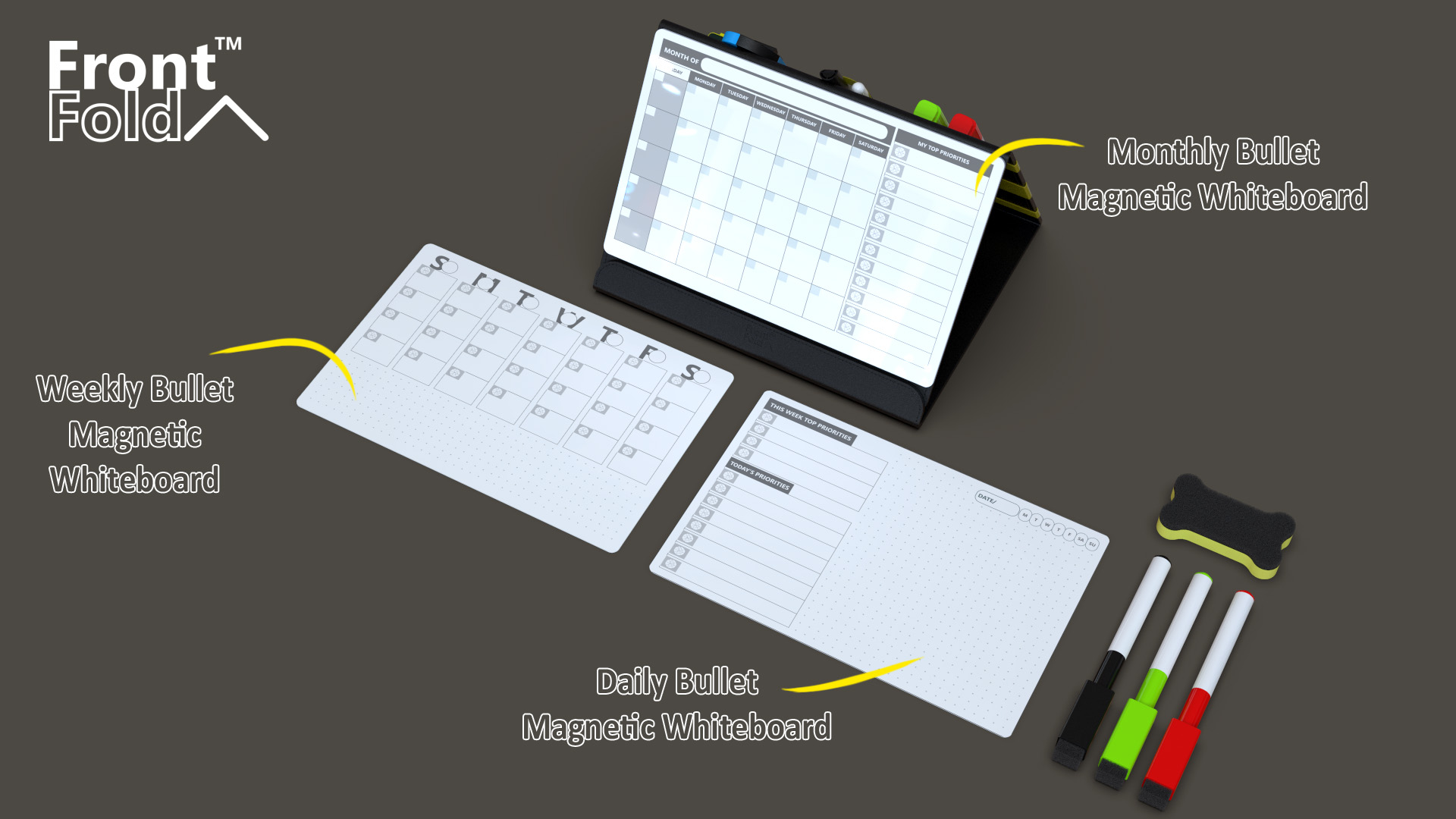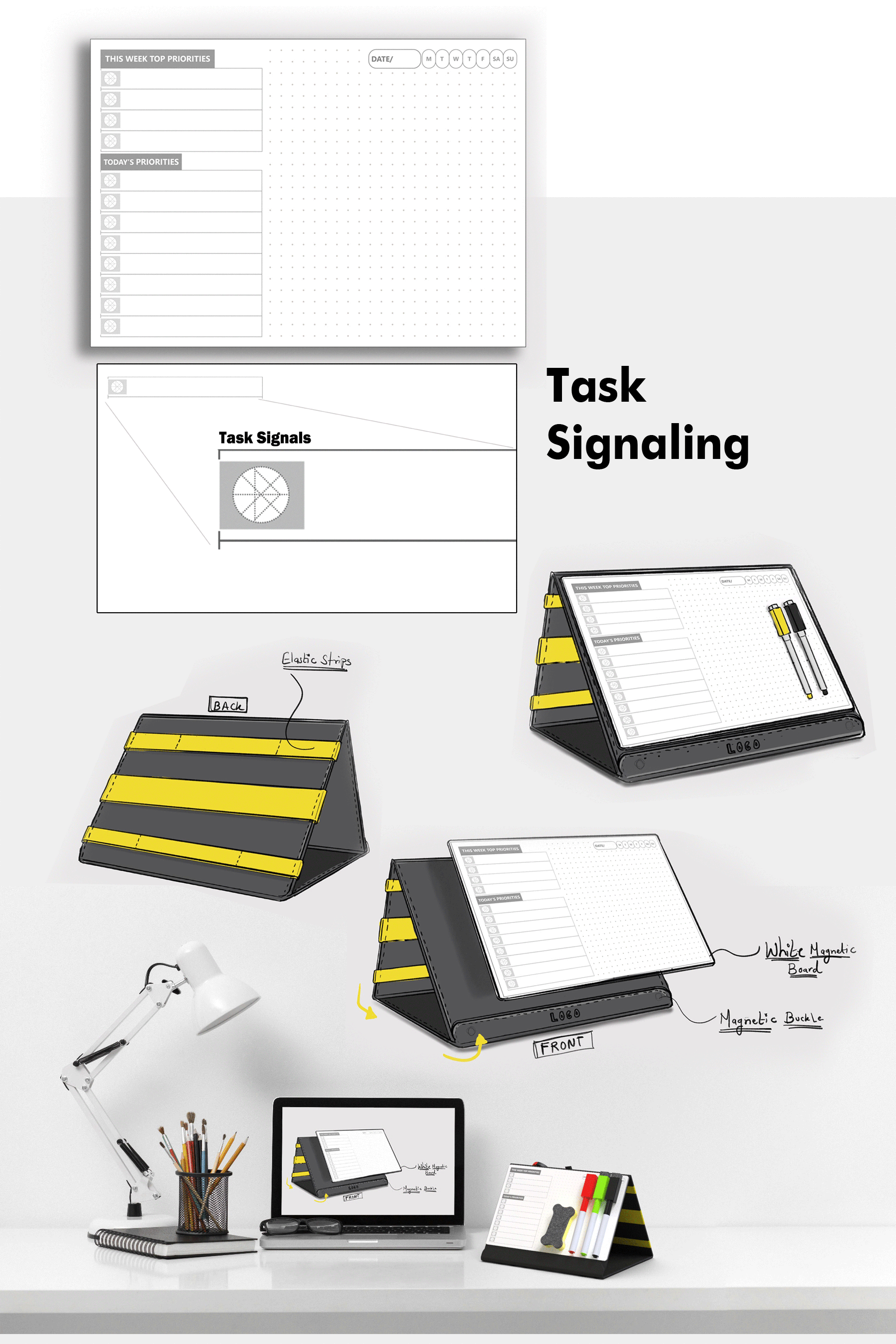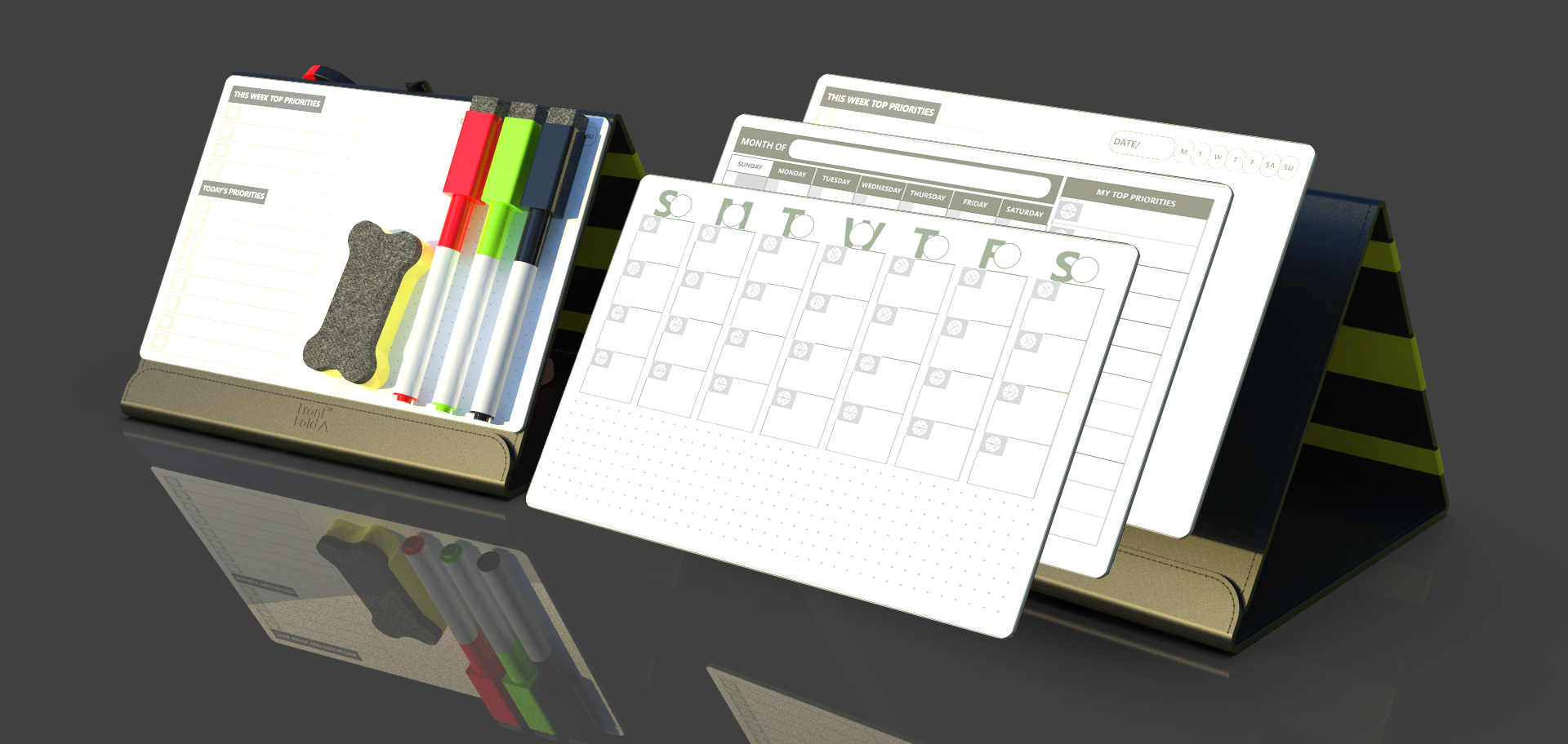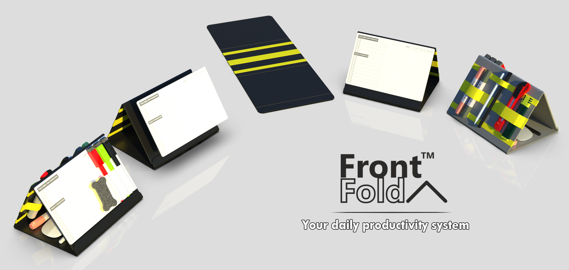 Front Fold is a creative small whiteboard based physical desk fold that companion for your digital tools that helps you prioritize and focus on your daily/weekly/monthly important tasks + Elastic Organizer for your all loose stationery at one place.