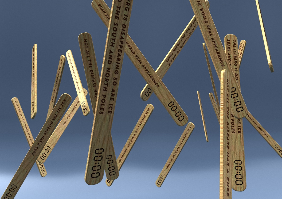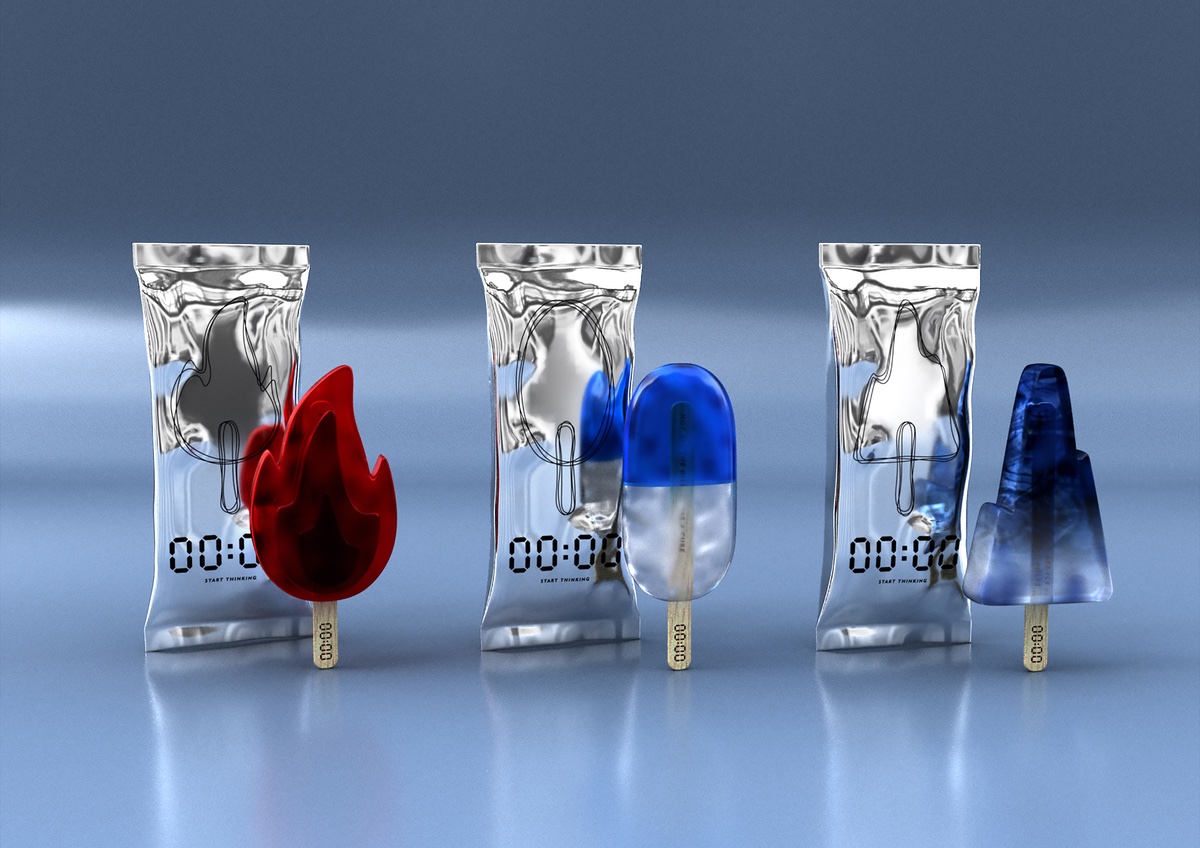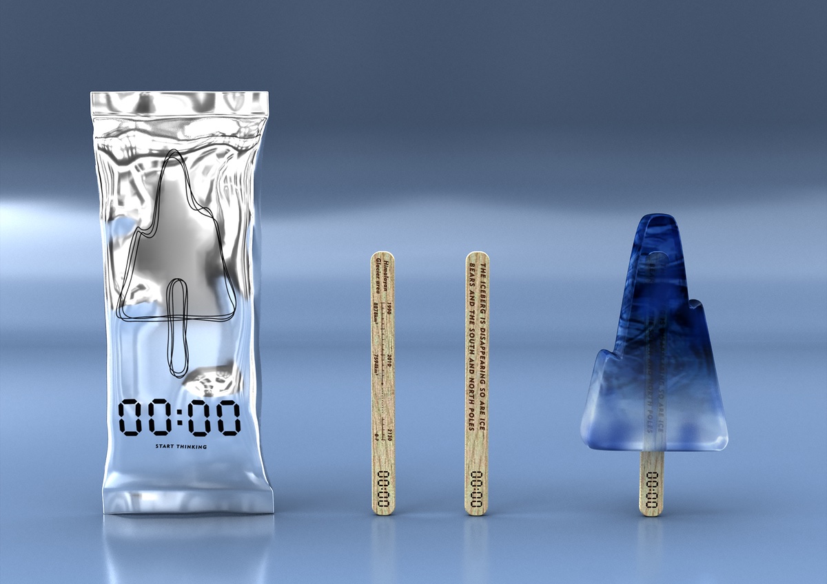 The theme of the "00:00" ice cream packaging design is environmental protection. With environmental issues becoming increasingly prominent, the designers wanted to create packaging that would prompt people to think deeply about environmental issues. The three product shapes refer to three environmental catastrophes: melting glaciers, forest fires, and virus epidemics. Text and date on the ice cream sticks provide current information about the state of the environment, reminding users of the importance of protecting the planet.