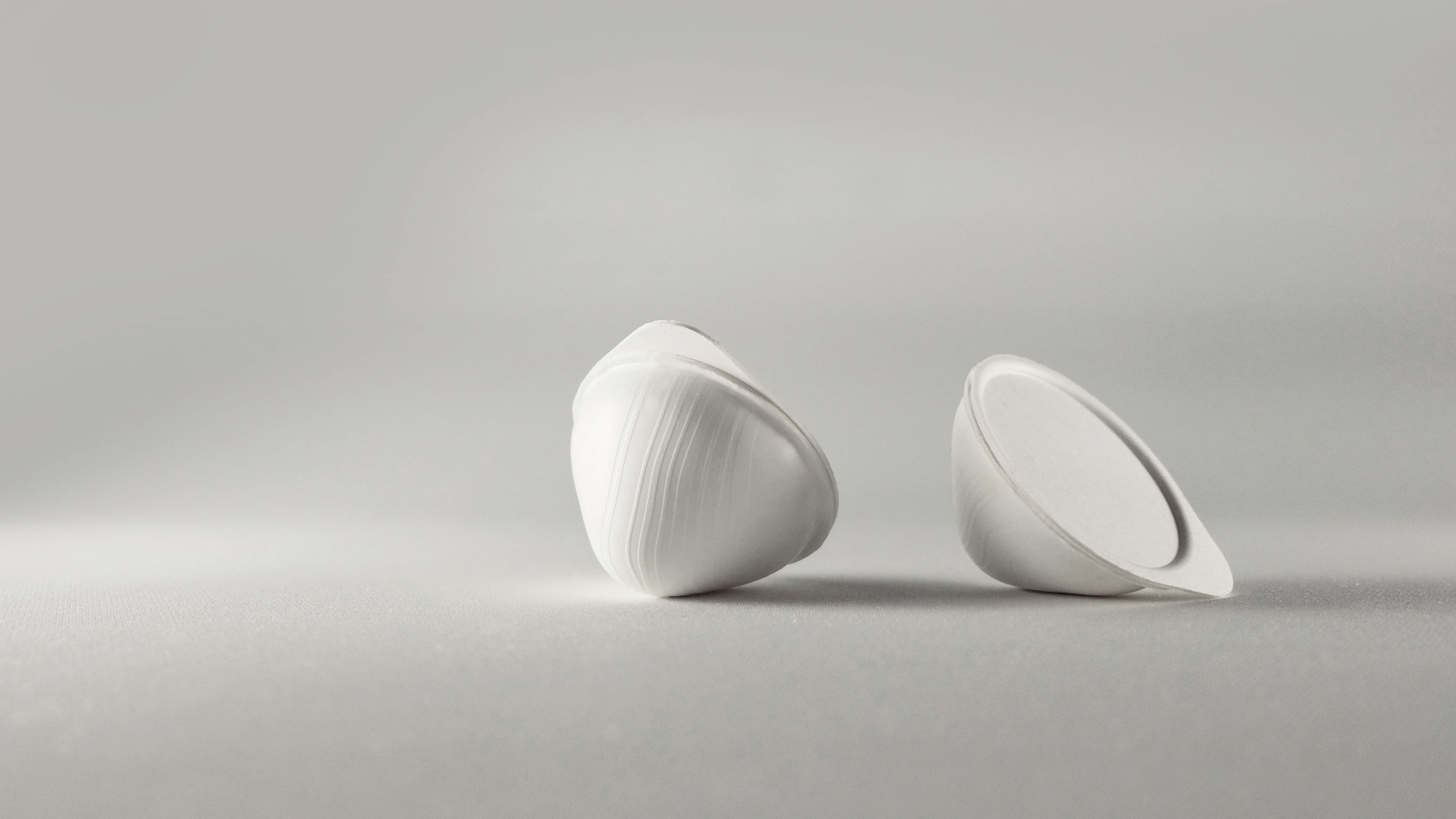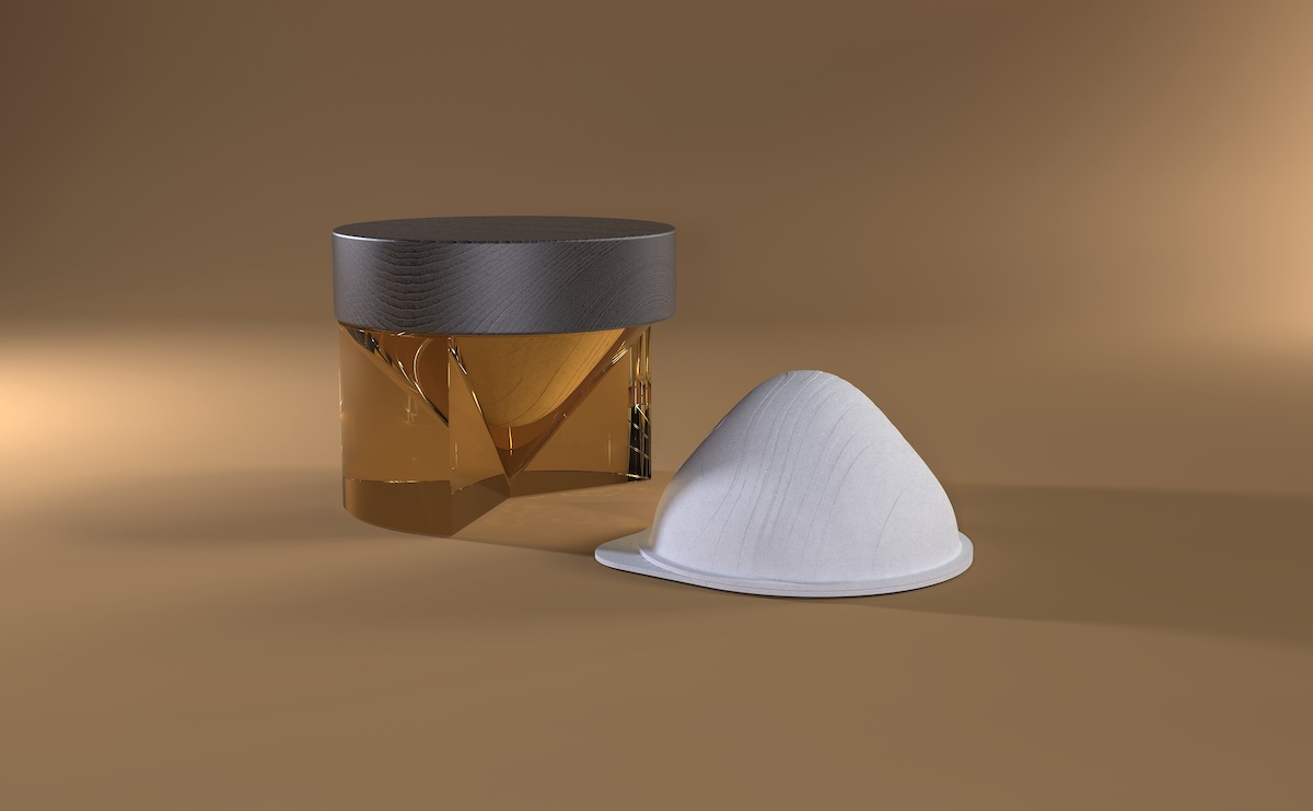 Solution: The physical and conceptual connection to the forest is emphasized throughout the entire product with each component originating from the forest. The prototype is a completely wood-based formable premium packaging solution, with a refill function, that illustrates how packaging which are usually made from plastics can be made from sustainable materials. The design of the container mirrors the shape of the pod, creating a visual comparison of the materialistic qualities of each component. By leveraging the refractive quality of the outer packaging you can enhance the details on the container within.
