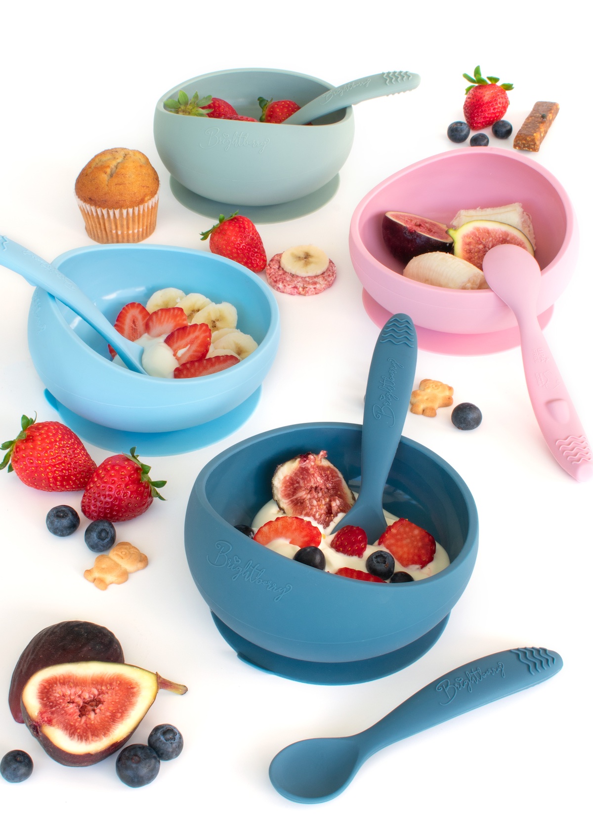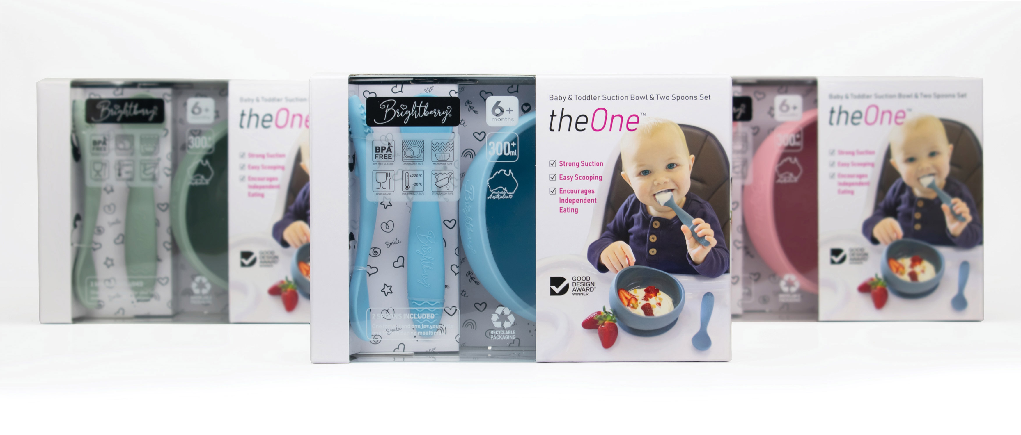 theOne™ Bowl Set from Brightberry is ideal for feeding babies and toddlers. Designed in Australia, this silicone suction bowl offers a raised edge & inwardly curved walls that make it easy to scoop food and encourages self-feeding. Combined with two ergonomically designed spoons that double as teethers, parents can avoid mess, promote independence, encourage learning and ensure safety.
