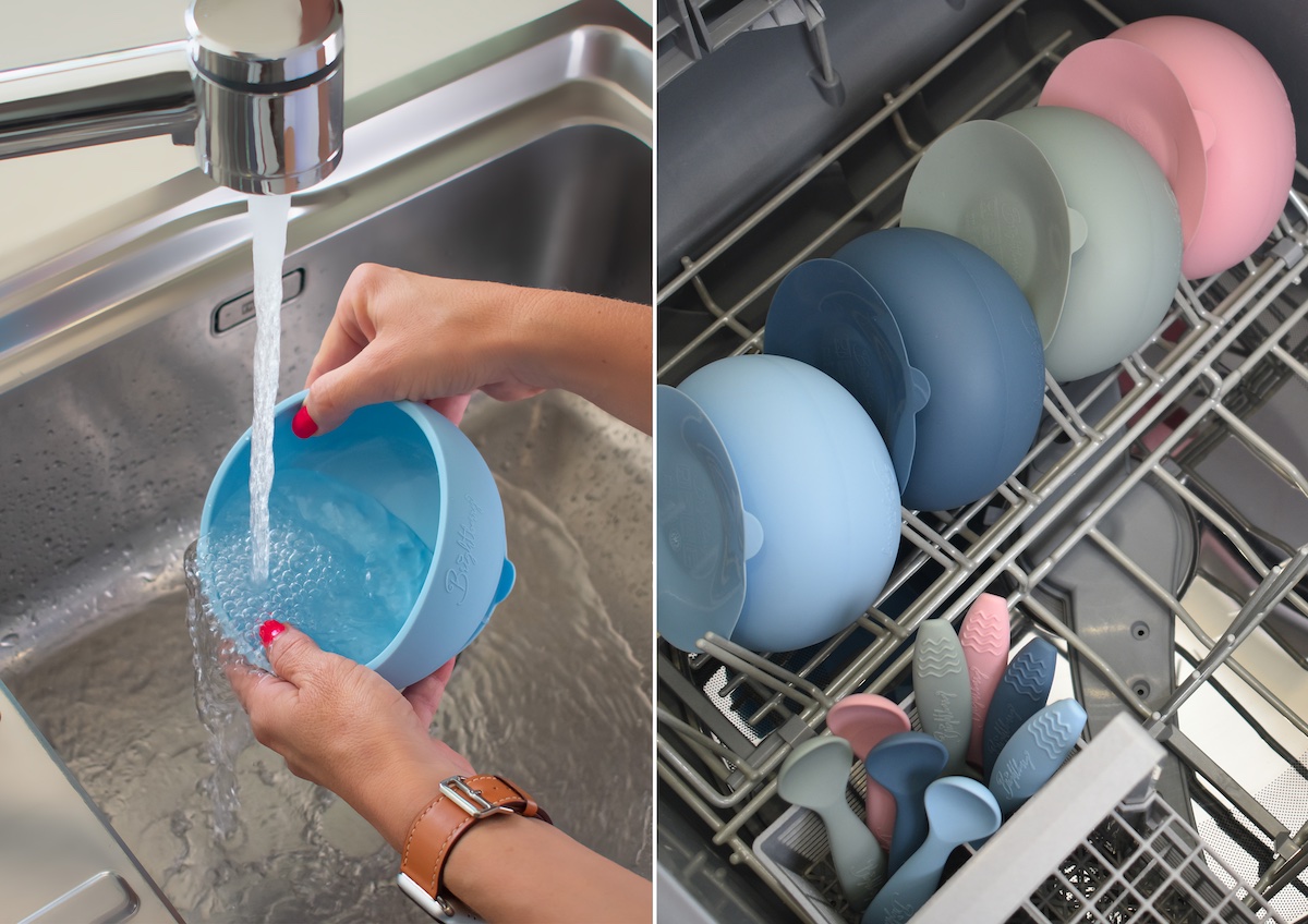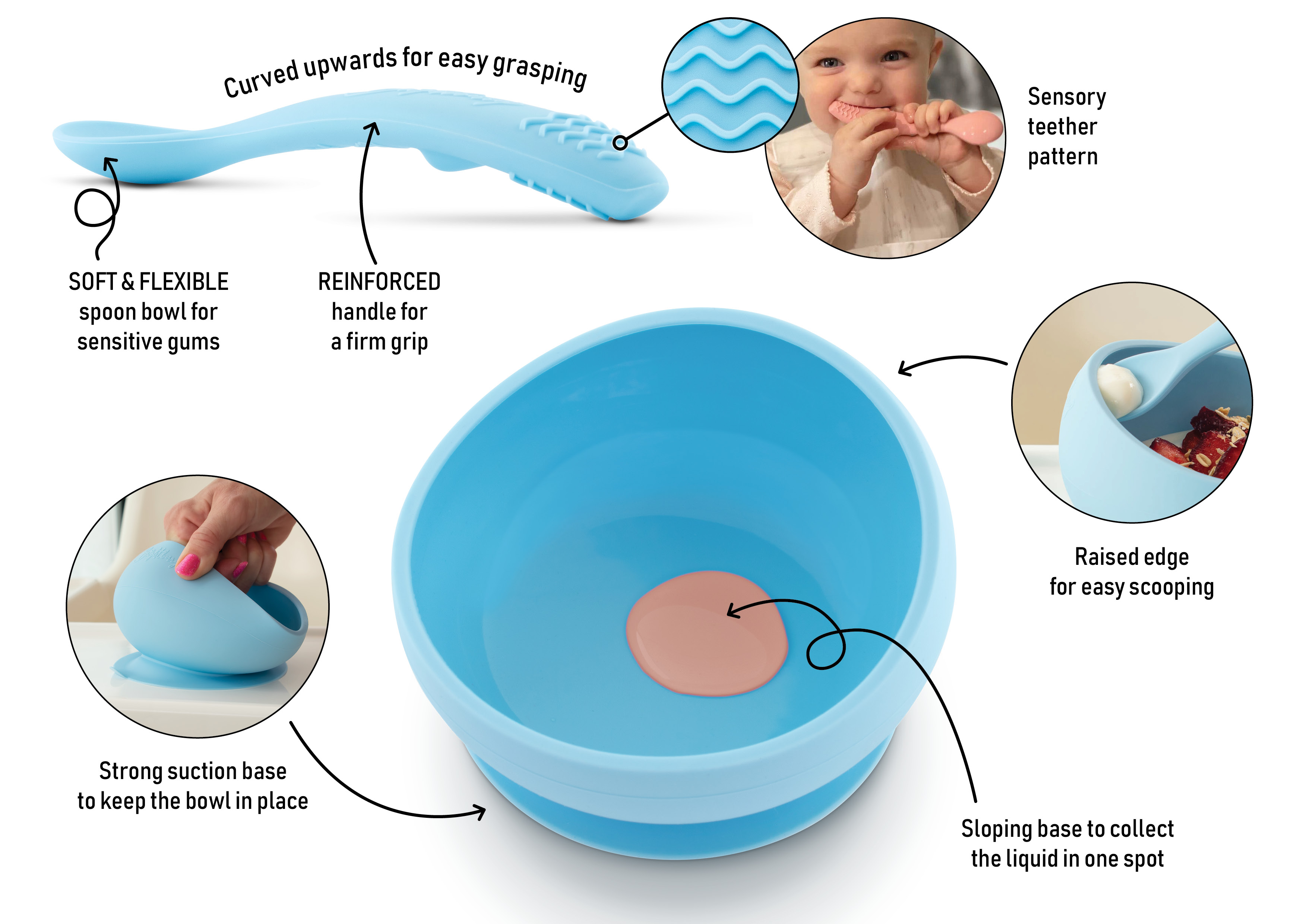 theOne™'s bowl firmly sticks to all common surfaces, including high chairs using a strong suction cup with a high volume-air displacement. The raised edge and inwardly curved walls help to scoop food onto the spoon without spilling over the edge. The bowl and spoons are silicone, which is non-toxic, child-safety standard compliant, lasts a lifetime, and dishwasher, freezer and microwave safe, unlike plastic which deteriorates and can leech chemicals. Unlike other bowls, theOne™ isn't built with multiple parts that trap food in between ridges. Our bowl is made as a single piece with curved walls that makes scooping food easy and cleaning simple.