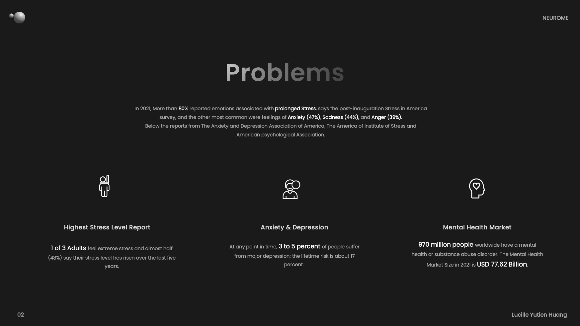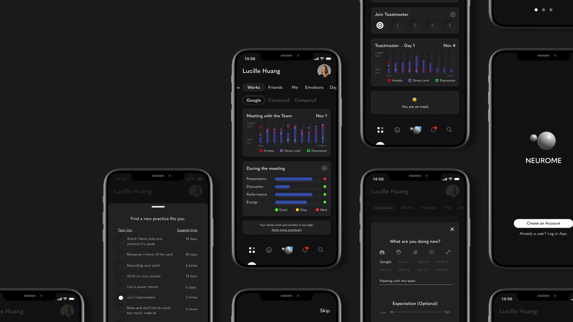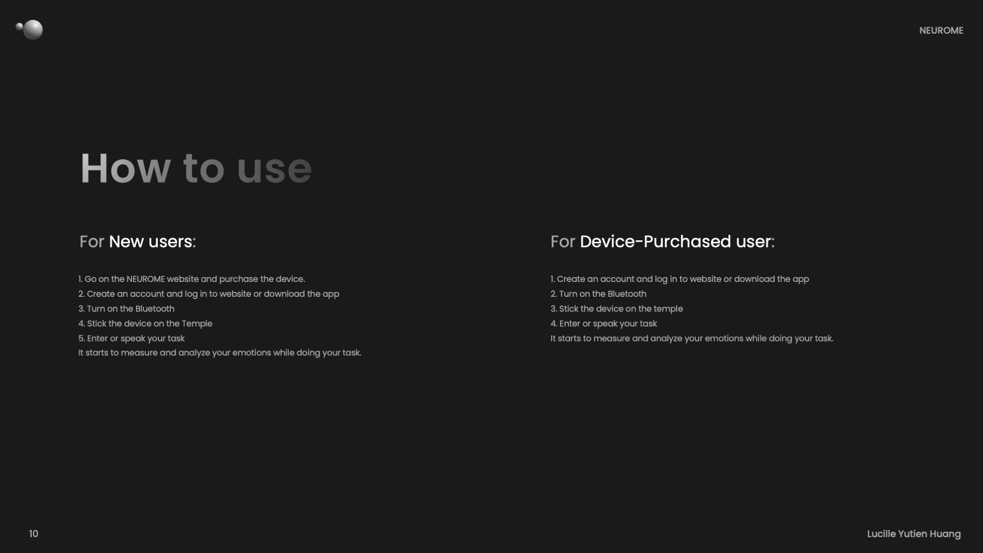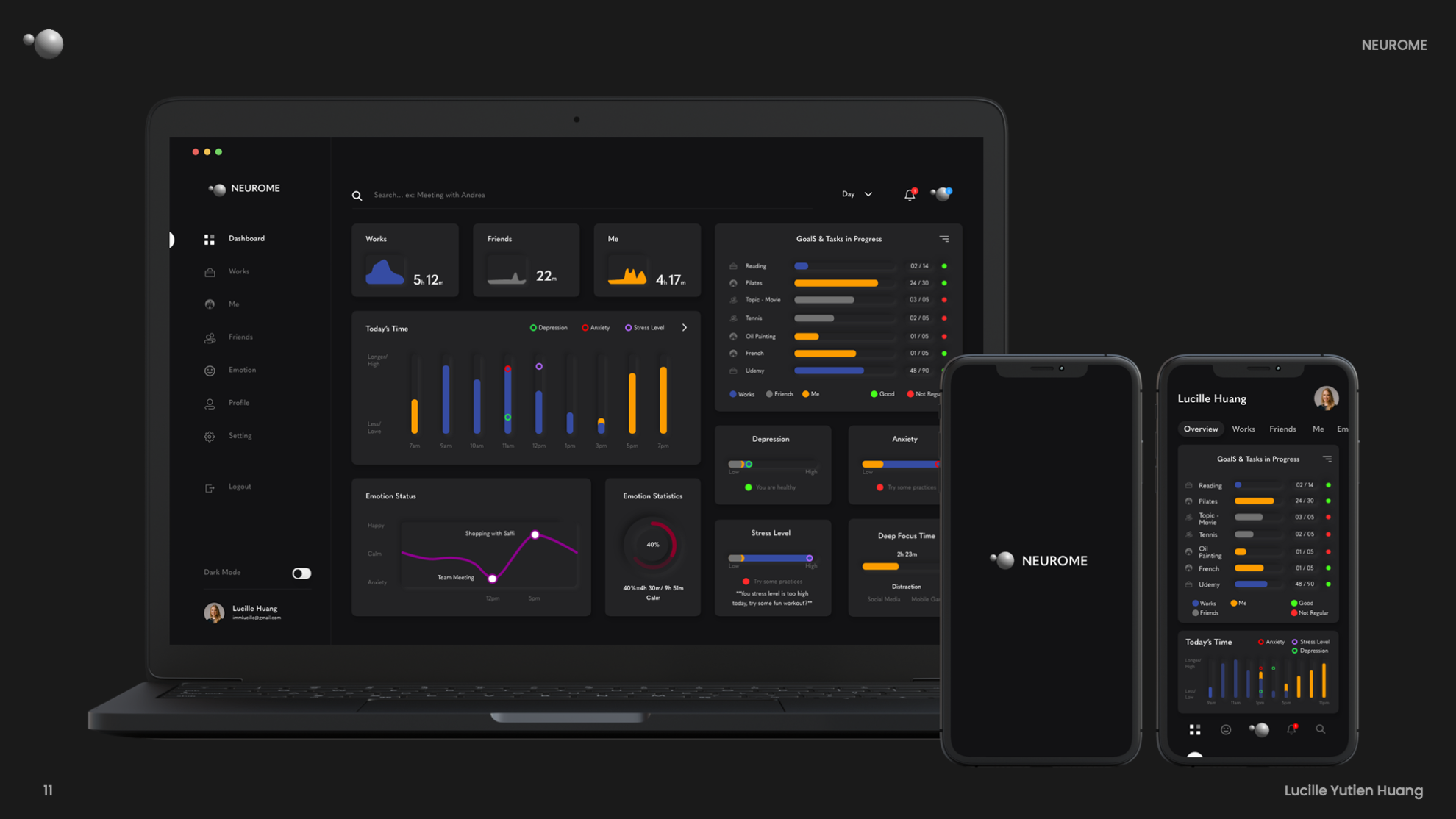 NEUROME is a conceptual, combined dashboard-style software and a device-based EEG that detects users' emotions, behavior, and stress levels, intended to seamlessly integrate with technology and re-explore tasks as a trigger for reducing people's stress levels and discovering their happiness.