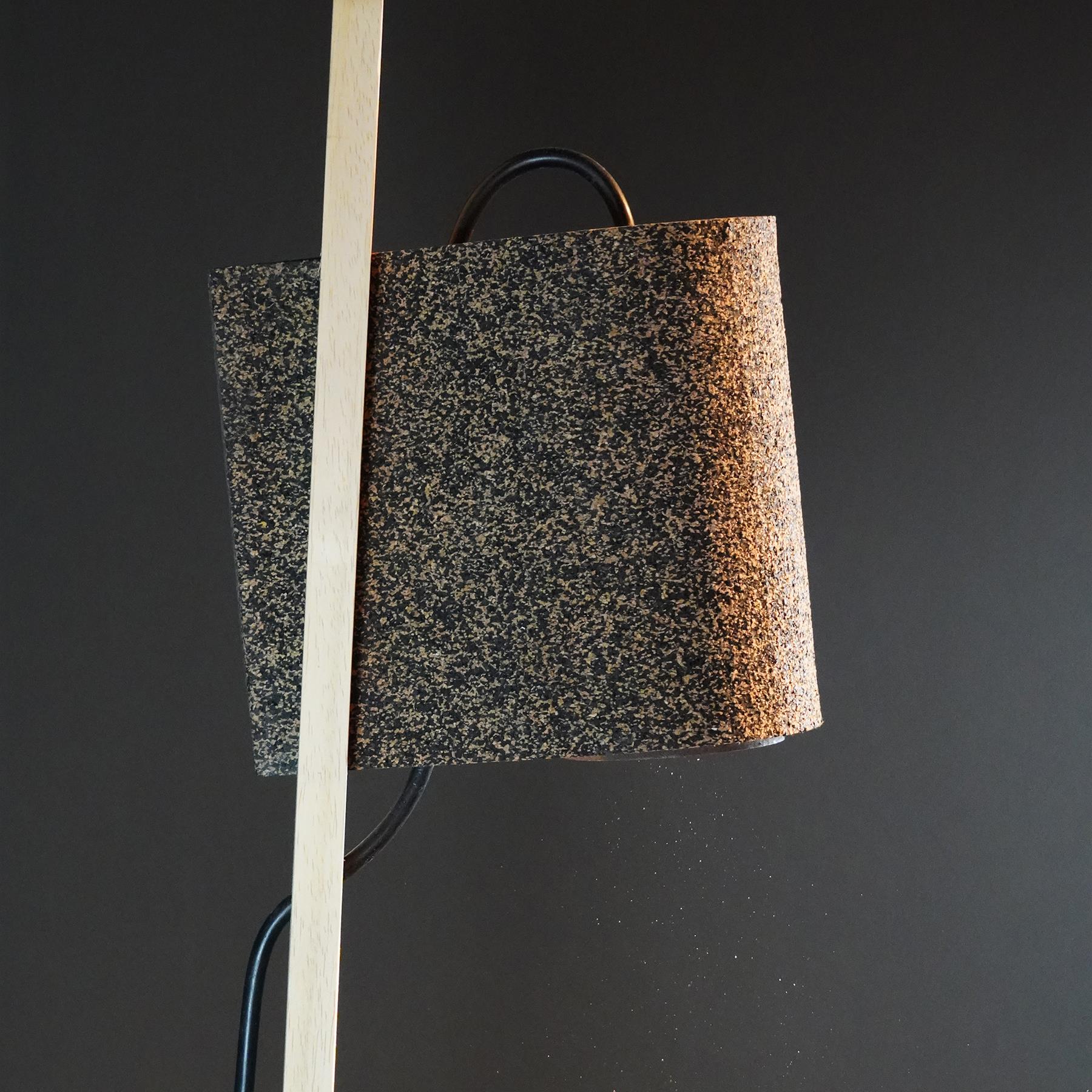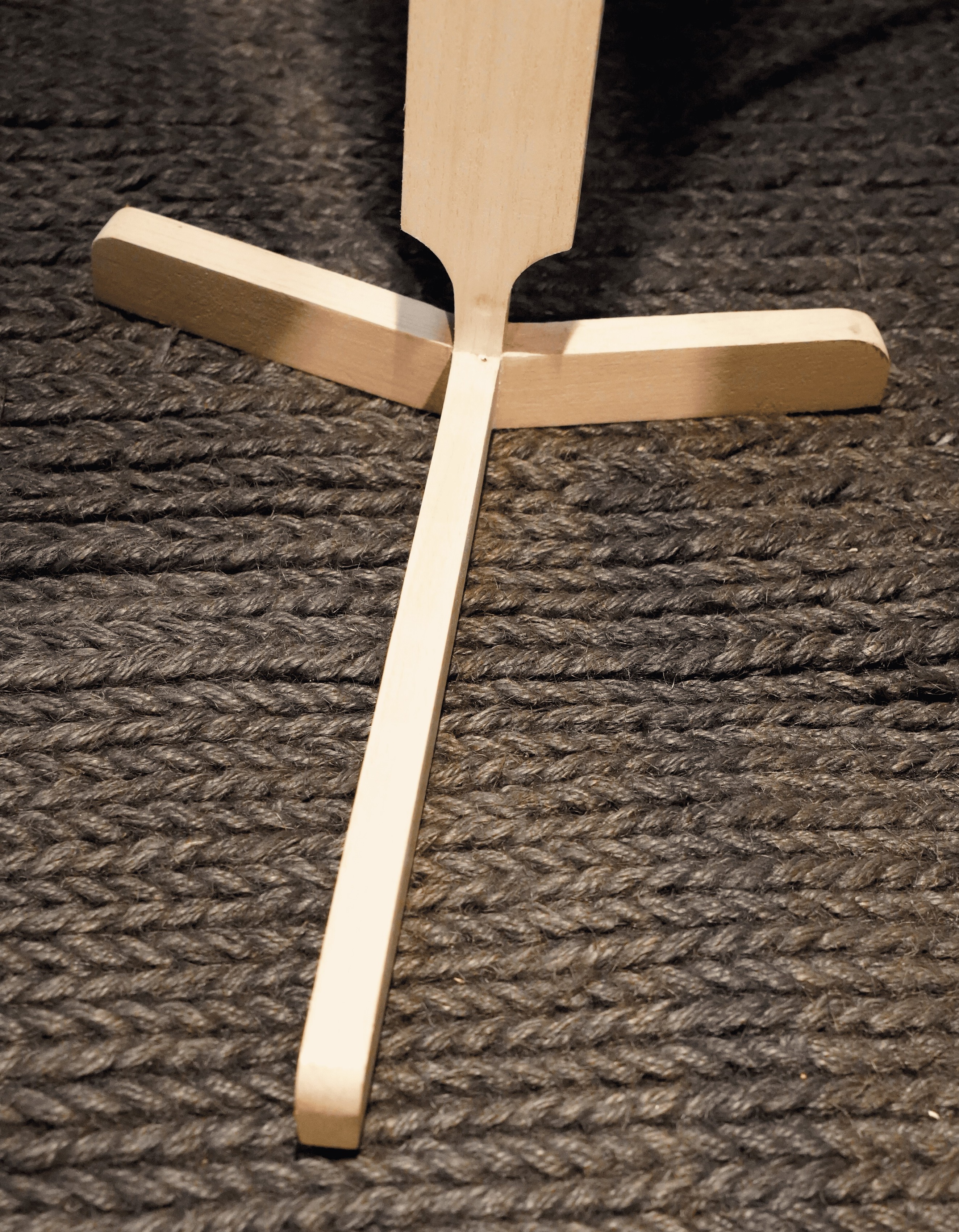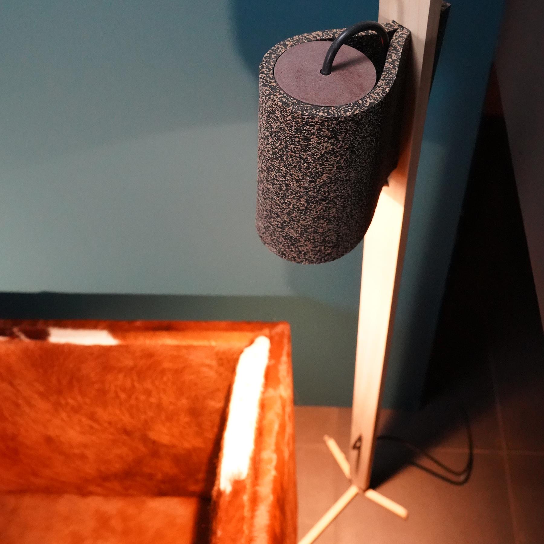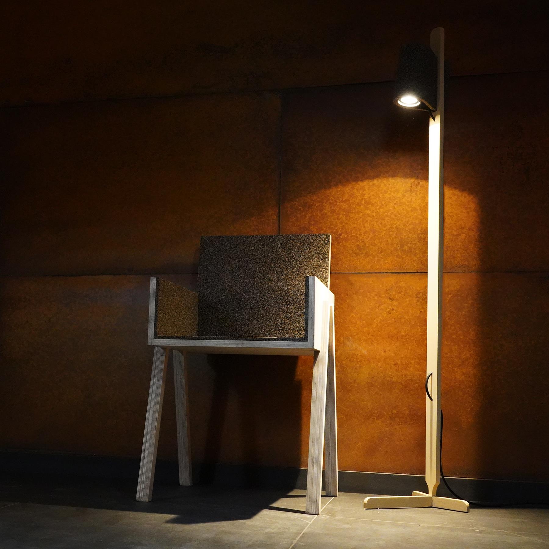 With lighting you usually get an electricity cable that needs to be integrated as elegantly as possible one way or another. It was decided not to hide it, but to use it in the aesthetic aspect. The cable disappears through a hole to the back but returns with a little jump to the front. This way it is nicely guided downwards and the visually long-looking wooden leg gets 'broken' and upgrades it.