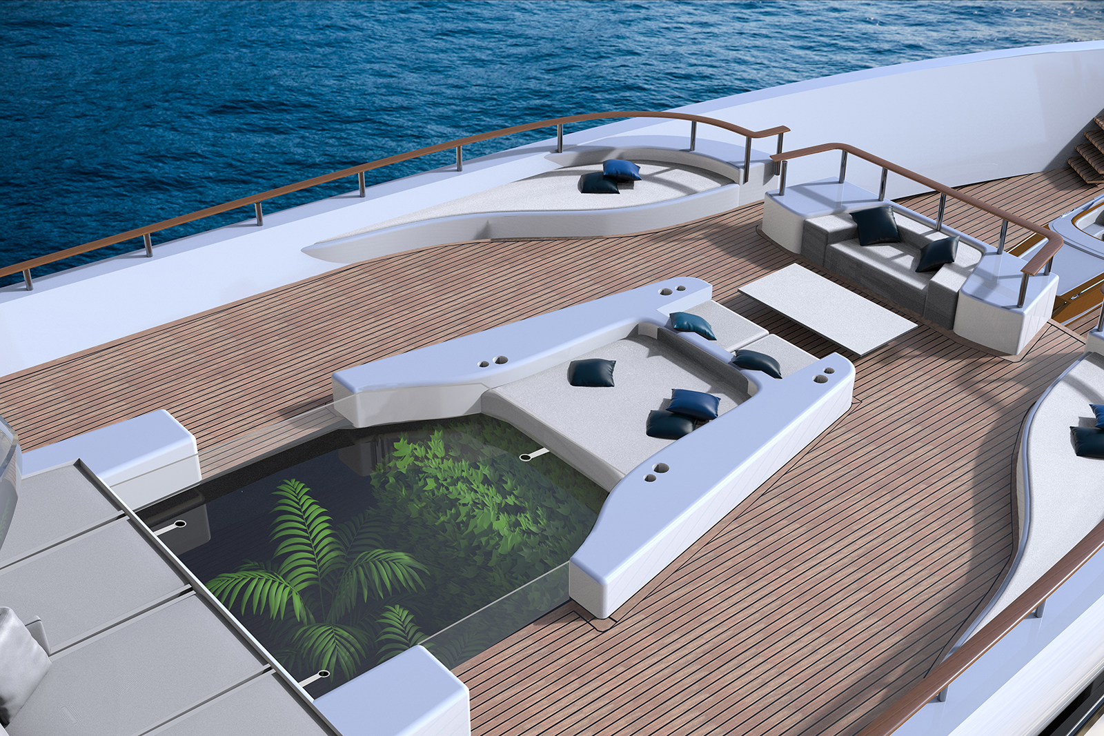 The interiors are made of essences and they are brightened by the constant presence of the natural light. On the main deck, in the exterior area of the bow, there are sofas and relax areas; they surround a small garden closed by glasses. On the top of the glass, there are some small holes allowing the air goes through that are possible to close while the boat sails. The garden then is inside the owner’s cabin, and the water will be drained out of the boat by downpipes. Inside m/y ARIA, the nature becomes the focus, where interiors are made of essences, plants, woods and natural recycled fibers.