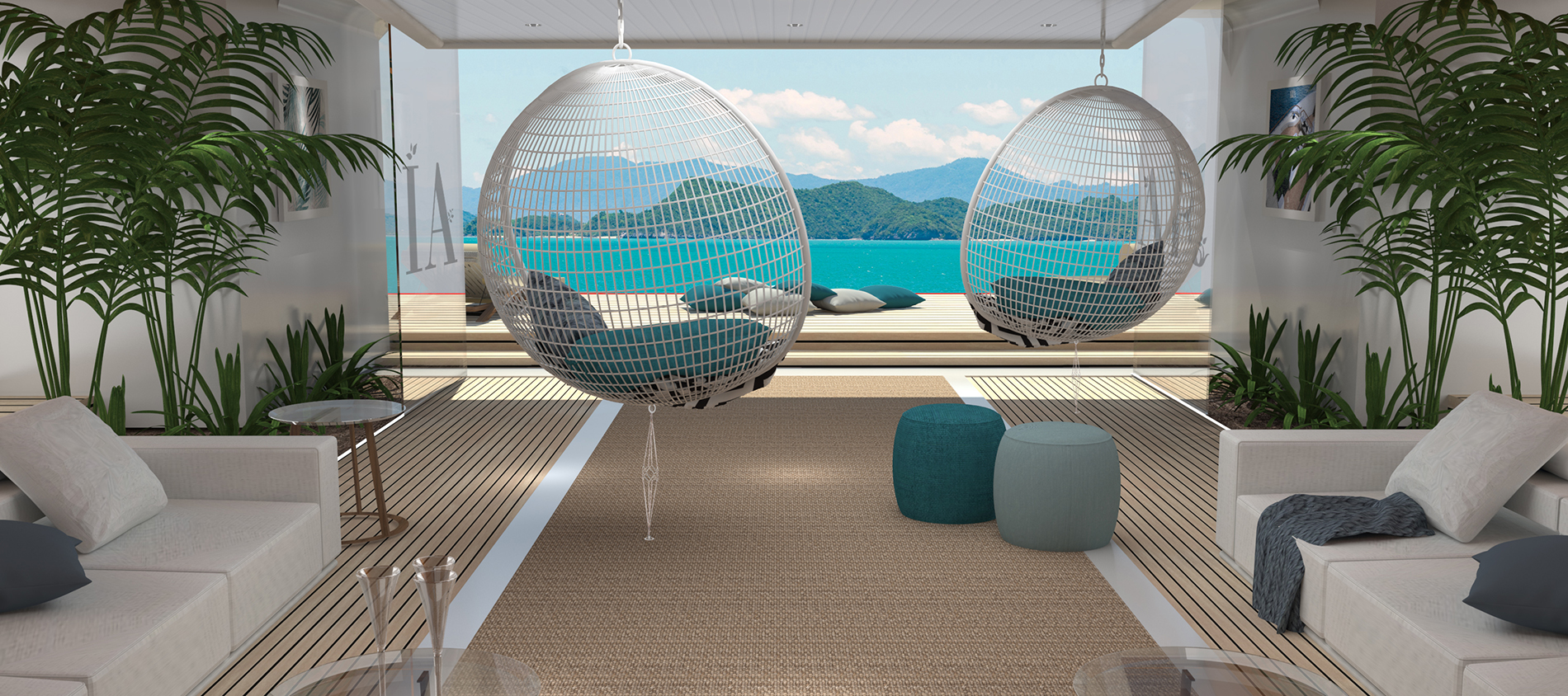 The beach club and the all of the stern on the lower deck, is a huge space mainly brightened by natural light. The interiors are made of wood planks and fiber carpets that are perfect to design a wellness area where it is easy to relax, watching the amazing landscape around the world.